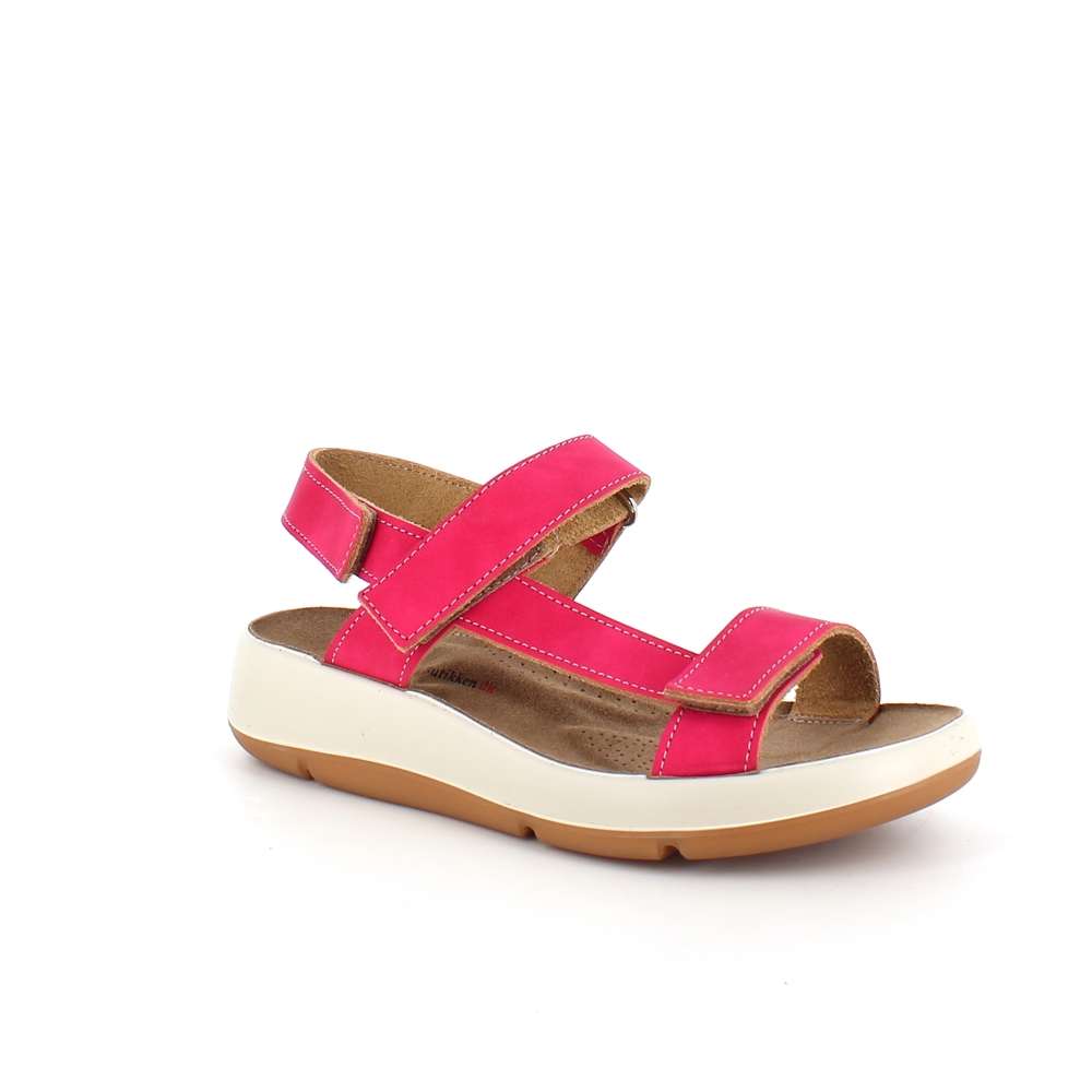 Pink skindsandal med tre justerbare remme og svangstøtte