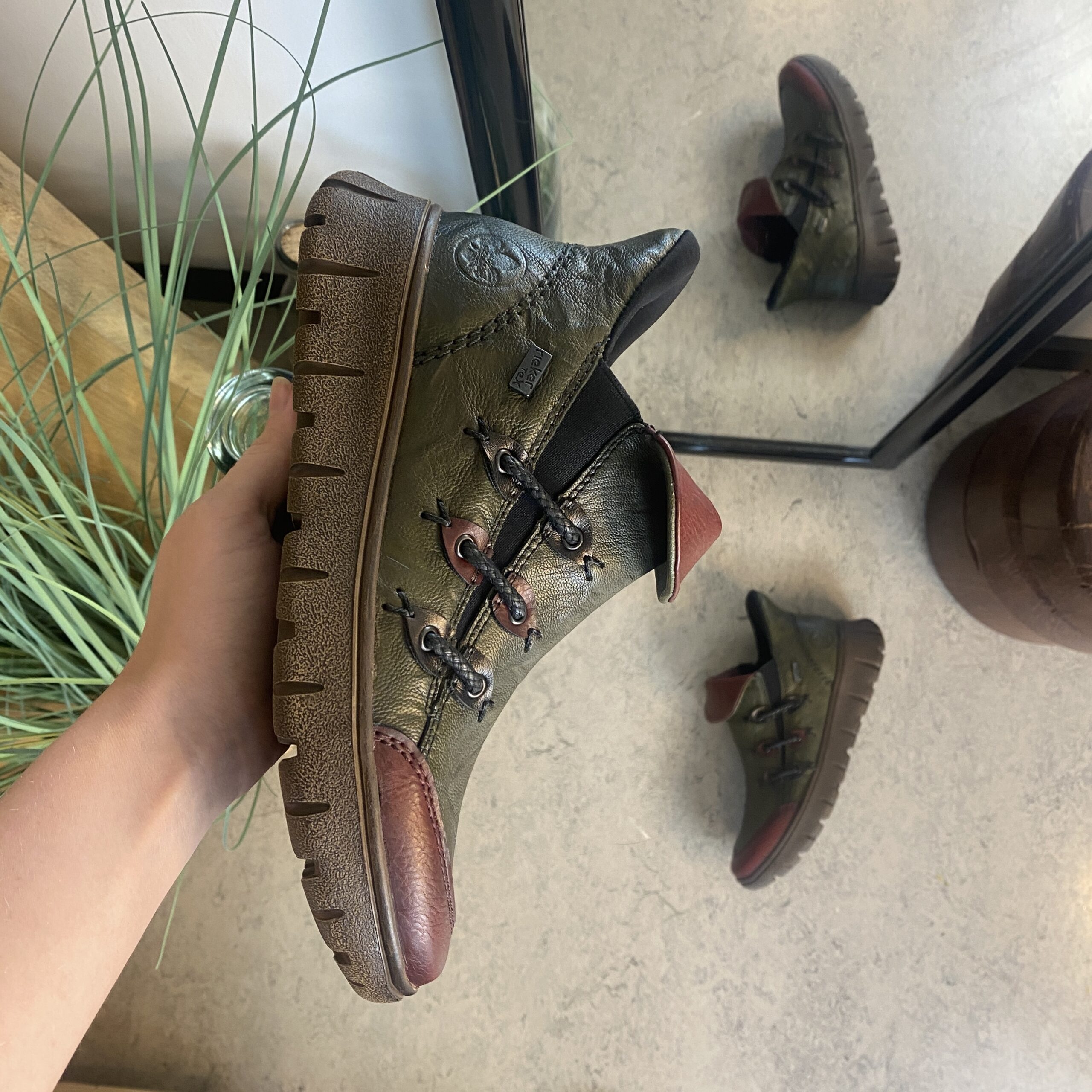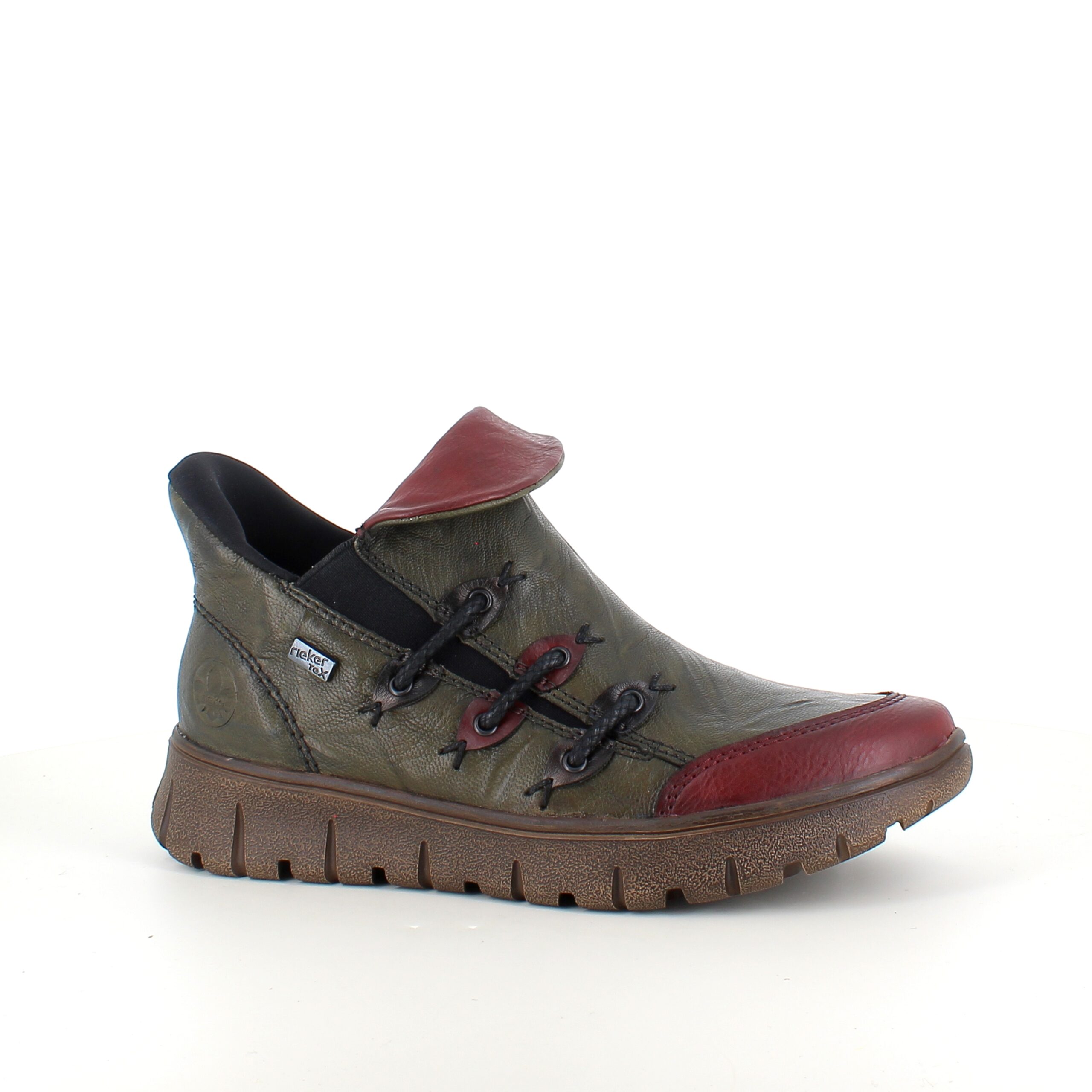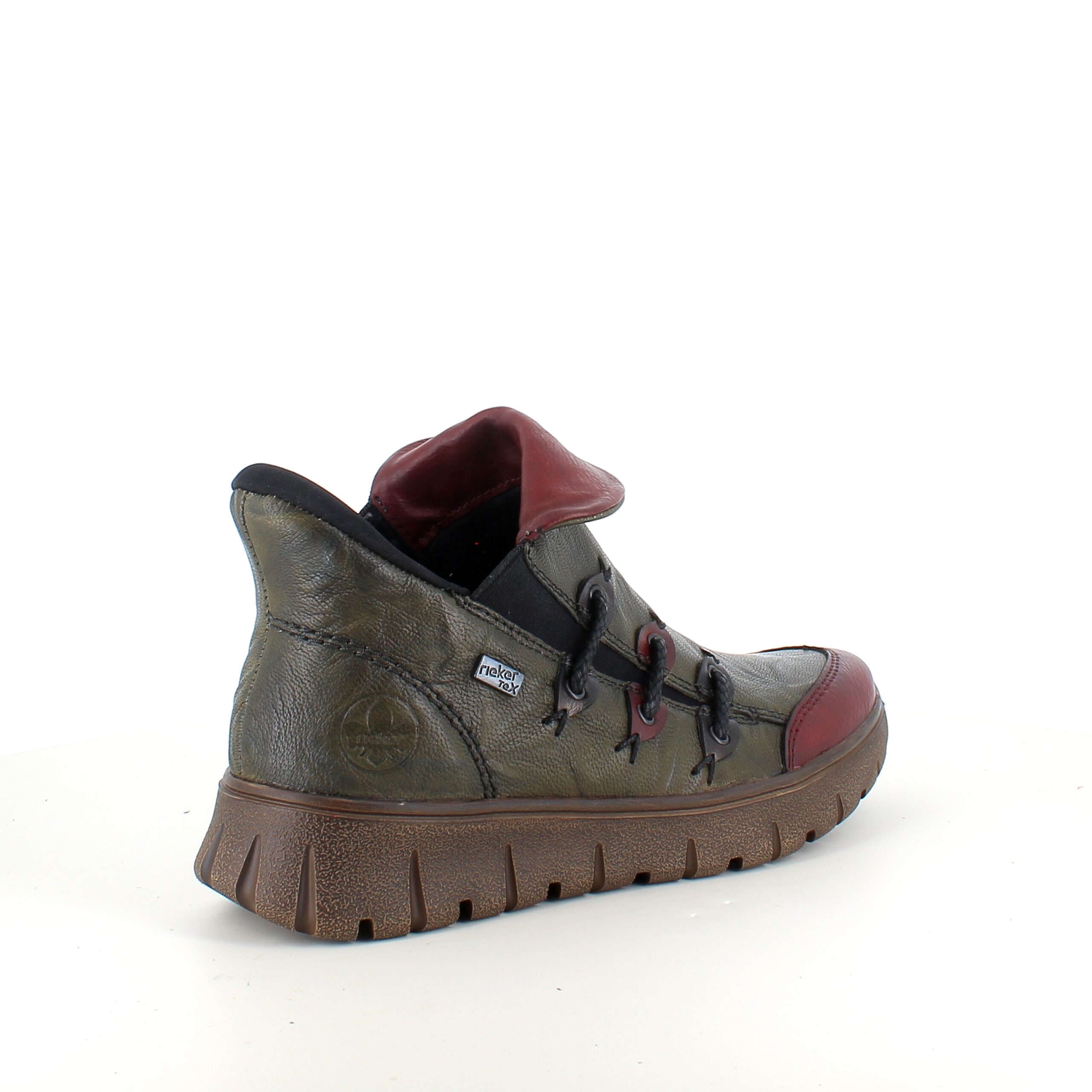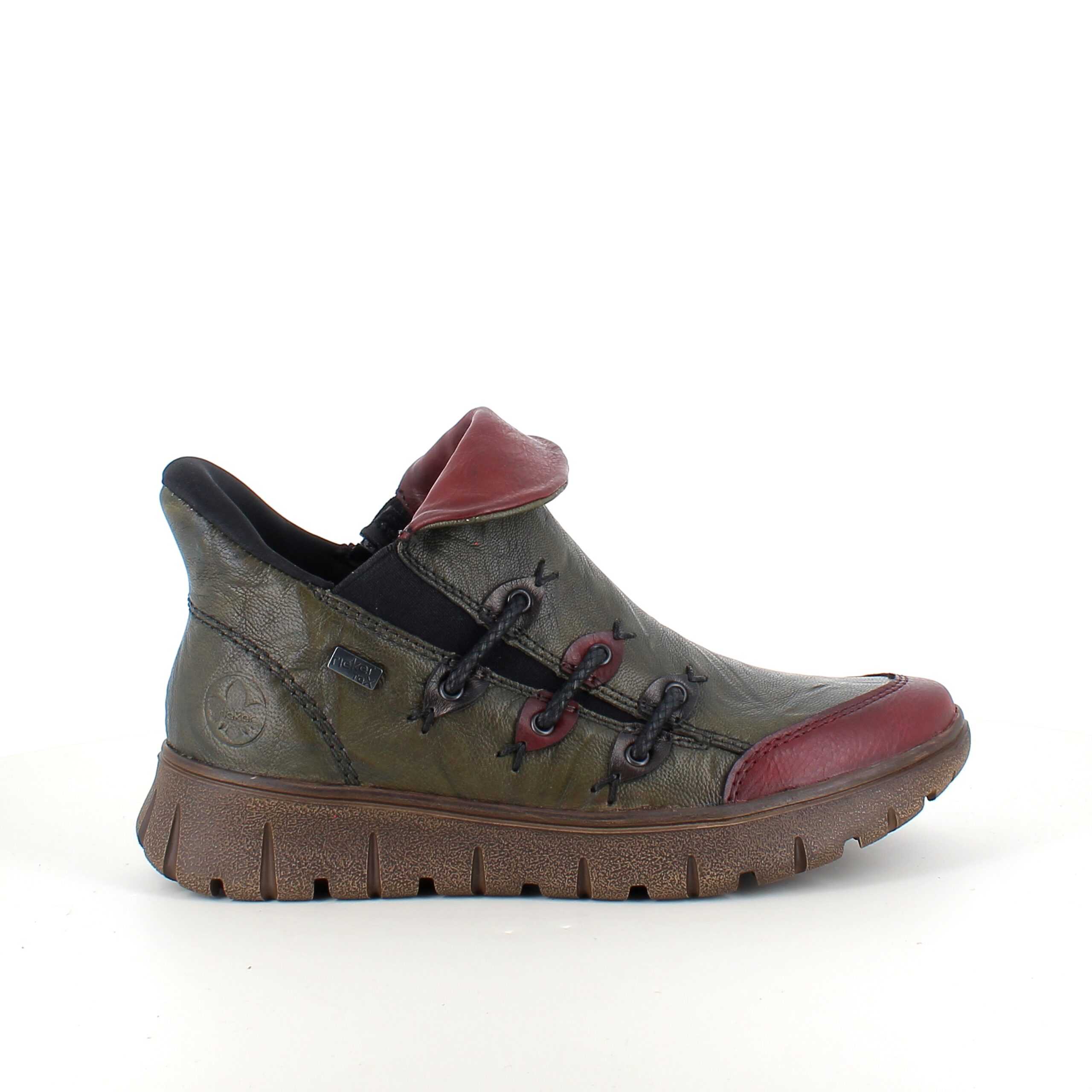 Denne smarte Rieker støvle er lavet i en farvekombination af grøn og vinrød.
