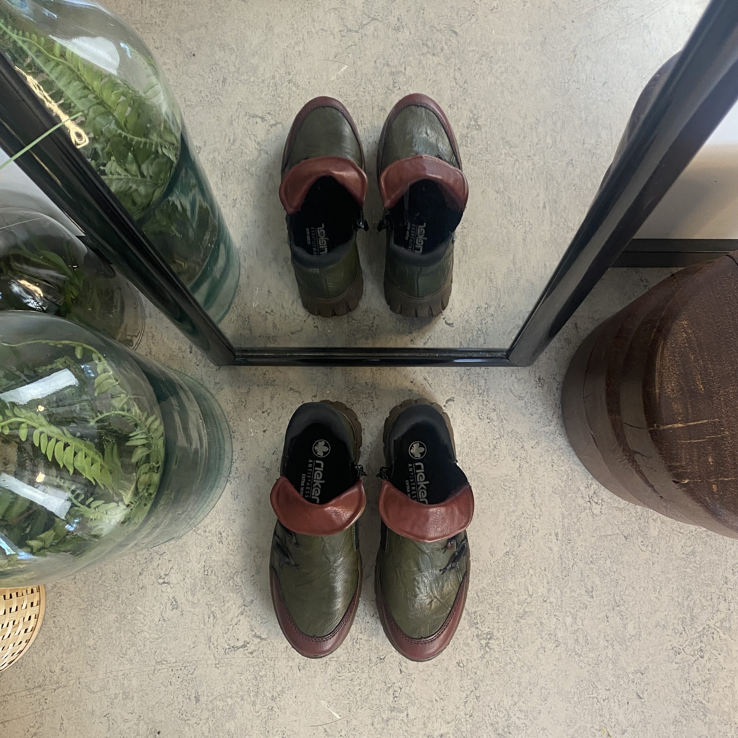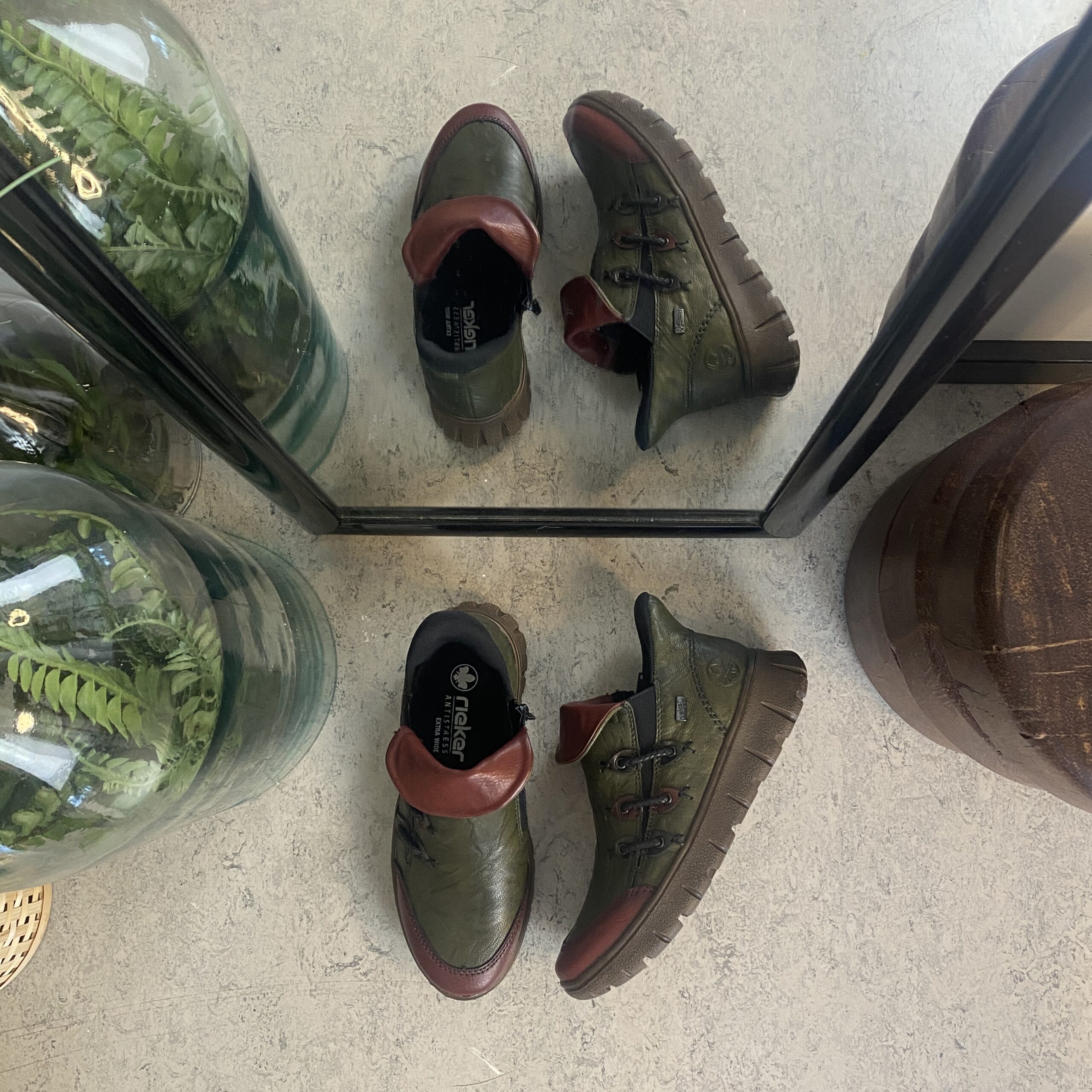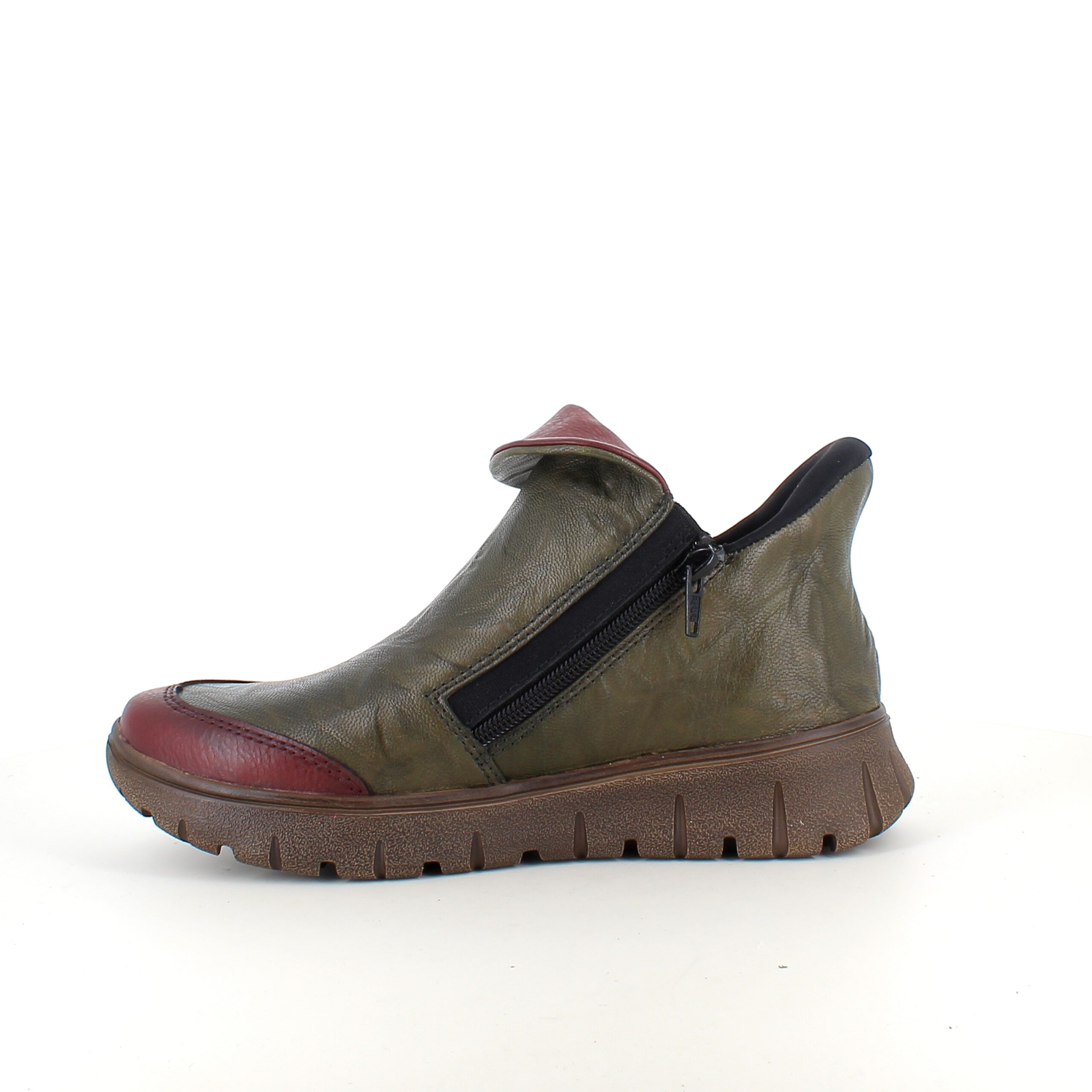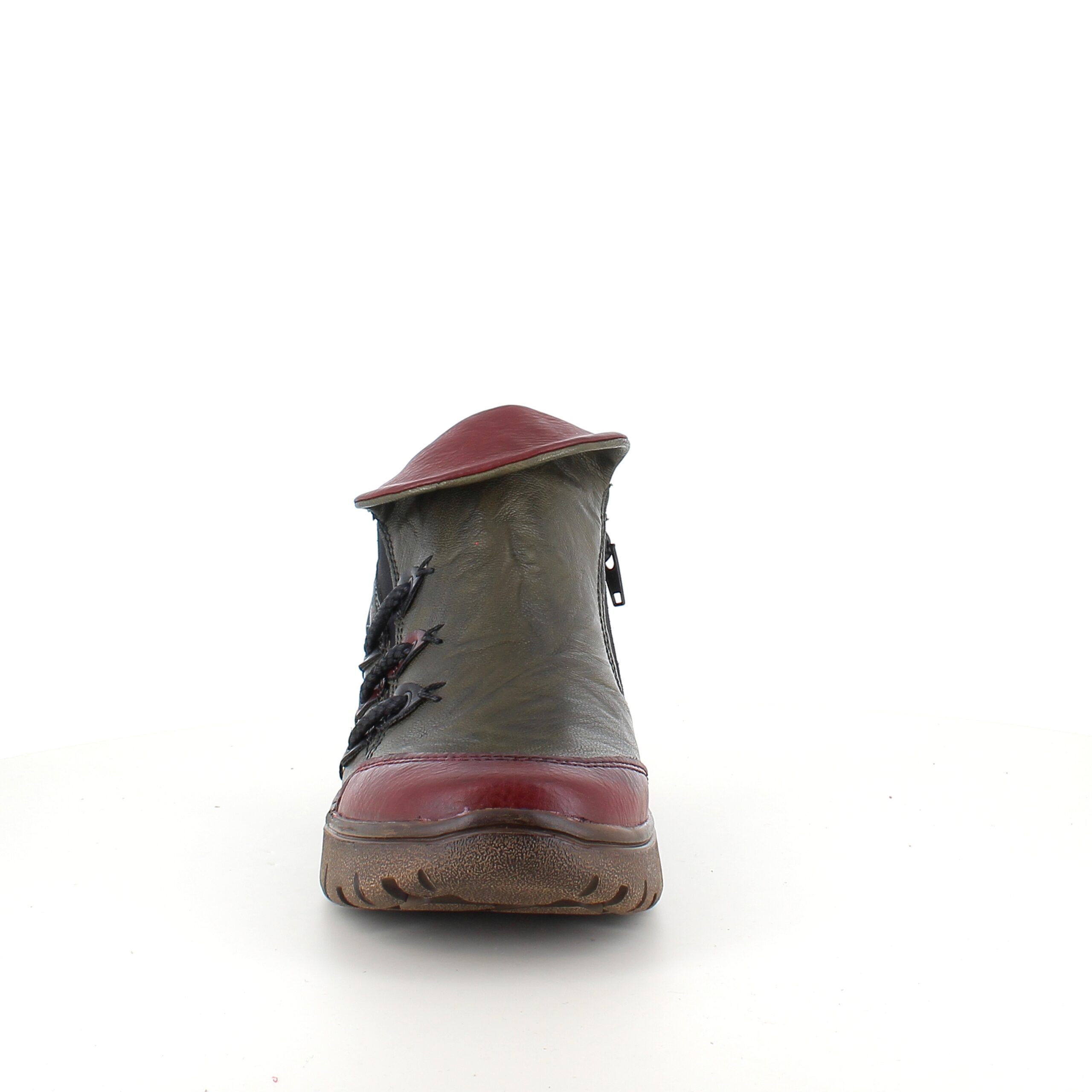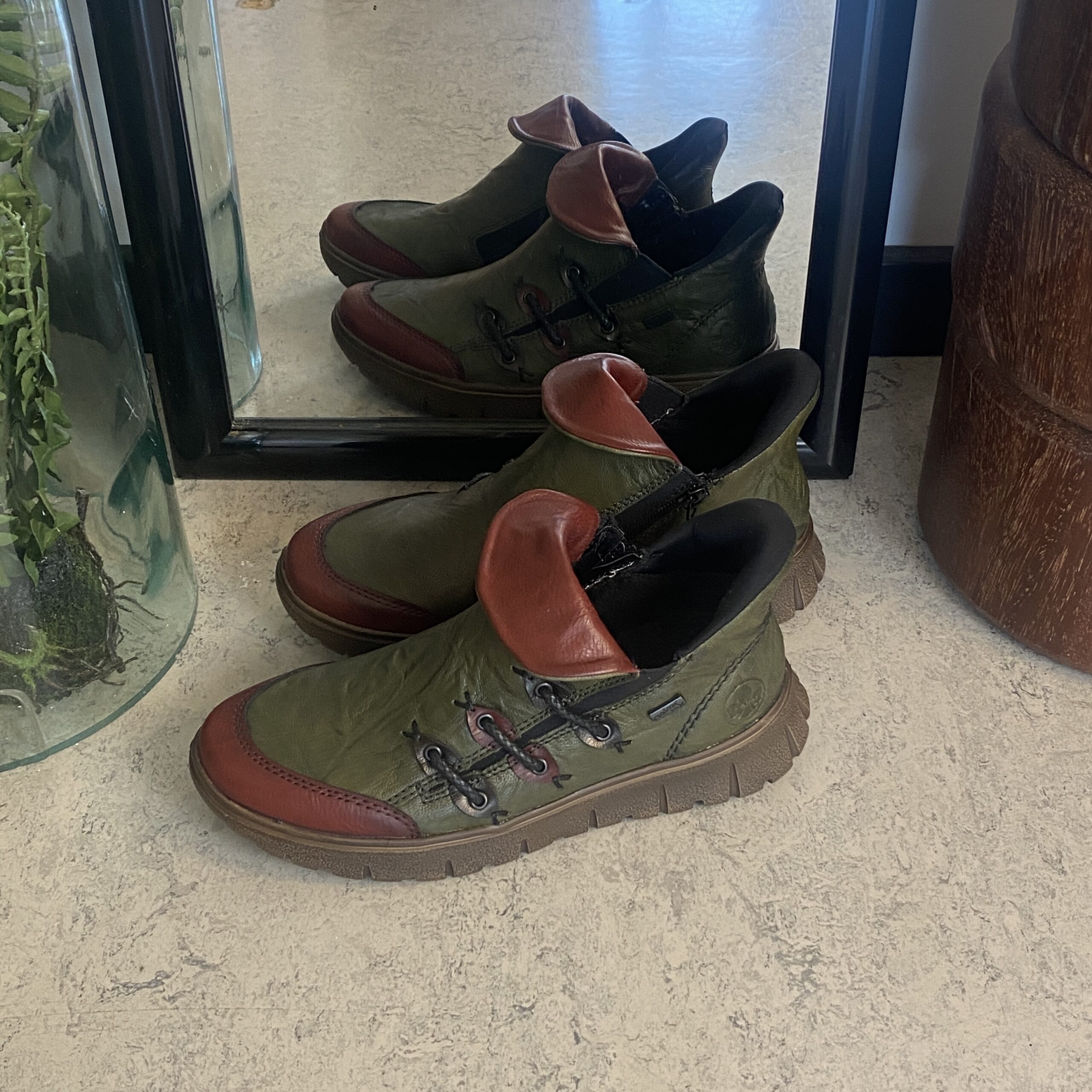 Denne smarte Rieker støvle er lavet i en farvekombination af grøn og vinrød.