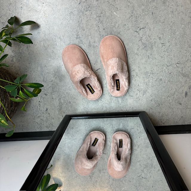 Rosa hjemmesko med synlig pelskant