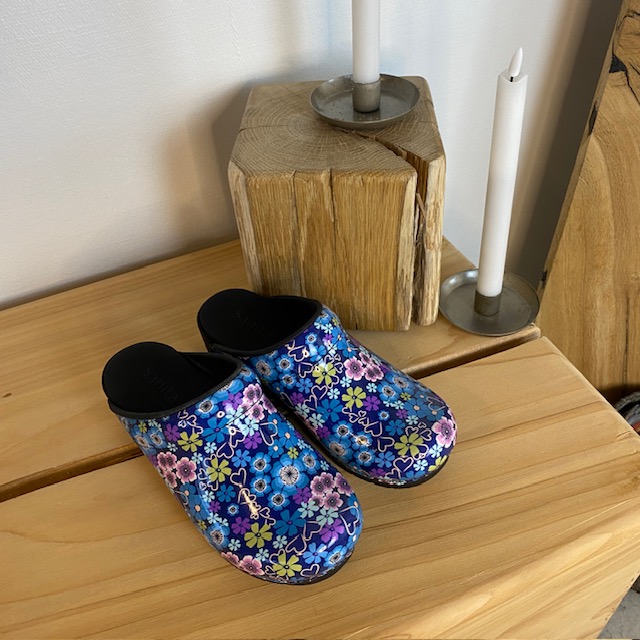 Sanita tøffel-træsko med blå og lilla blomster