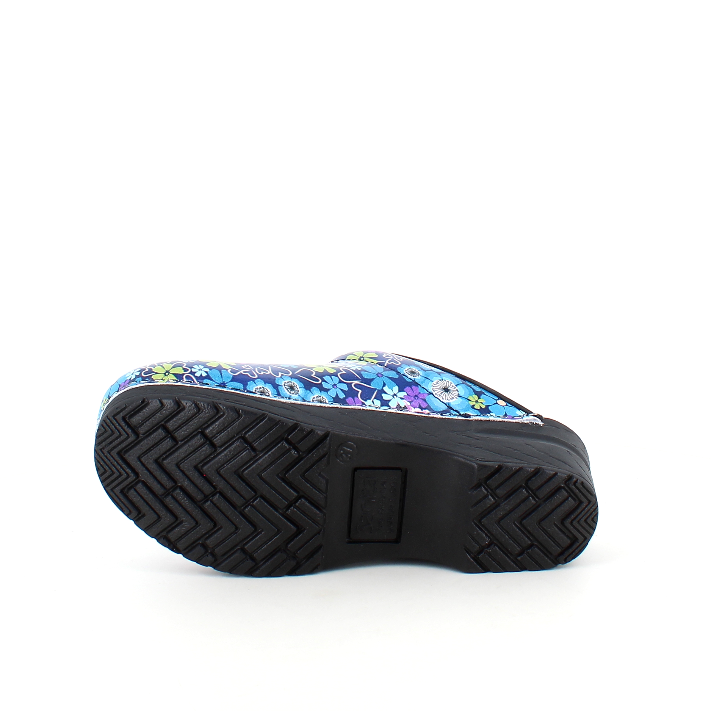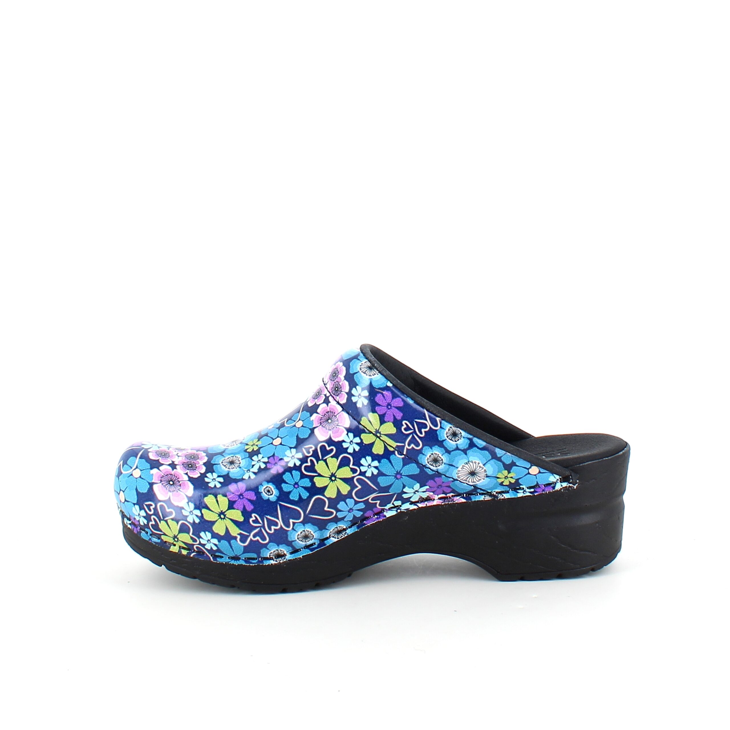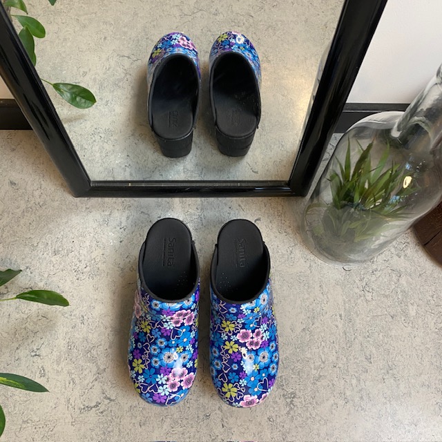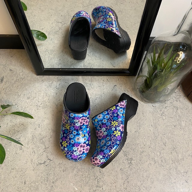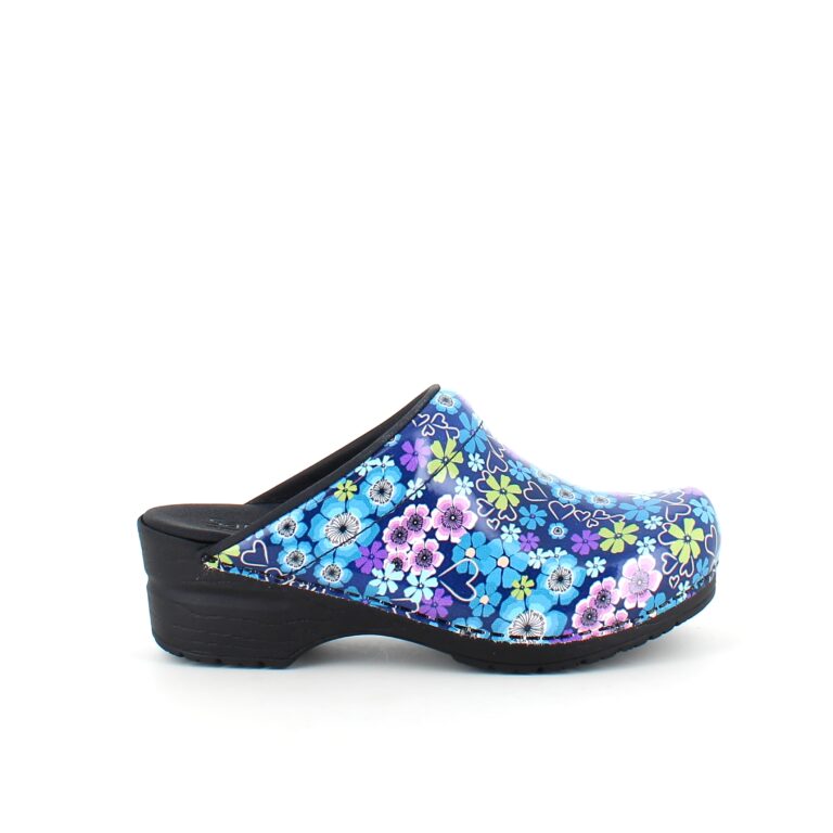 Elegant og komfortabel tøffeltræsko i et flot blå og lilla blomstret træsko i printet lak læder.