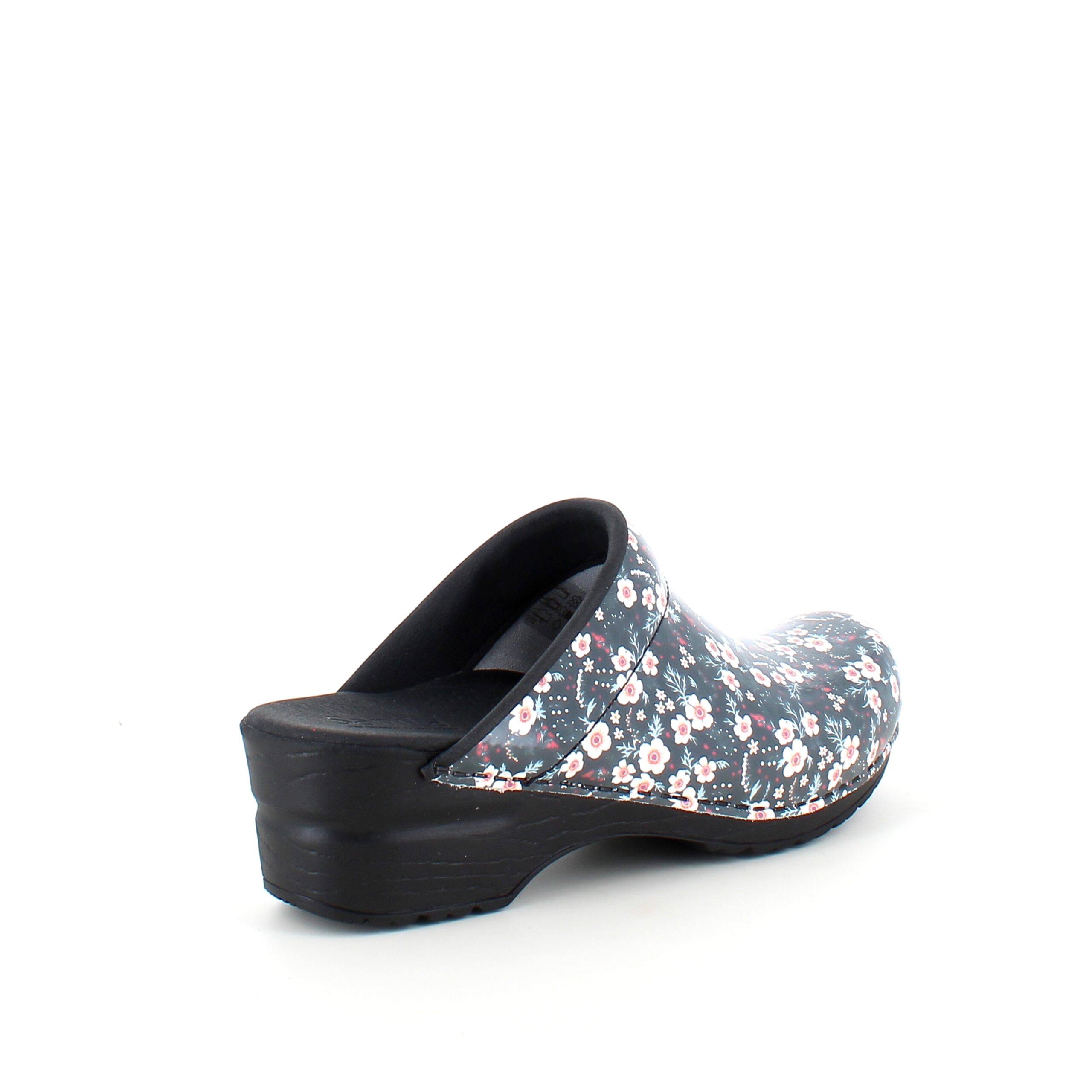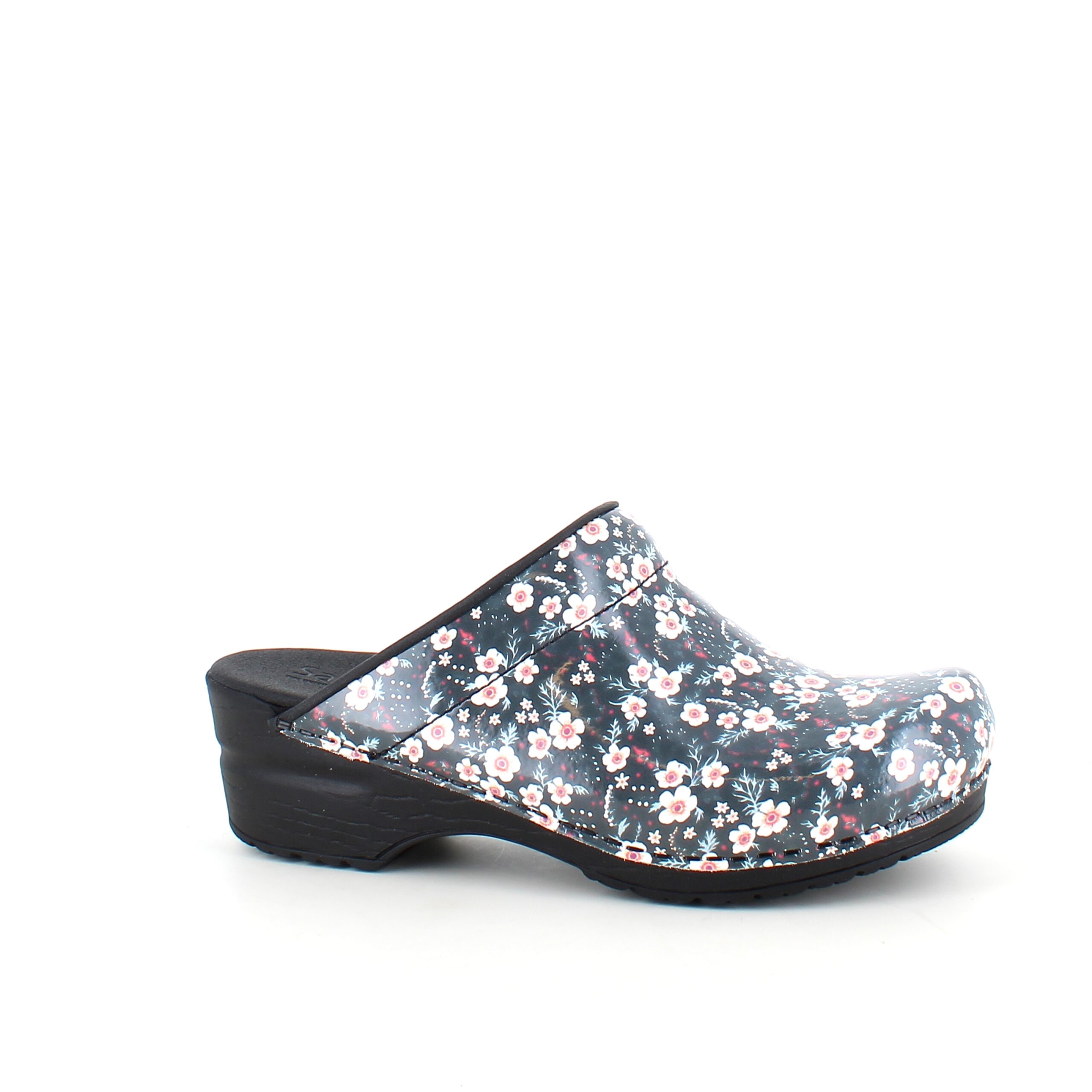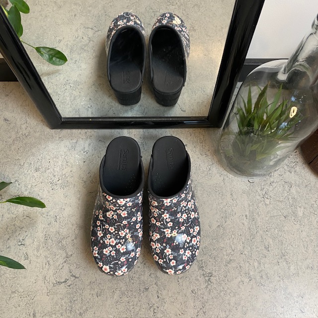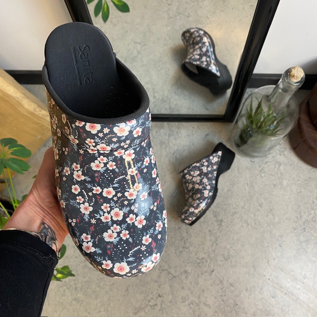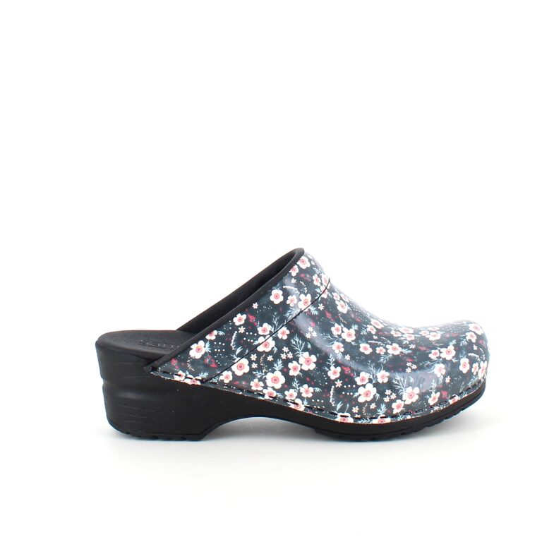 Sanita tøffel-træsko med sort/hvide blomster