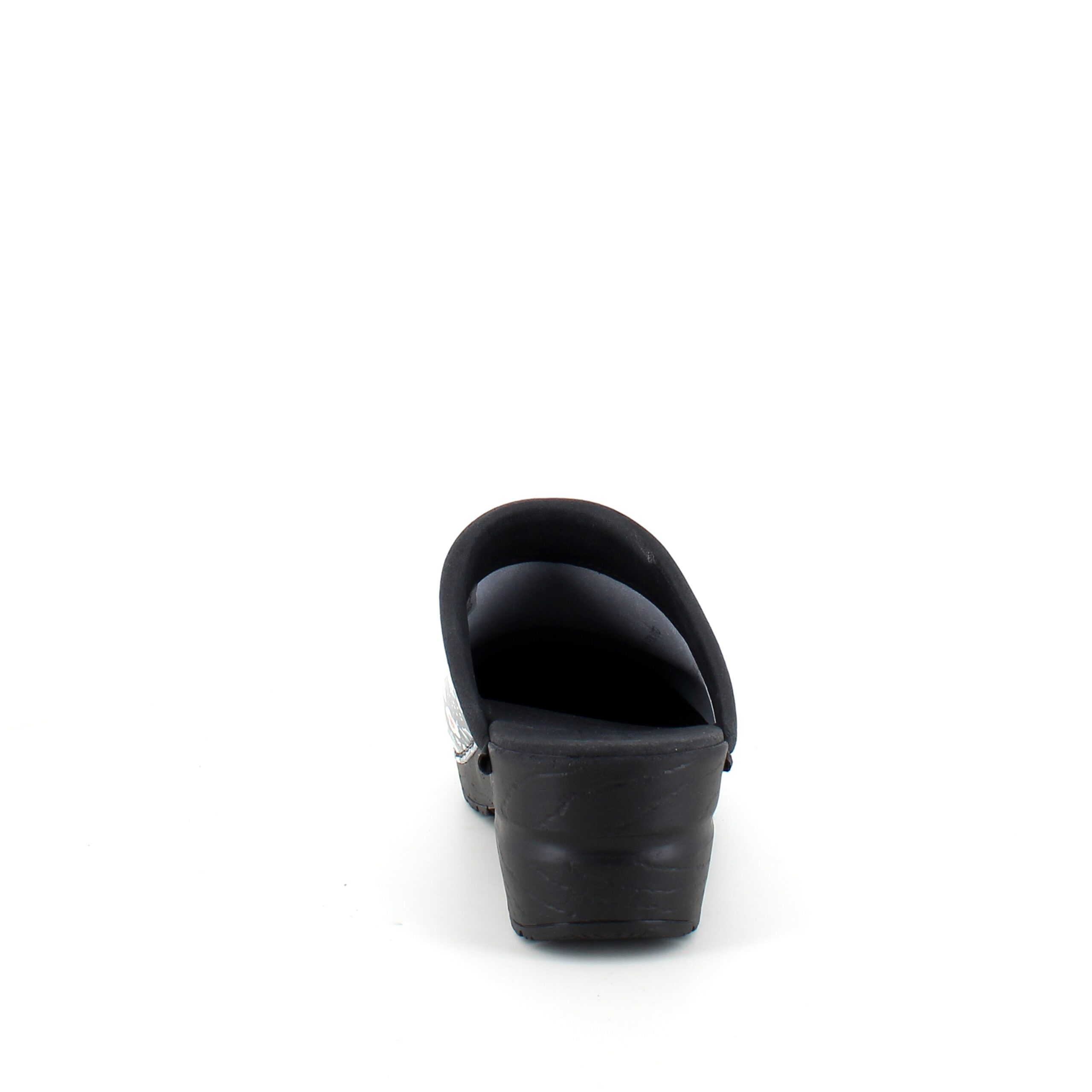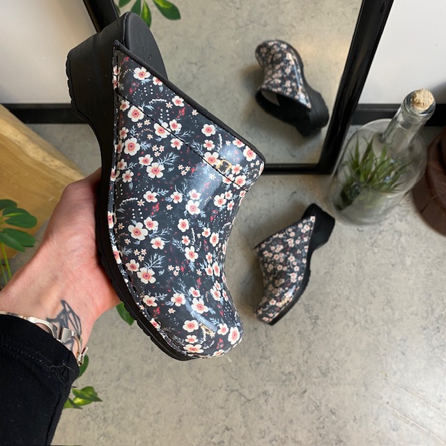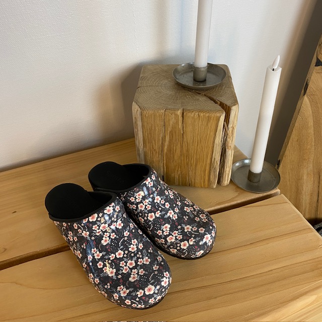 Elegant og komfortabel tøffeltræsko i et flot sort/hvid blomstret printet laklæder.