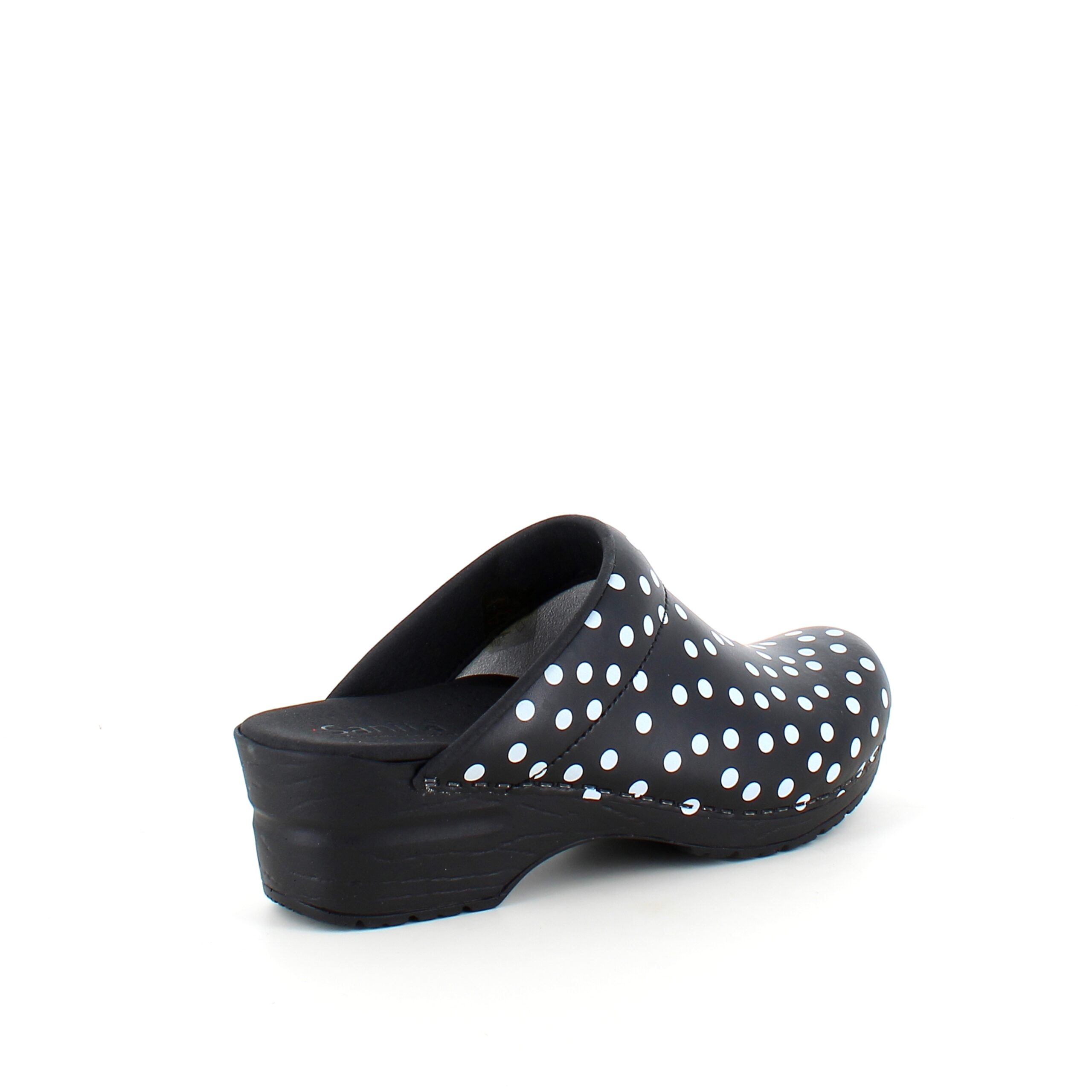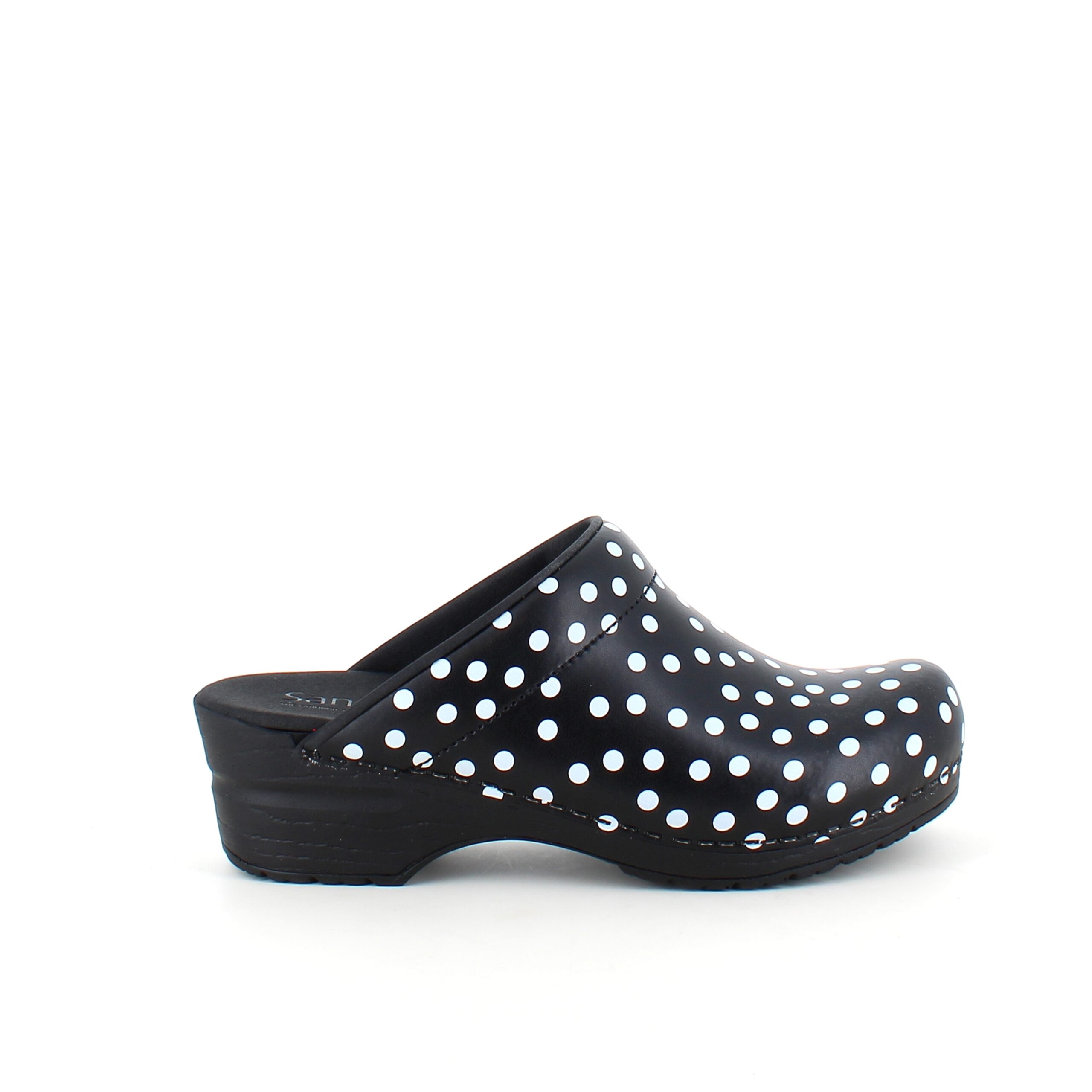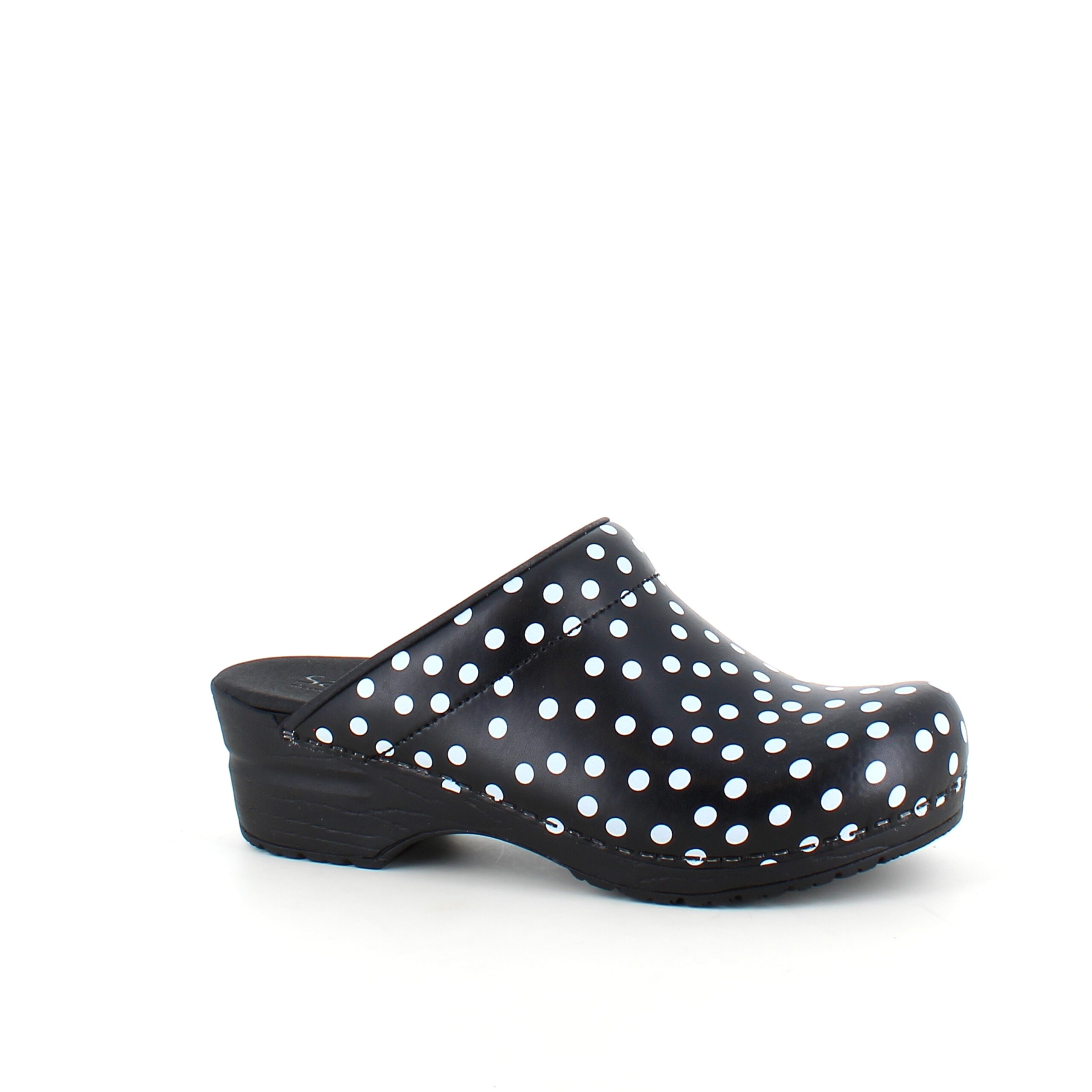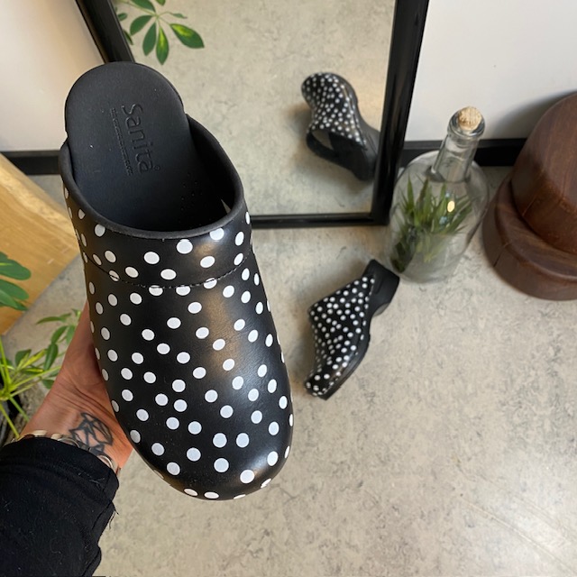 Sanita træsko med sort og hvidt prikkemønster tilbyder en kombination af stil og høj komfort.
