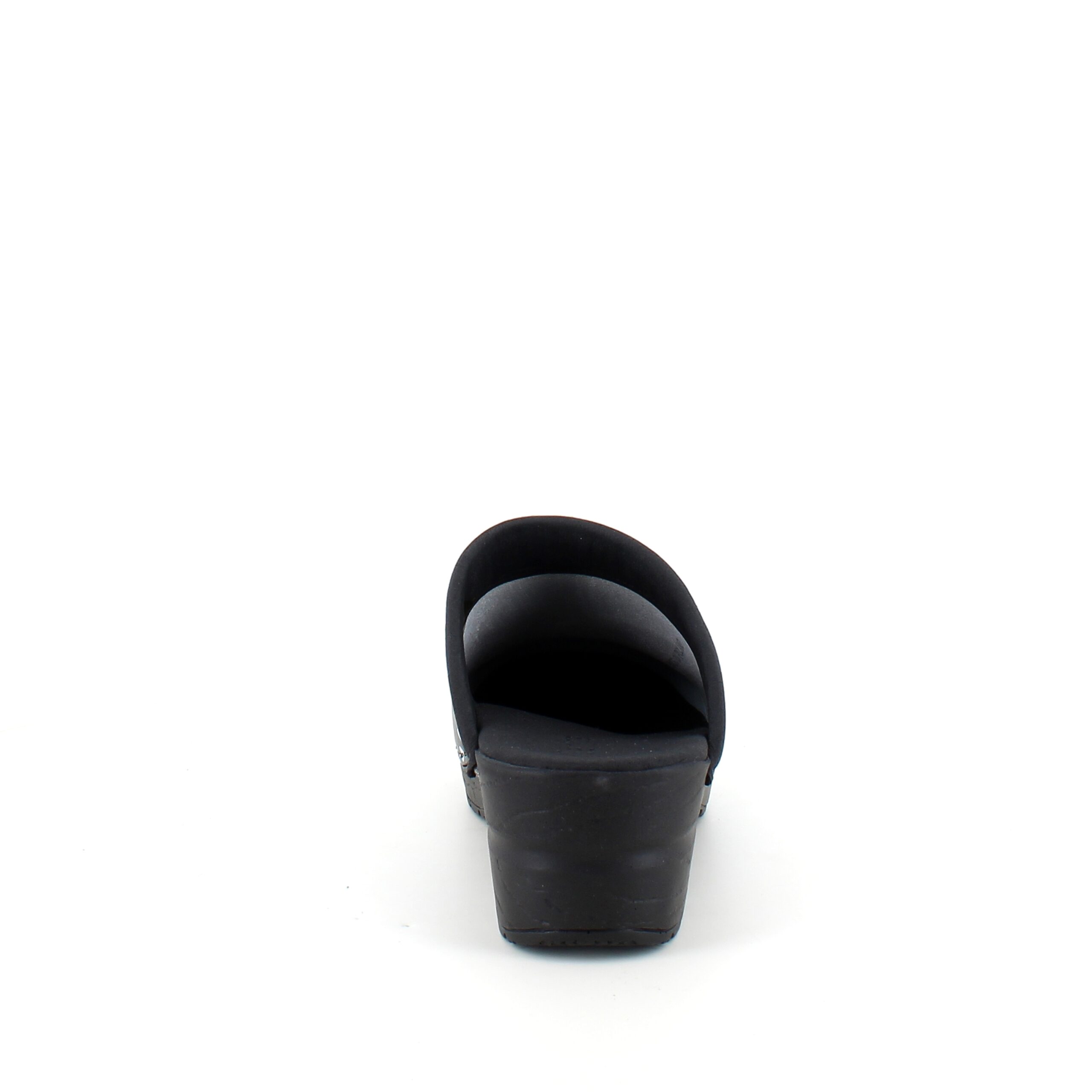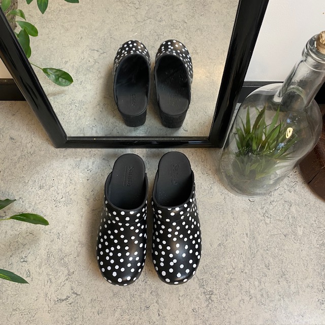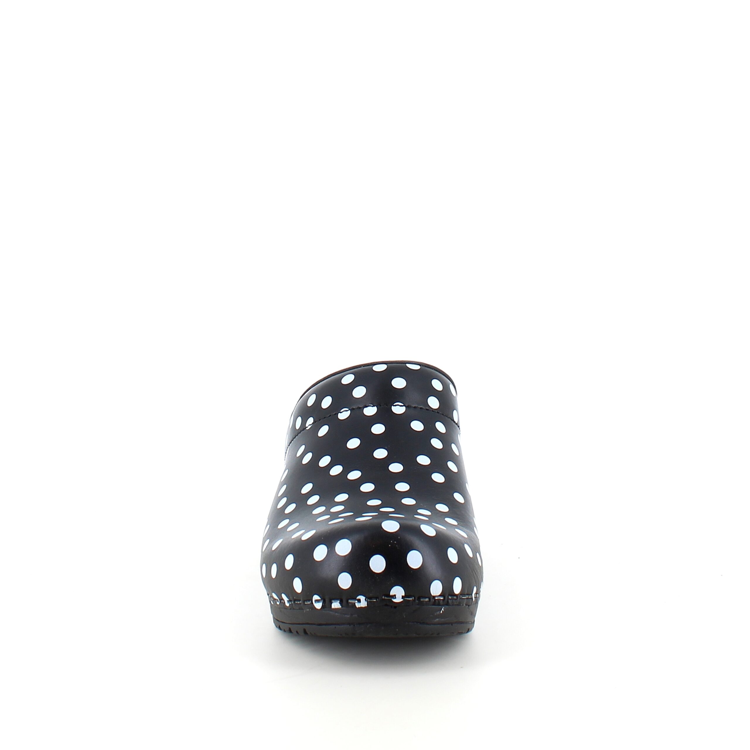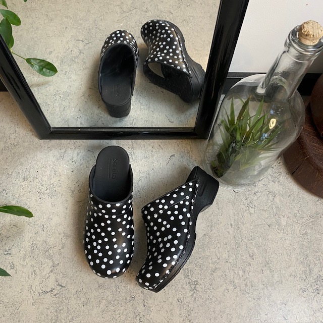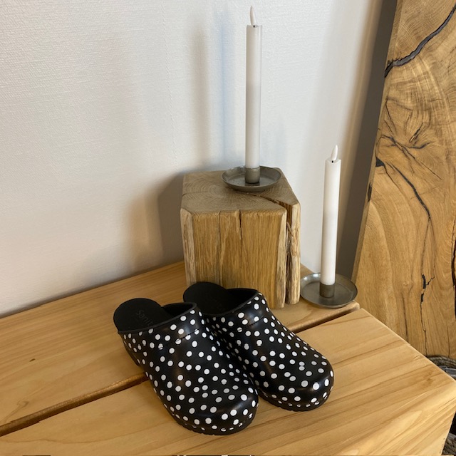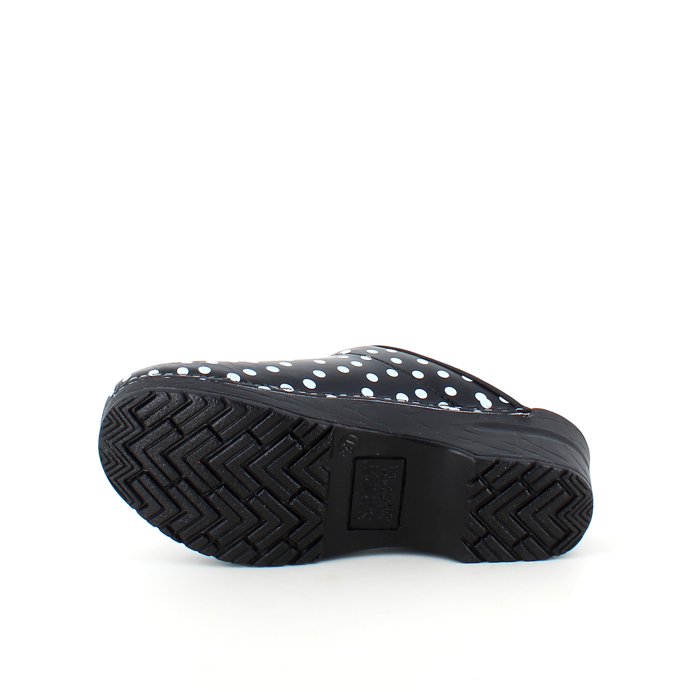 Sanita træsko med sort og hvidt prikkemønster tilbyder en kombination af stil og høj komfort.