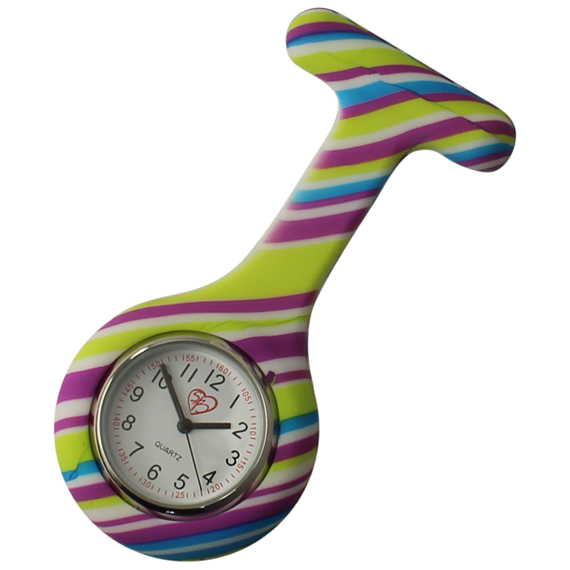 Lækker stribet sygeplejeur i blød silikone. Striberne er i farverne; lilla, blå, lysegrøn og hvid.