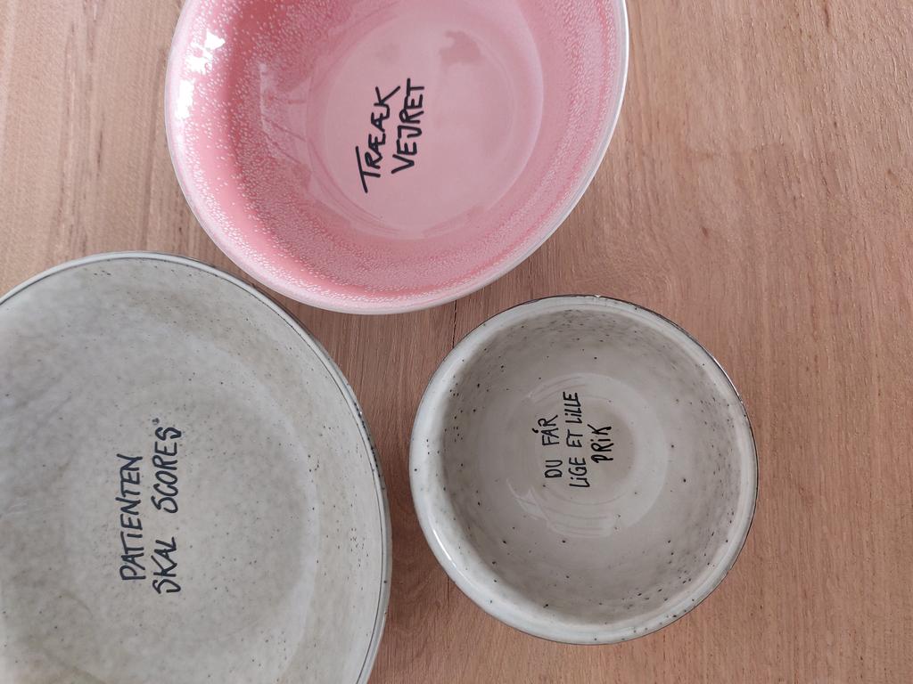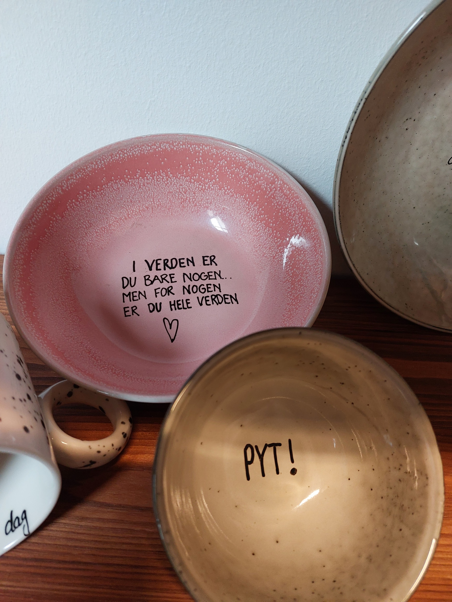 Vi laver skålen med din tekst og det tager 2-3 hverdage, da den skal brændes. I forhold til skrifttype vil det være Sygeplejebutikken der laver det pænt.