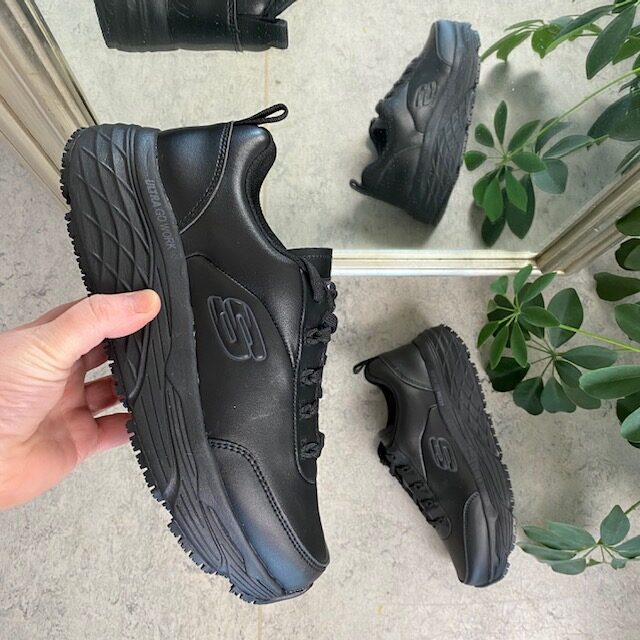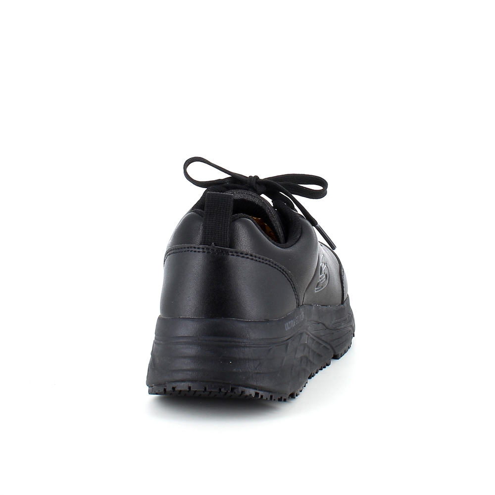 Skechers work sko i sort skind med max cushioning såler til dig, der kun vil have det bedste.
