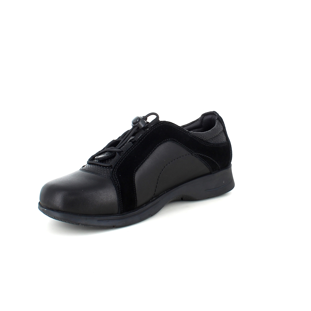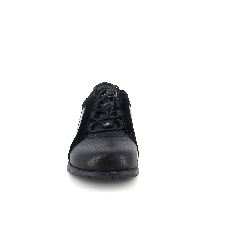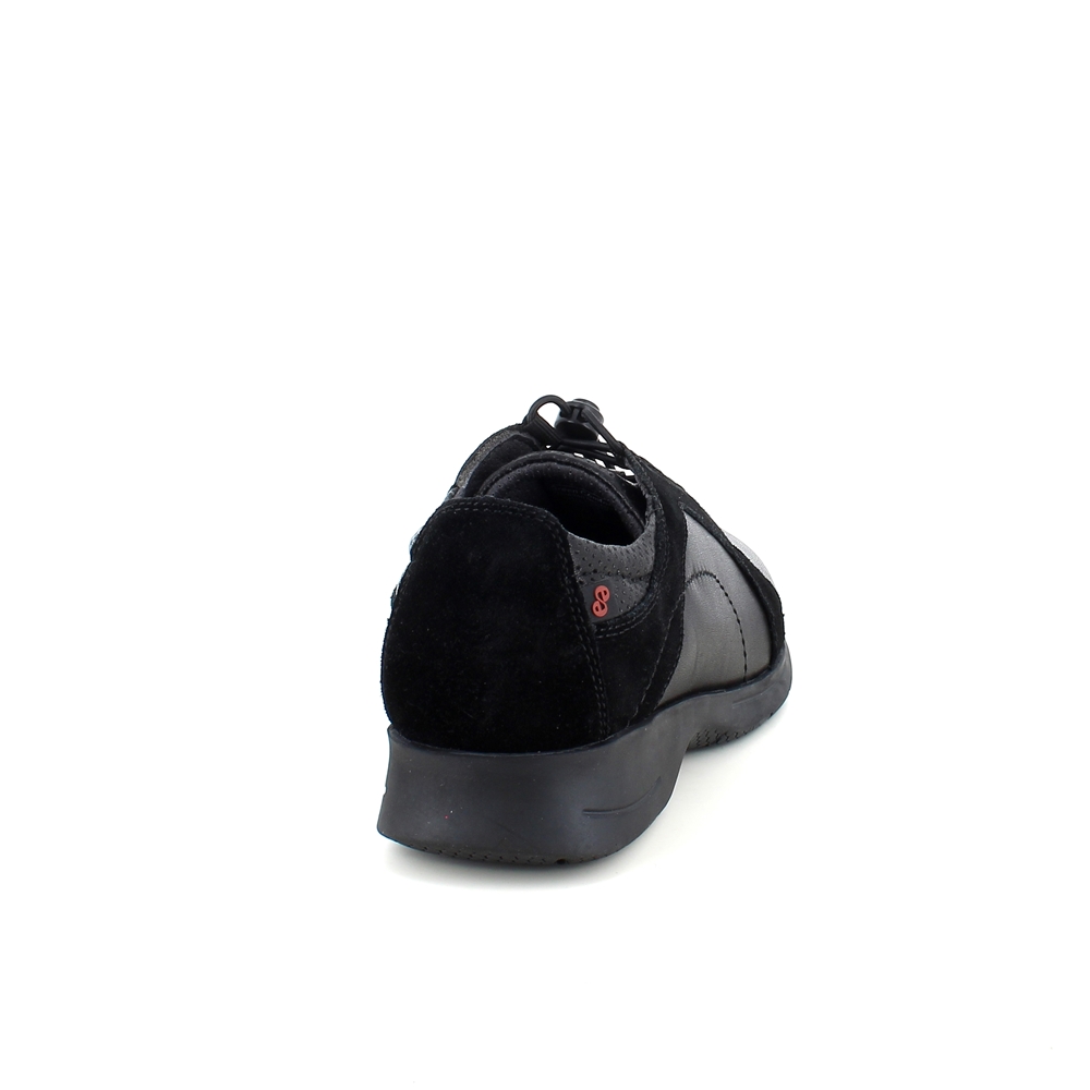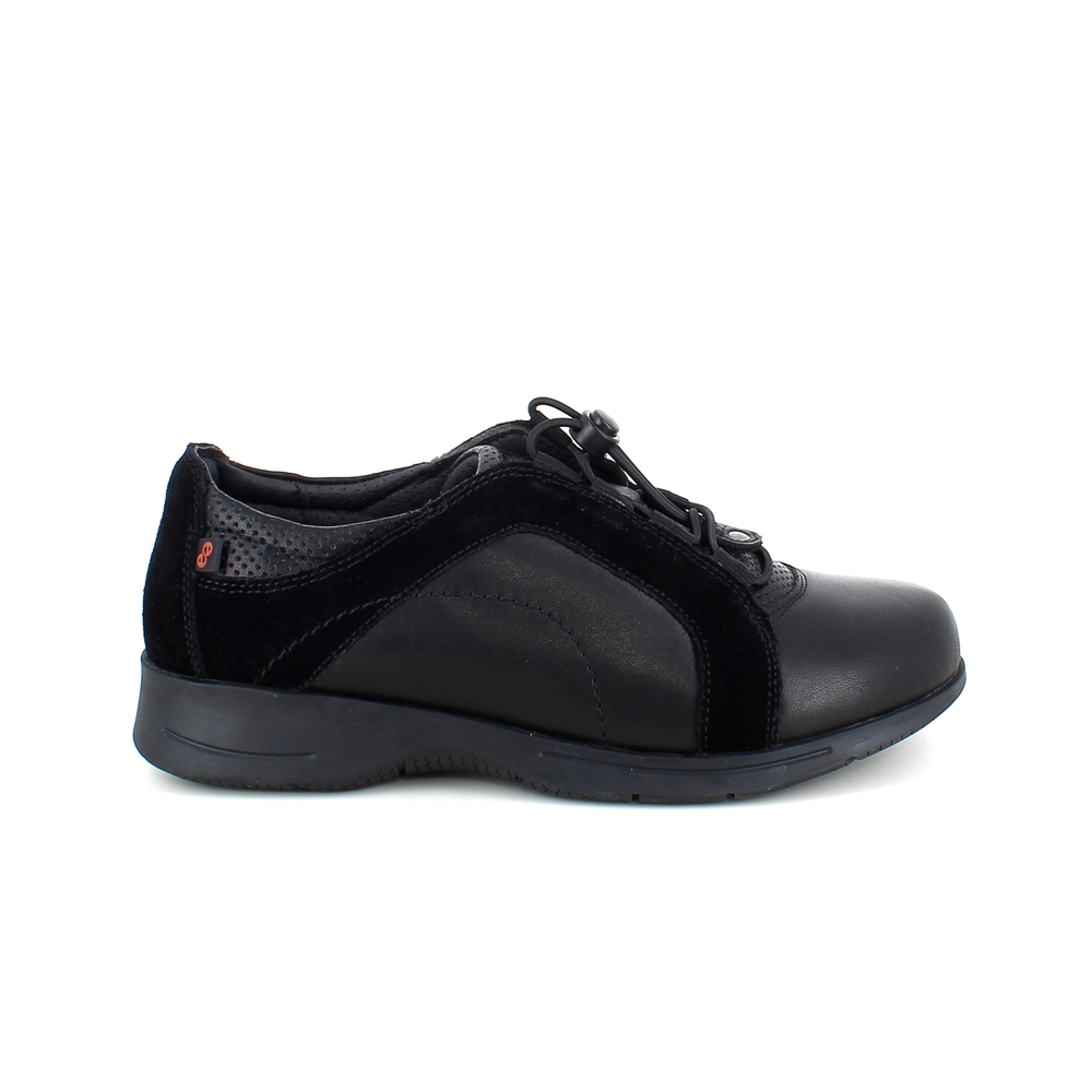 Sort sko i skind med flot detalje i ruskind langs skoen.