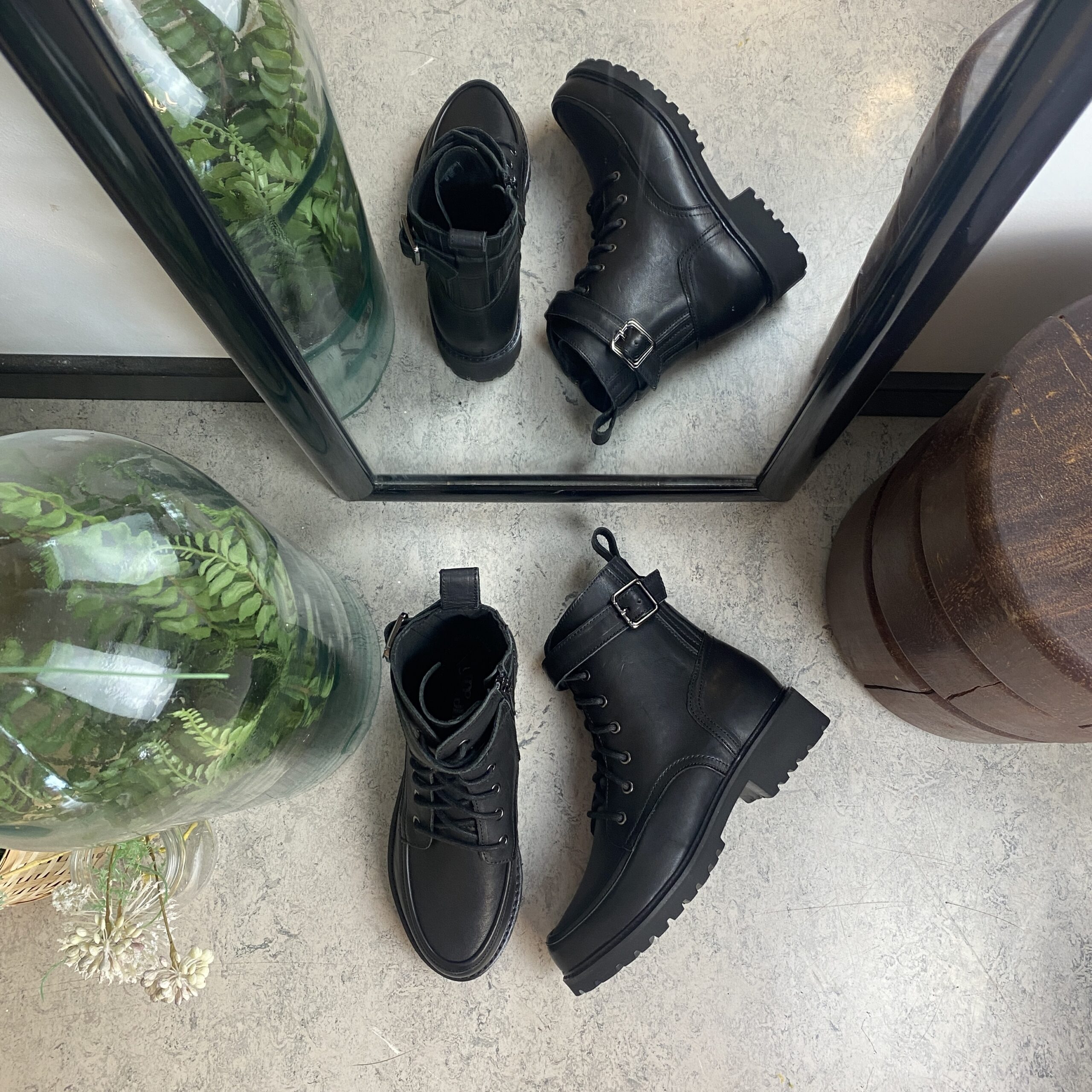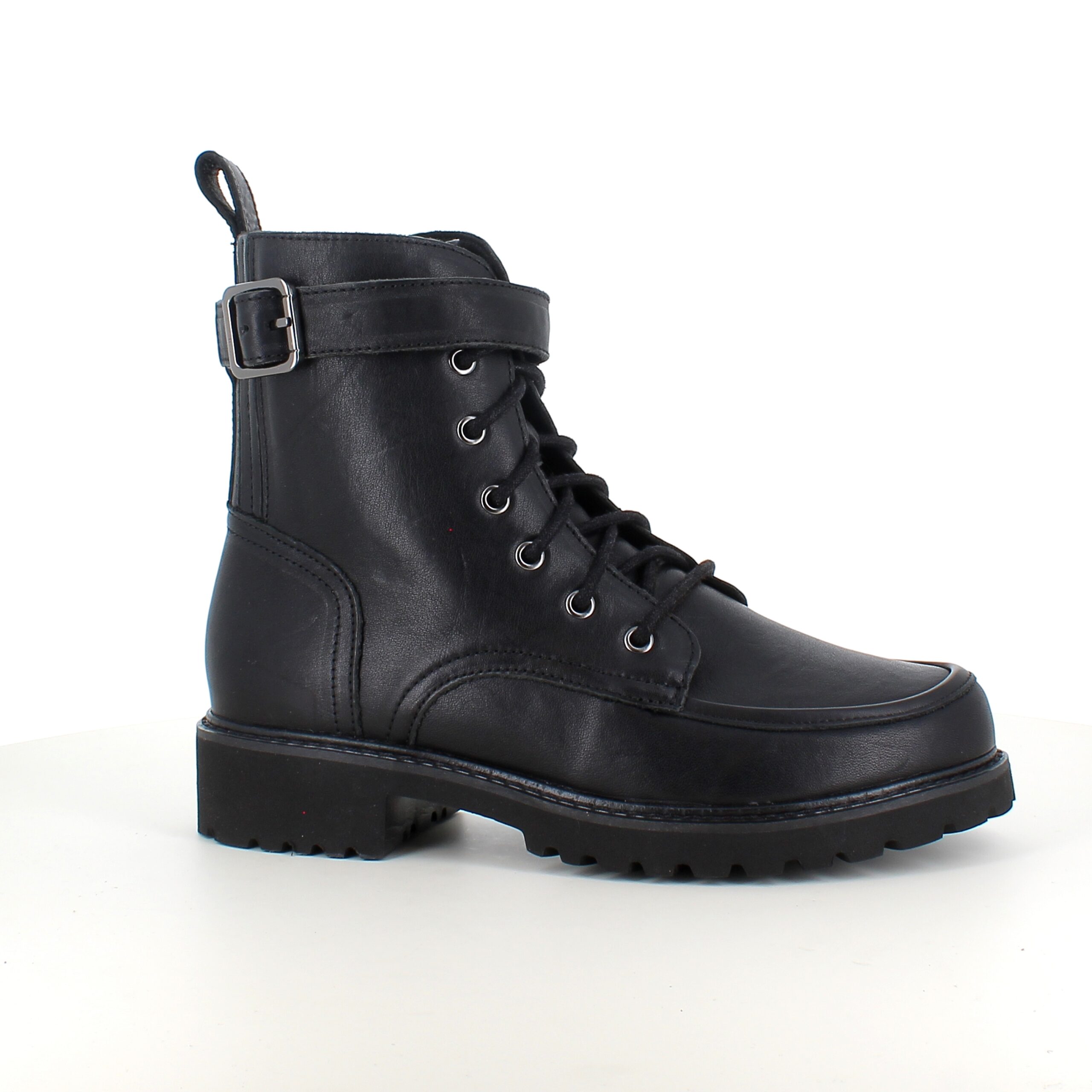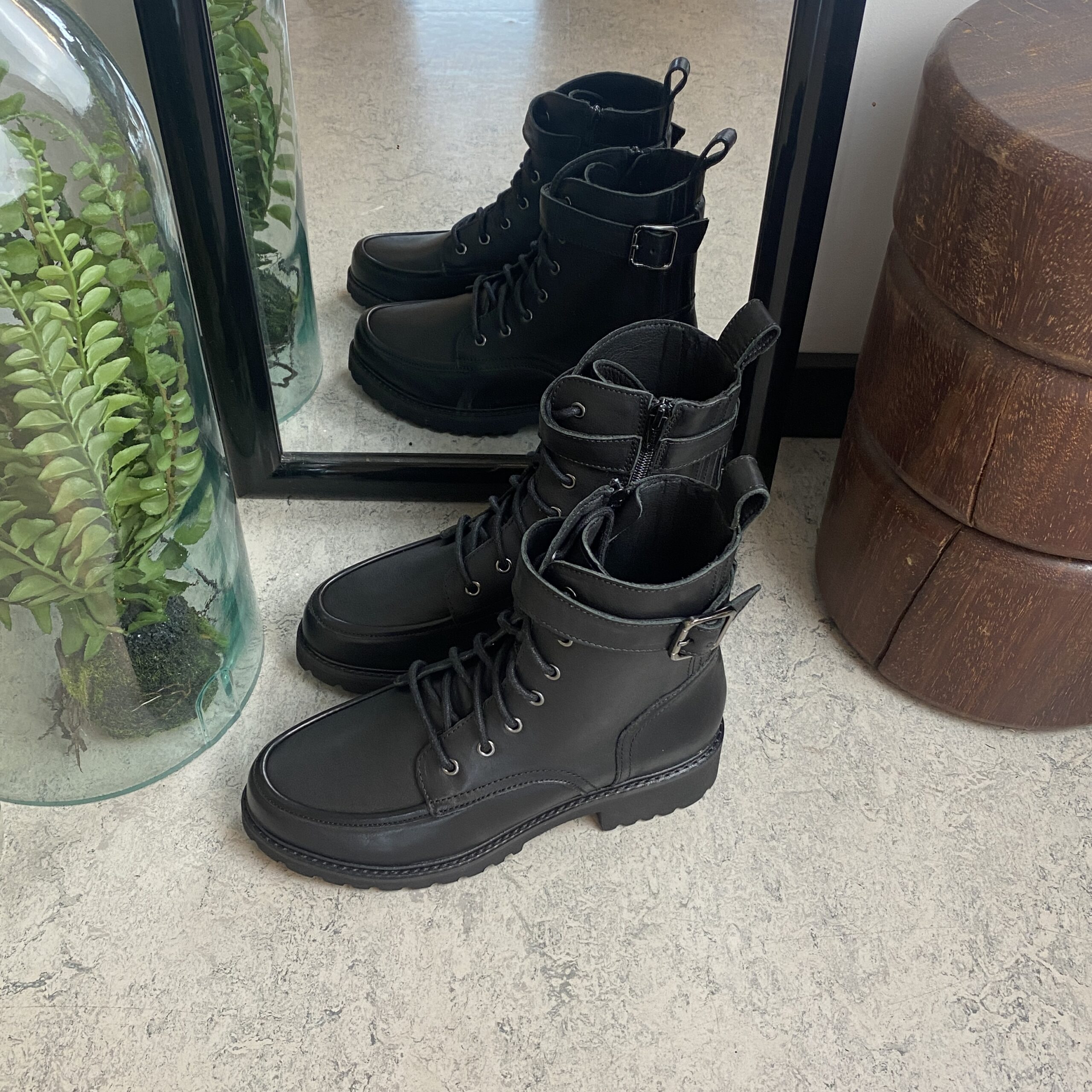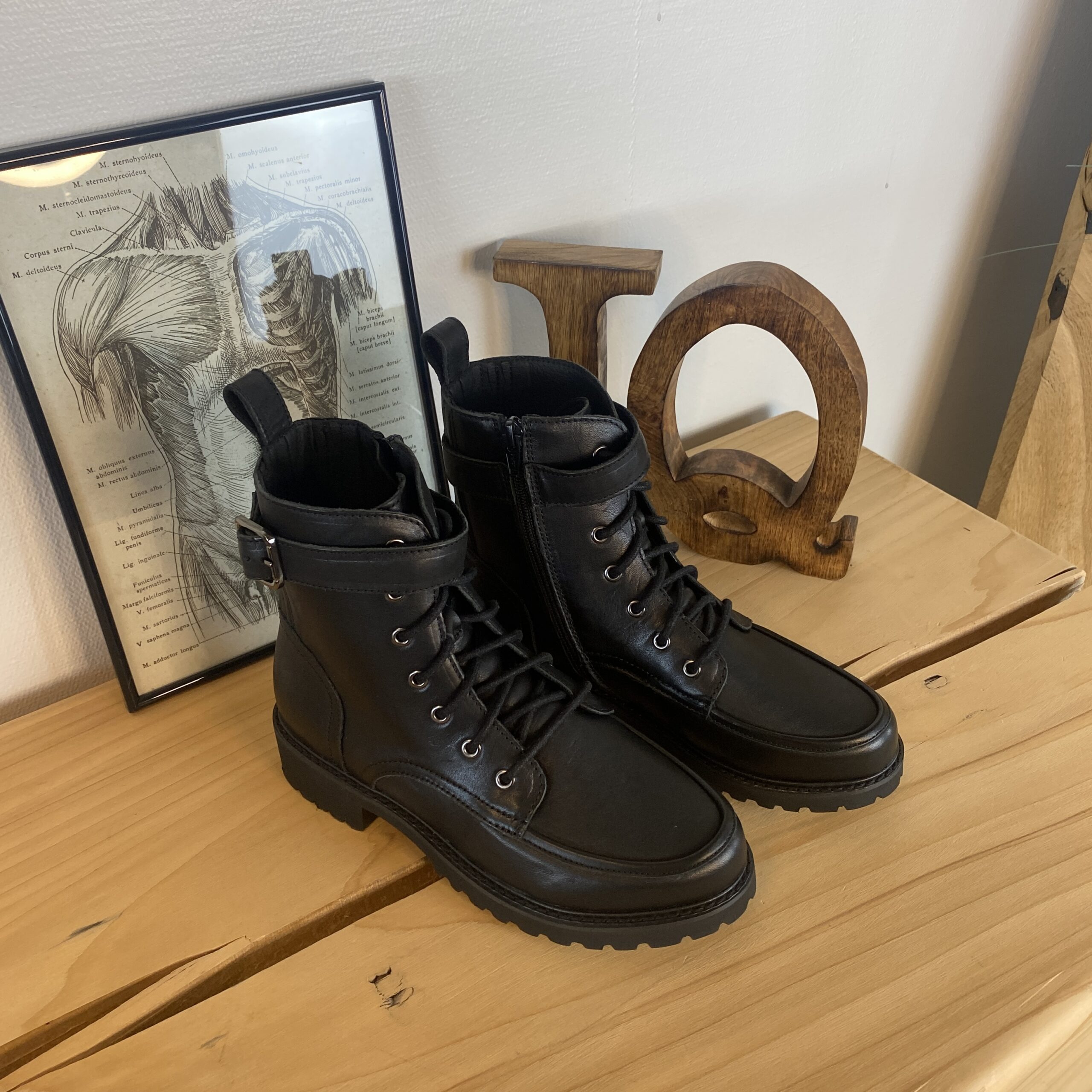 Sort snørestøvle i slidstærkt skindlook med klassisk snørelukning og justerbar spænde foroven, som sikre en stabil pasform.