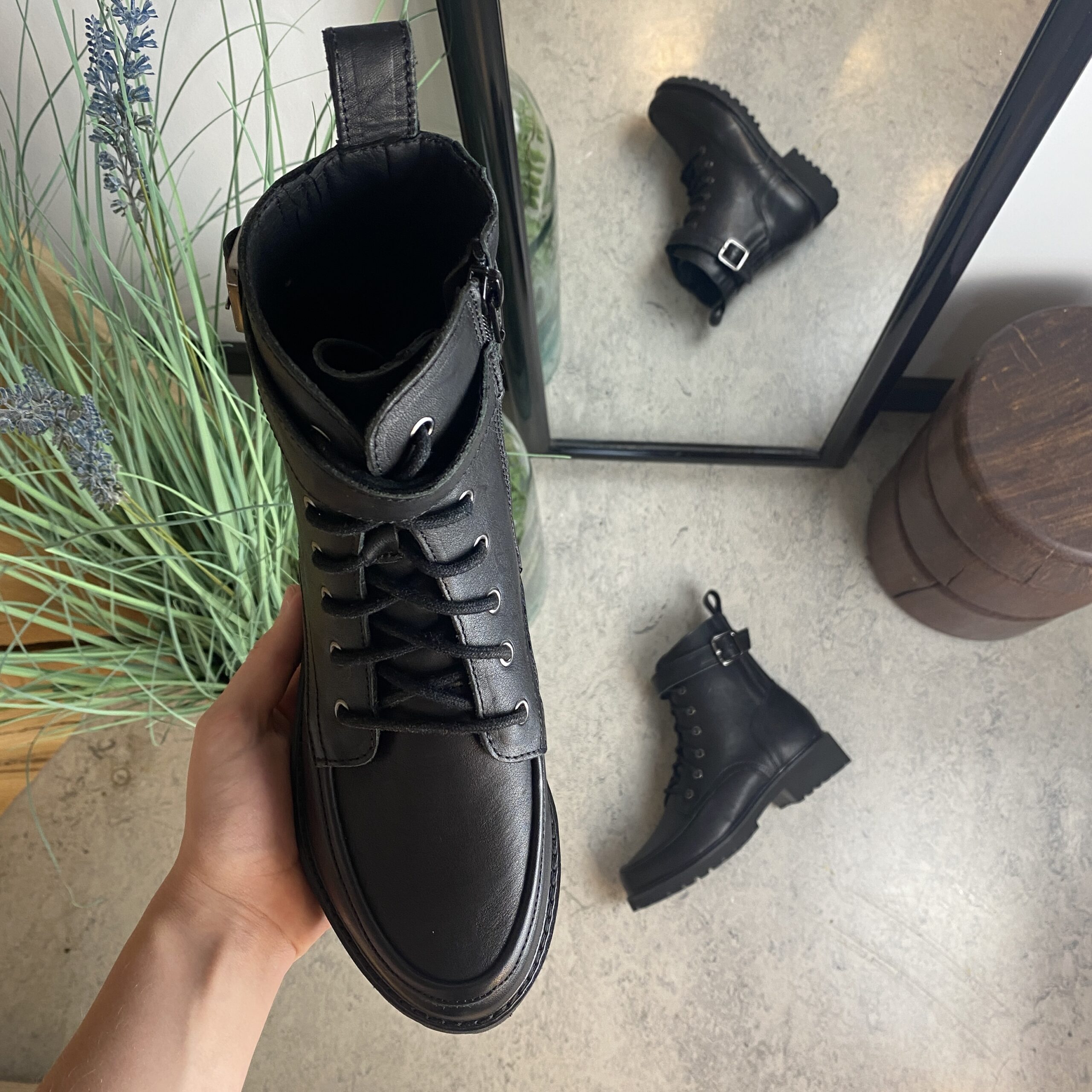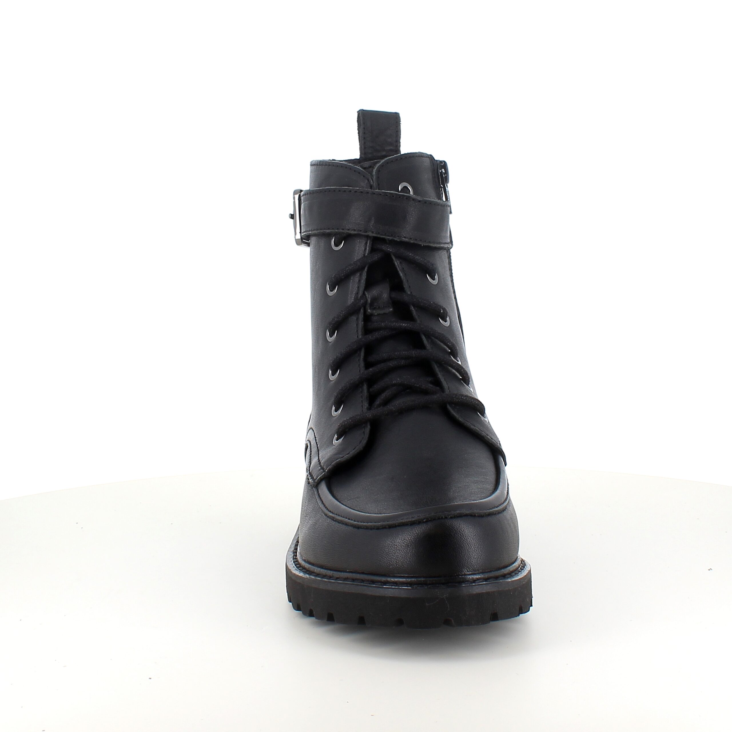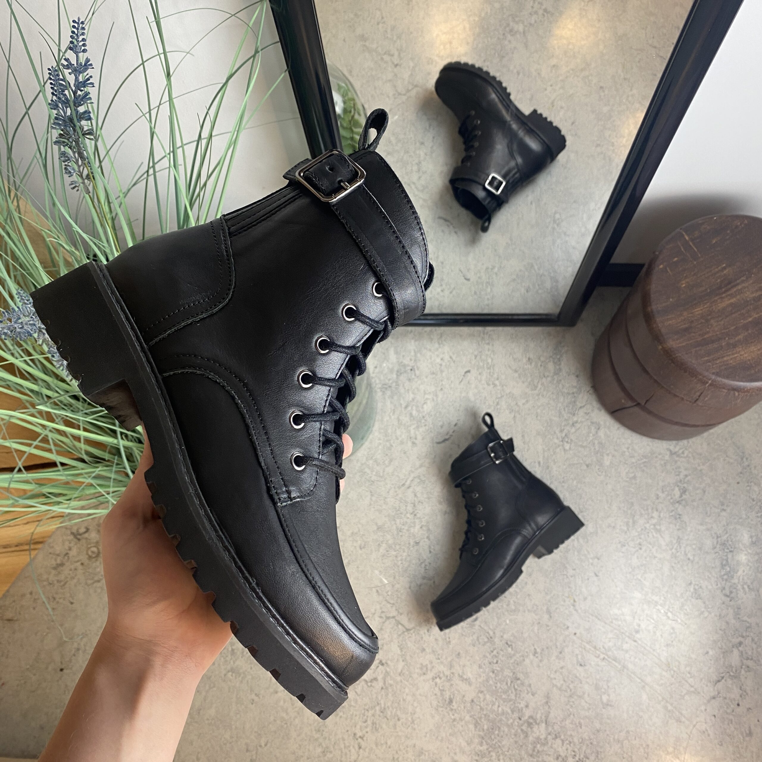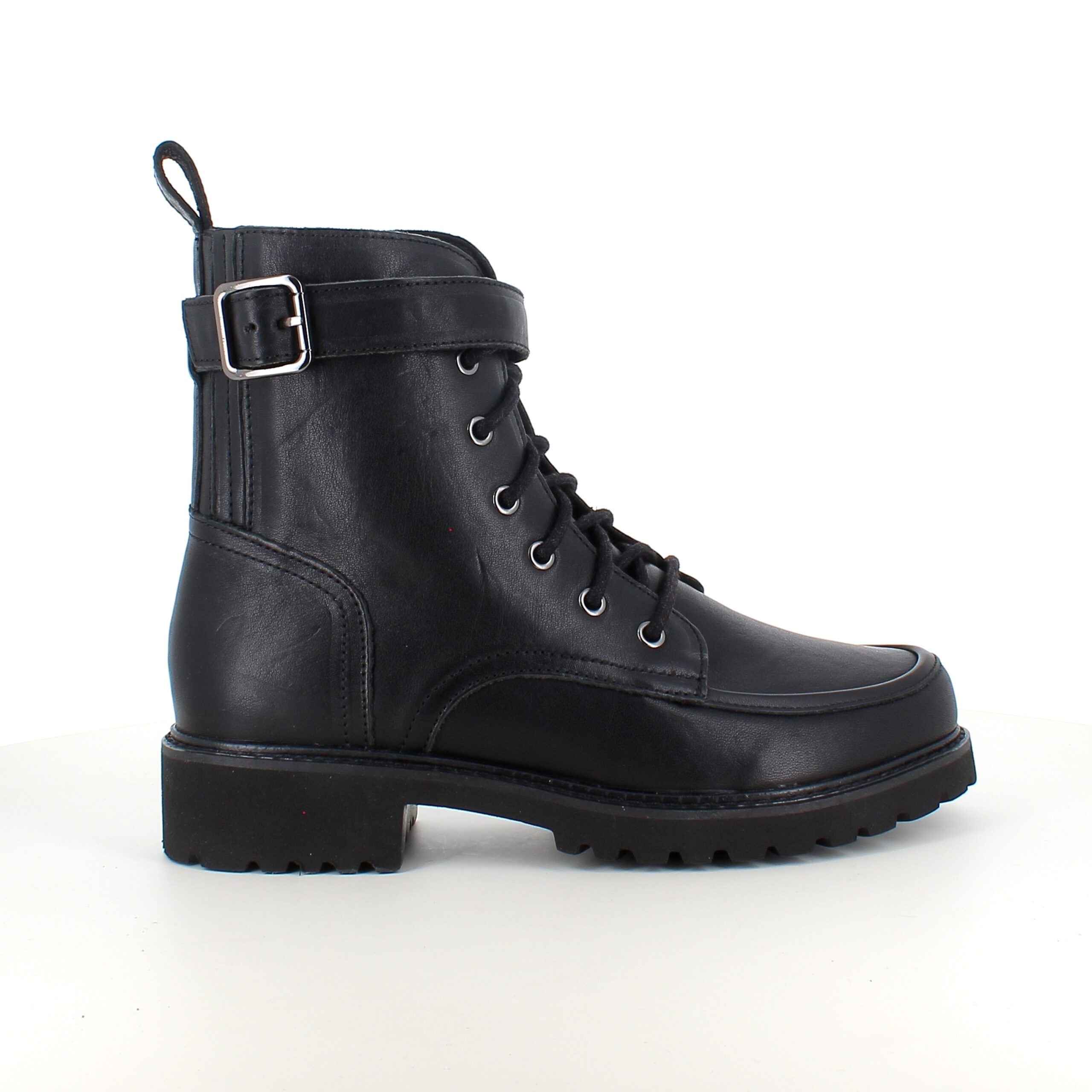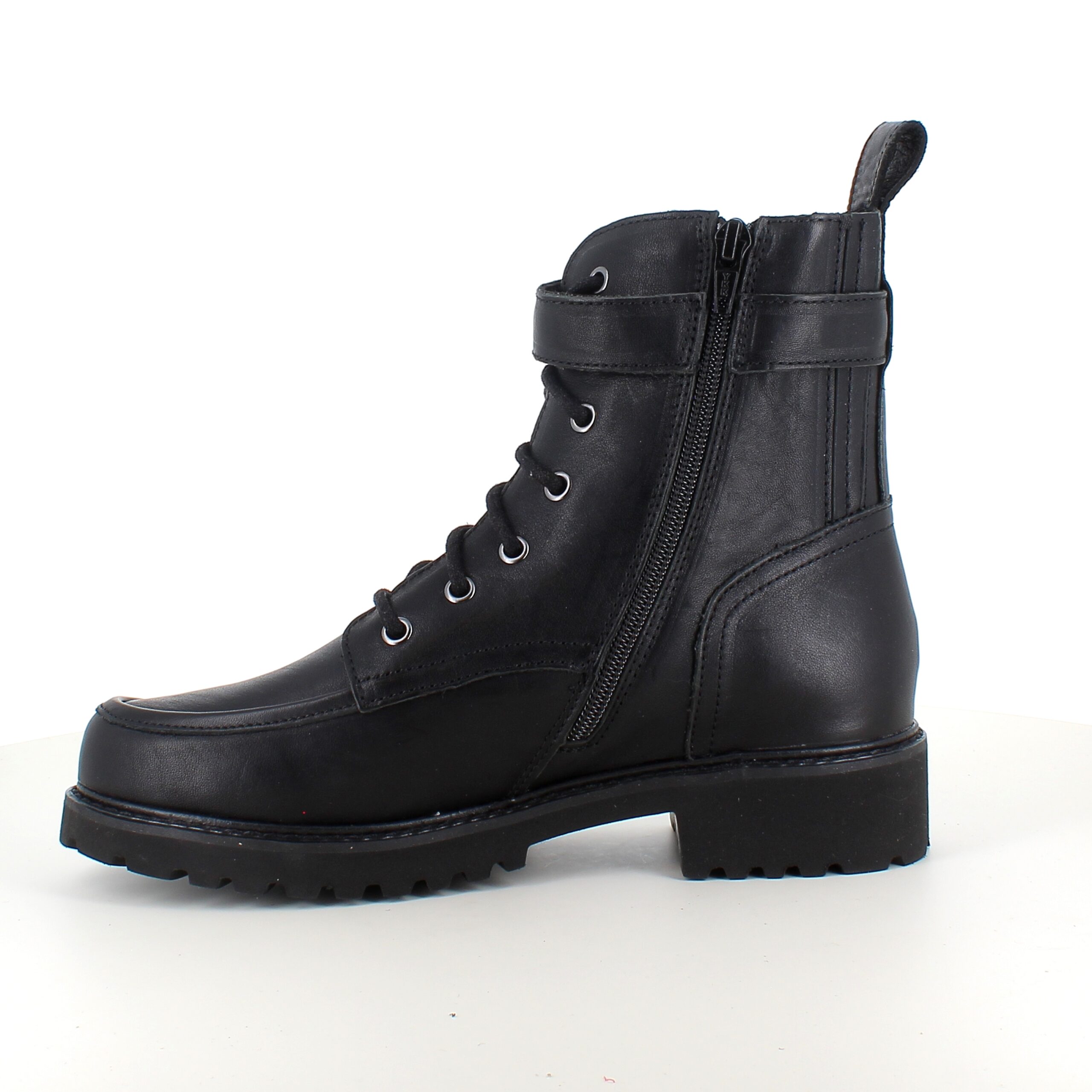 Sort snørestøvle i slidstærkt skindlook med klassisk snørelukning og justerbar spænde foroven, som sikre en stabil pasform.