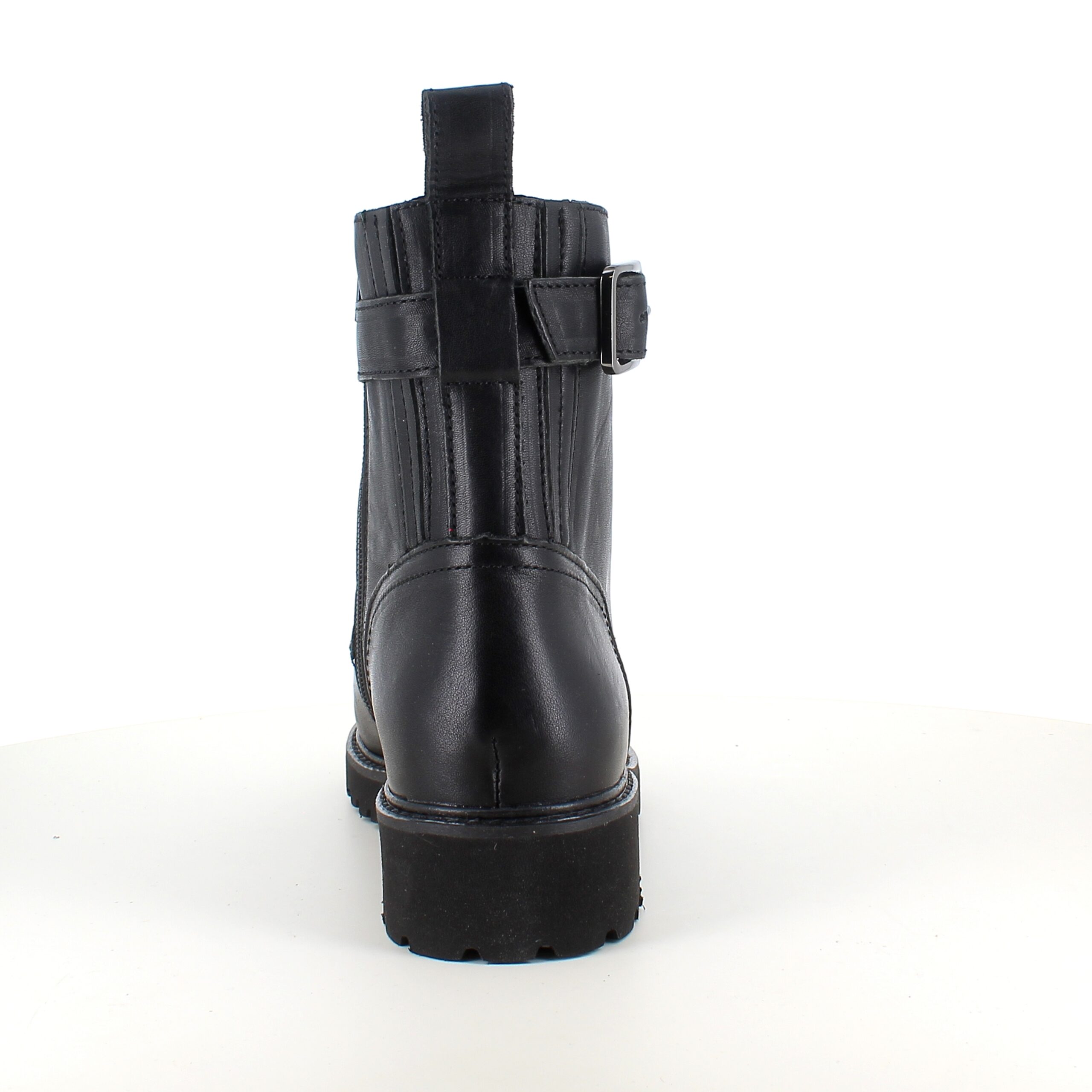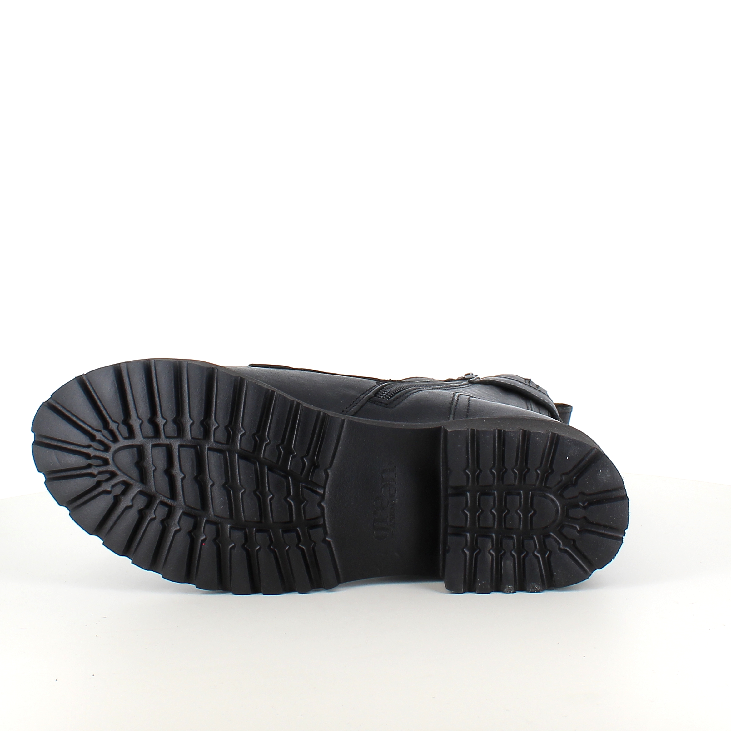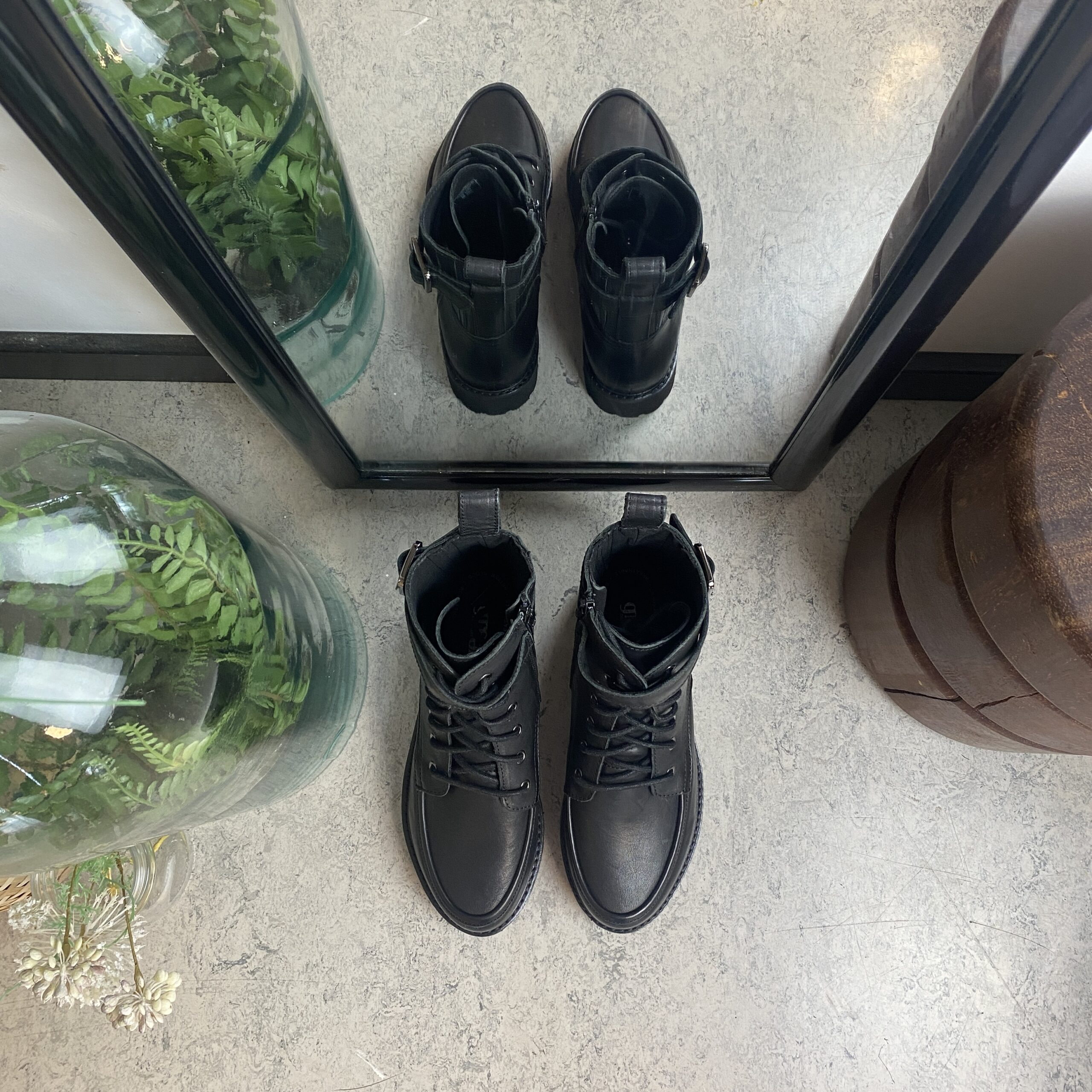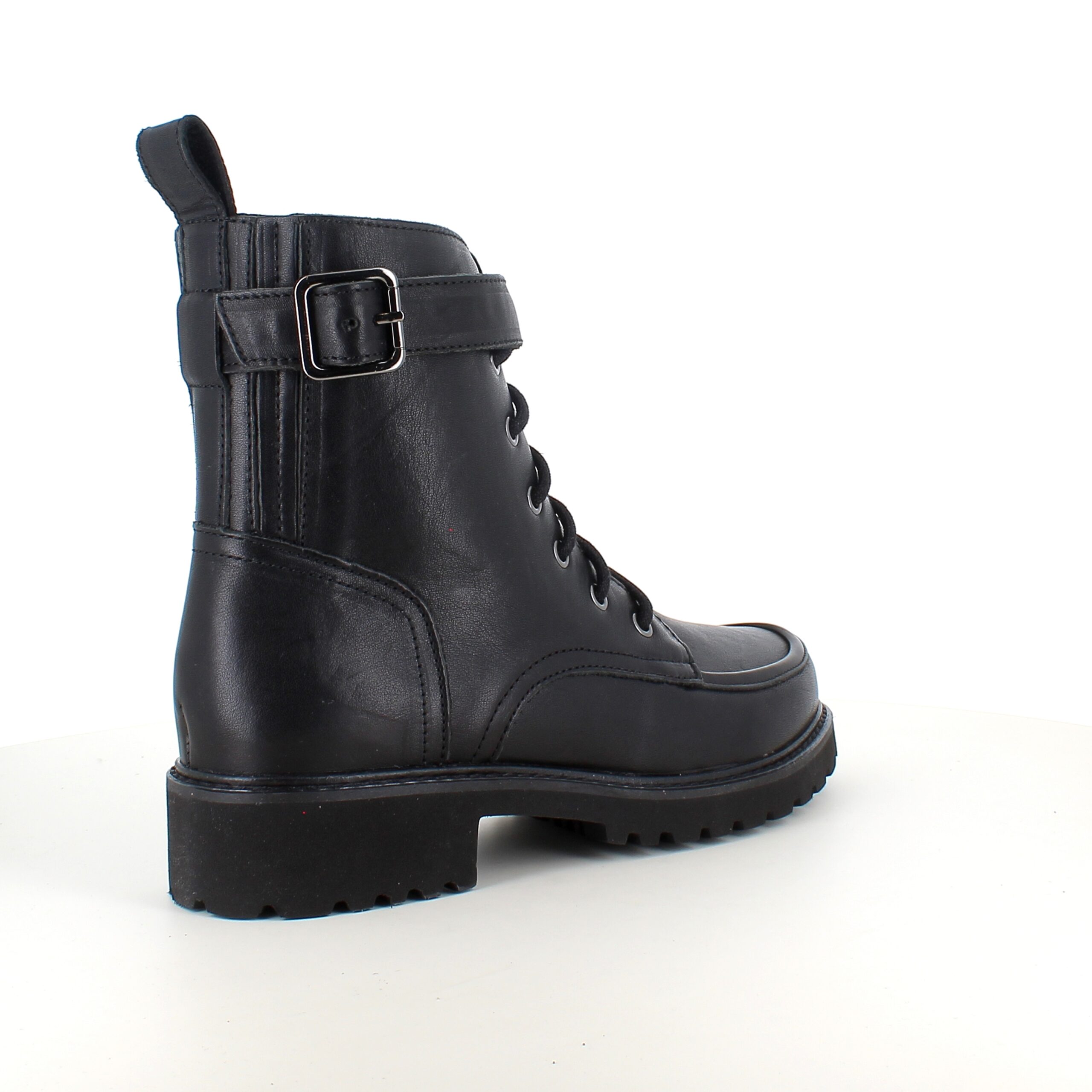 Sort snørestøvle i slidstærkt skindlook med klassisk snørelukning og justerbar spænde foroven, som sikre en stabil pasform.