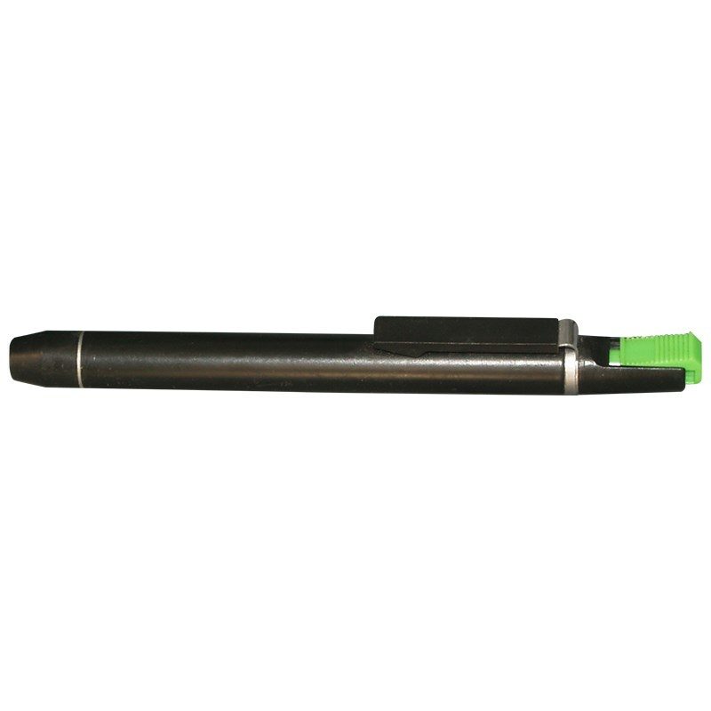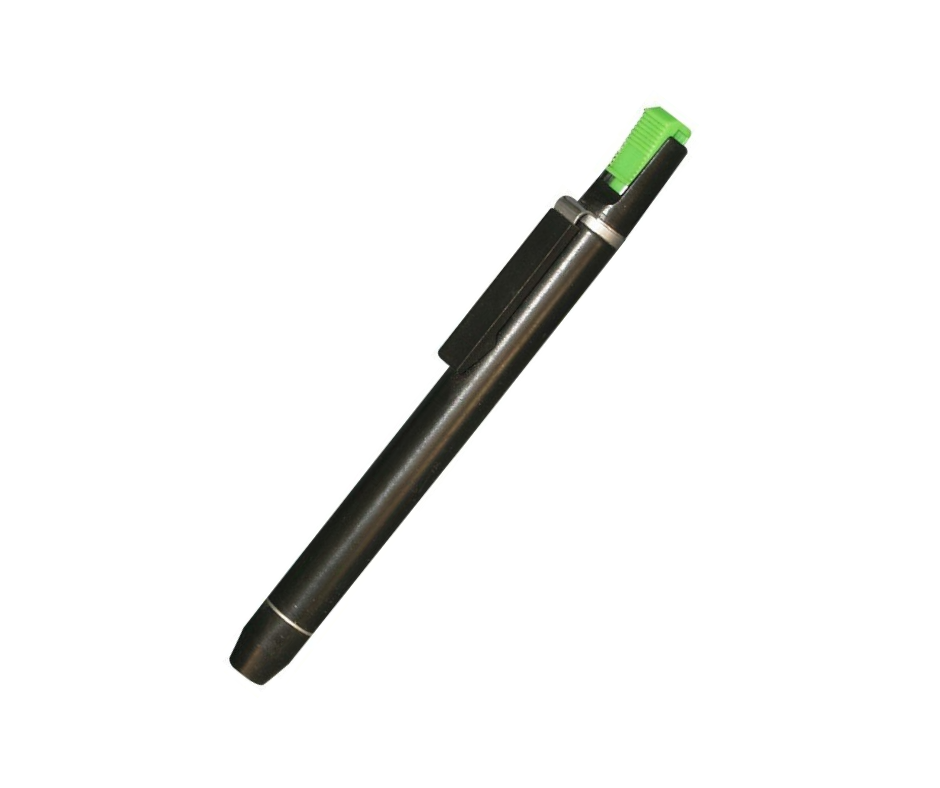Penlygte i sort til brug i sygeplejen. Denne penlygte har en trykknap, så man ikke behøver at holde knappen inde mens man lyser.