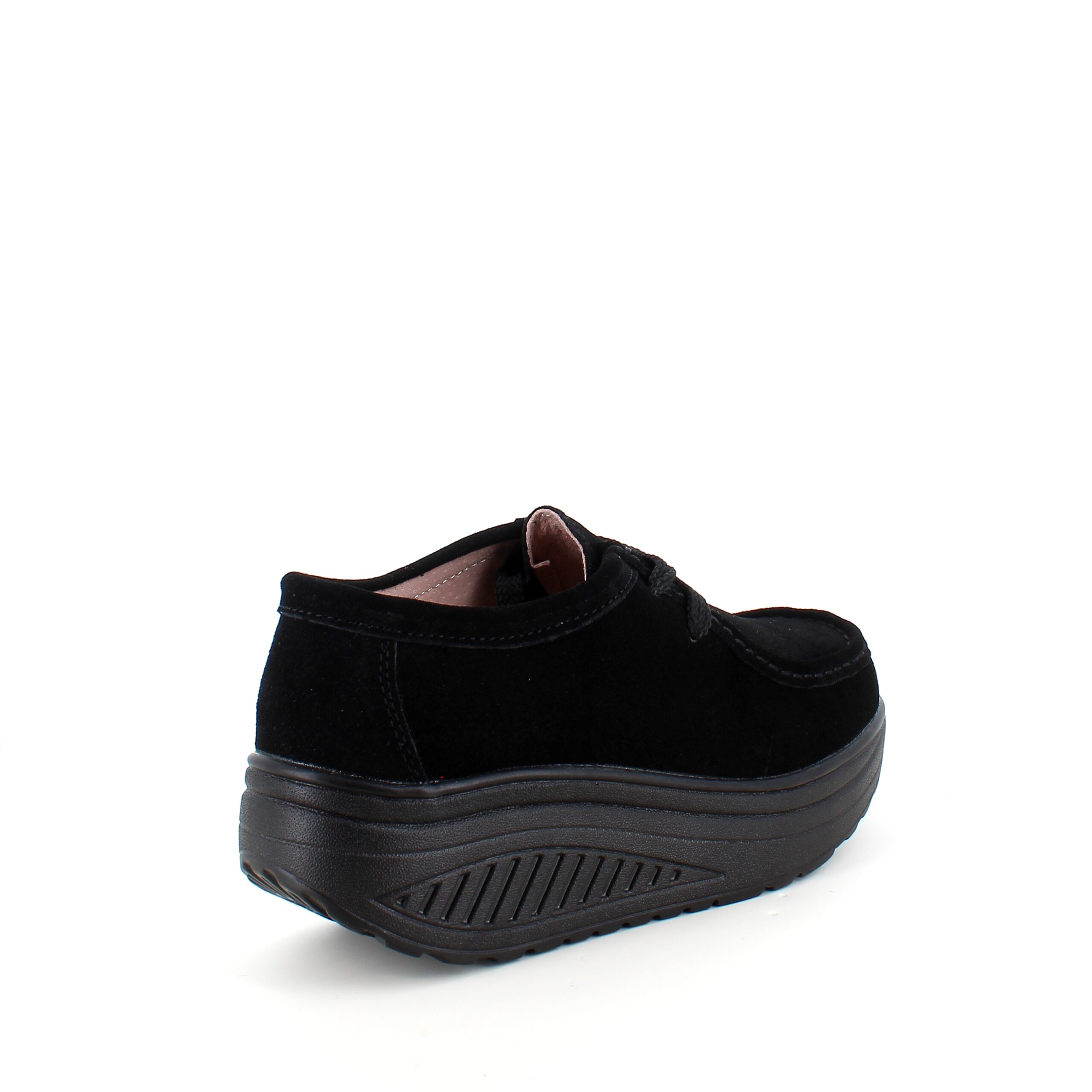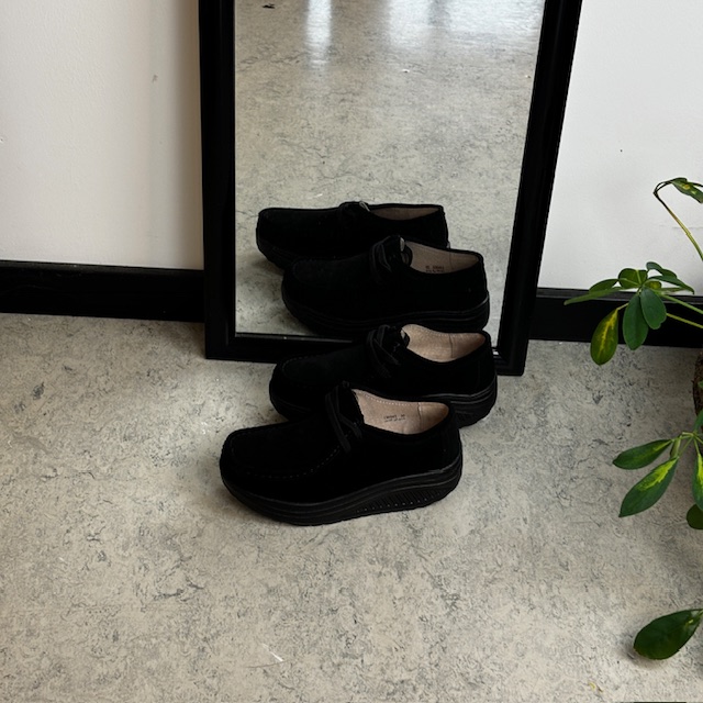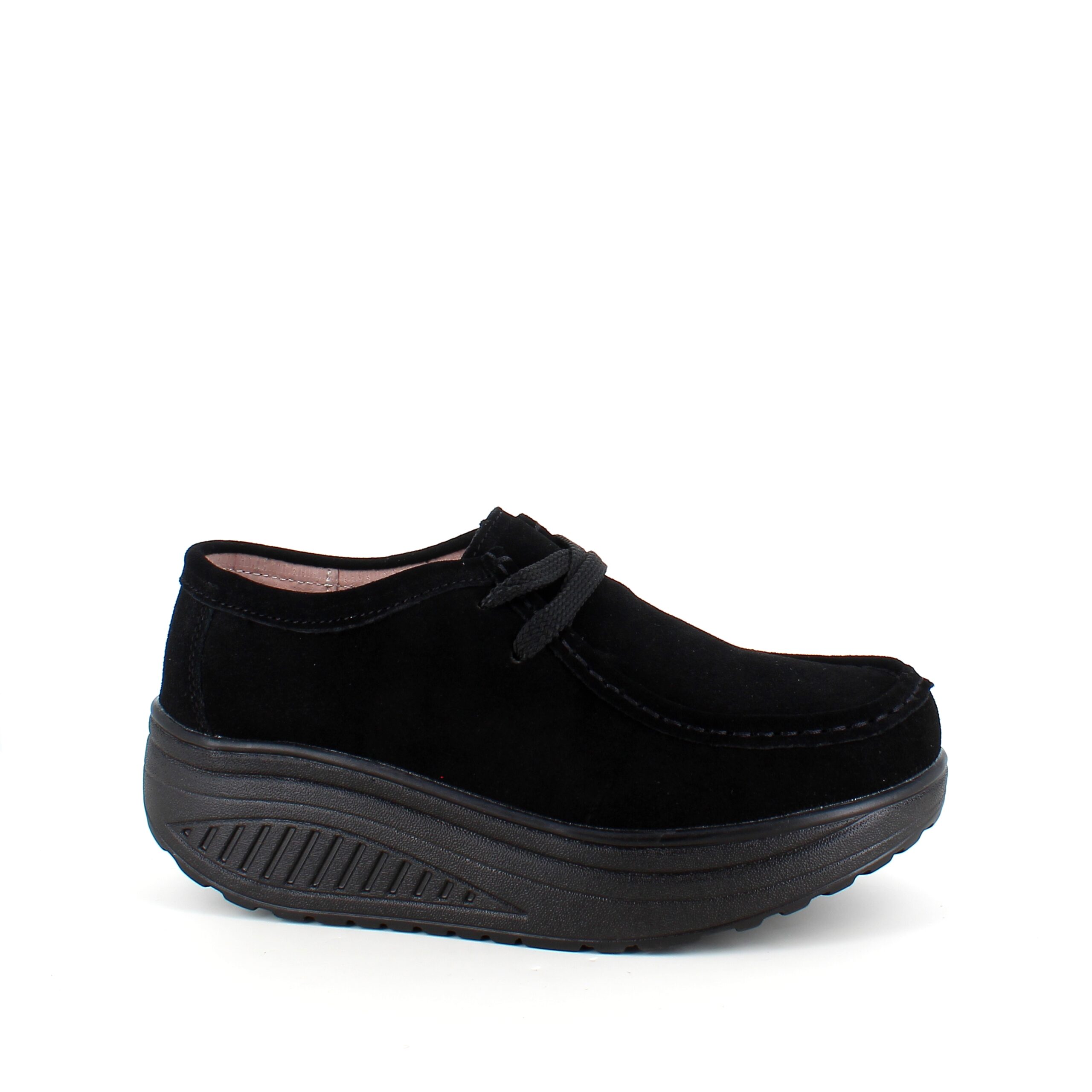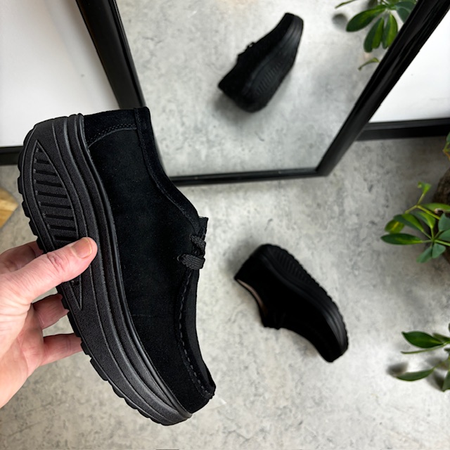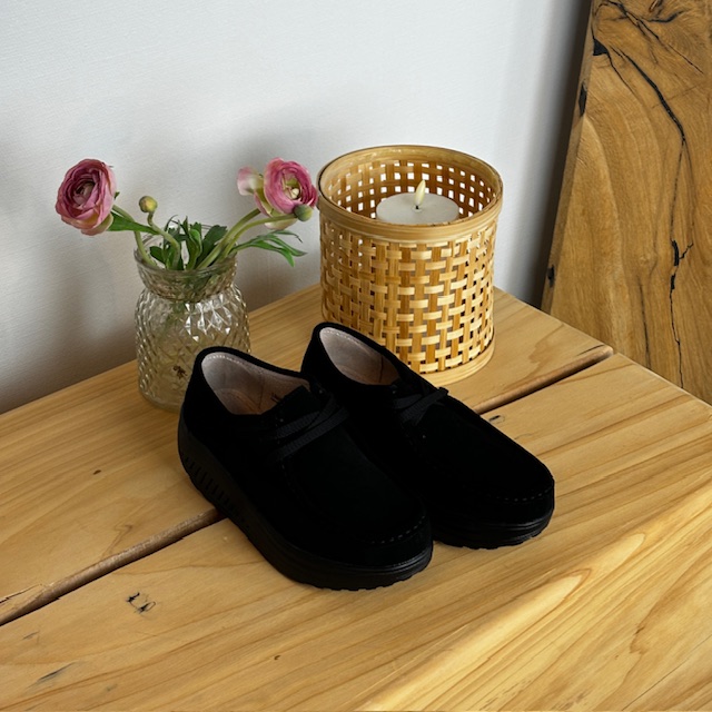 Sort ruskindsko med gængesål og svangstøtte tilbyder både stil og komfort.
