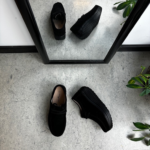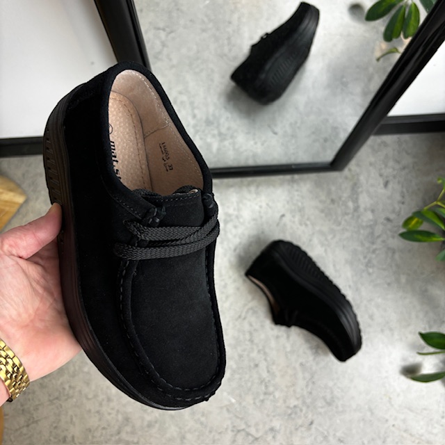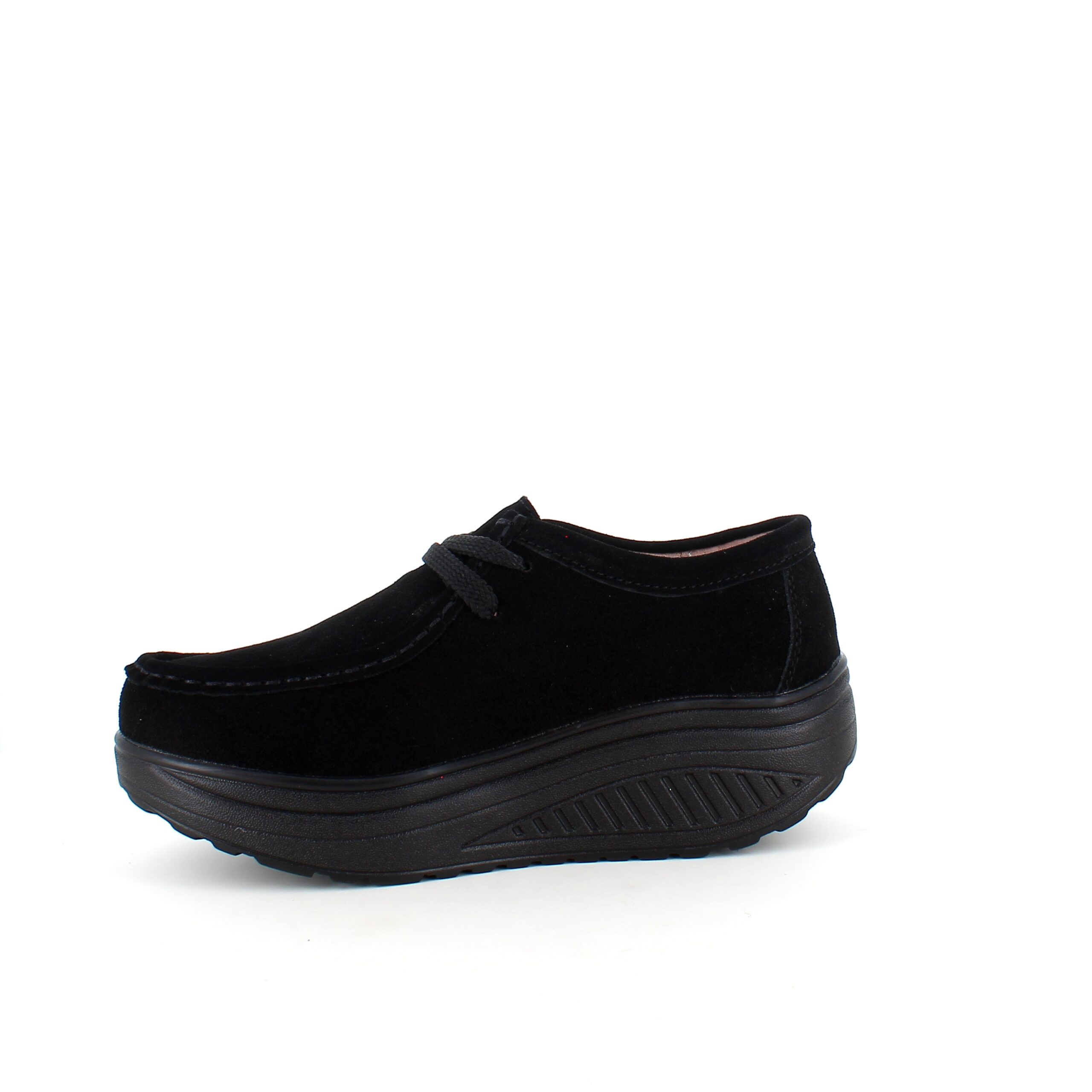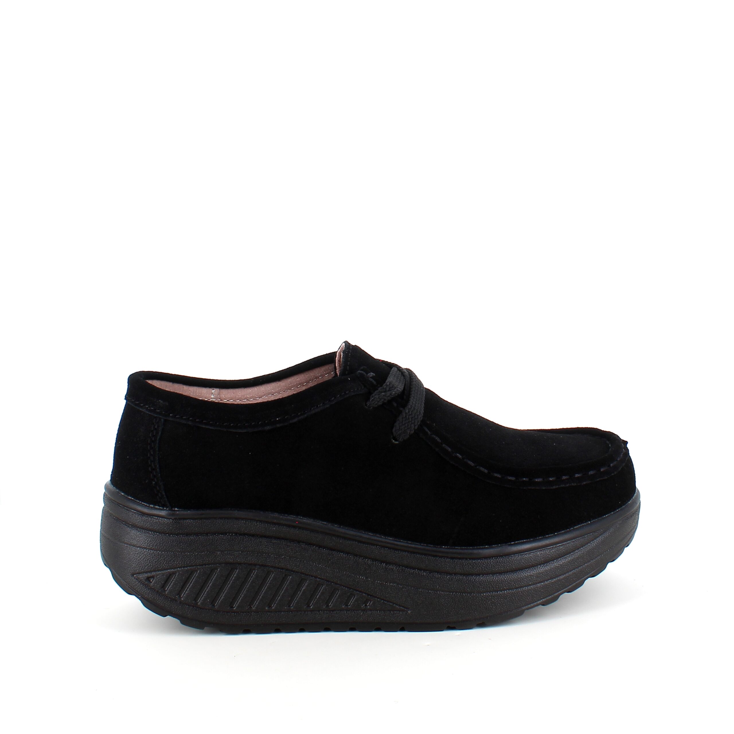 Sort ruskindsko med gængesål og svangstøtte tilbyder både stil og komfort.