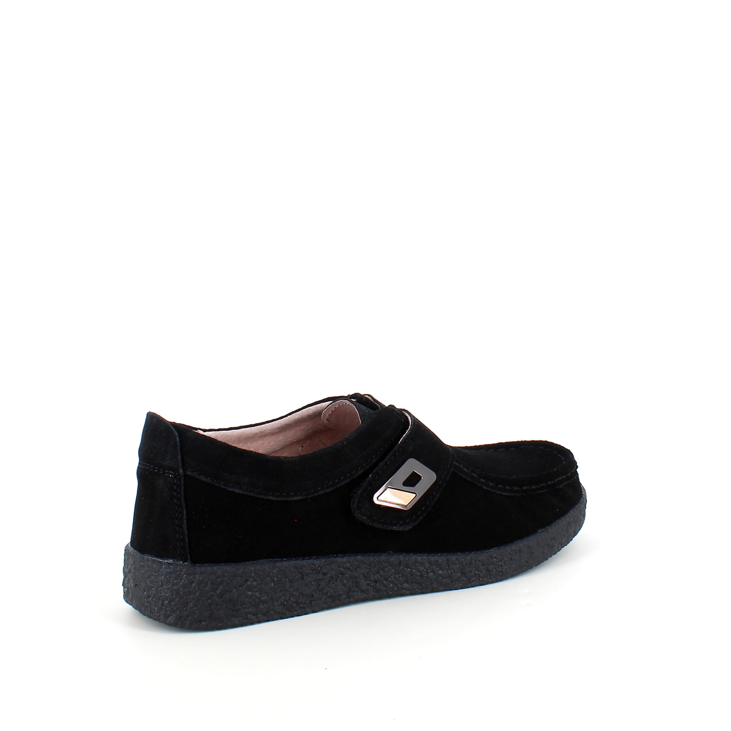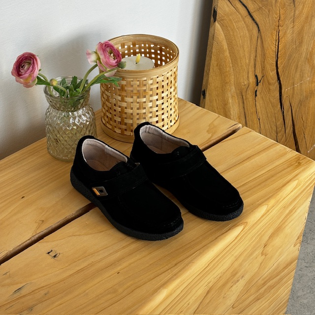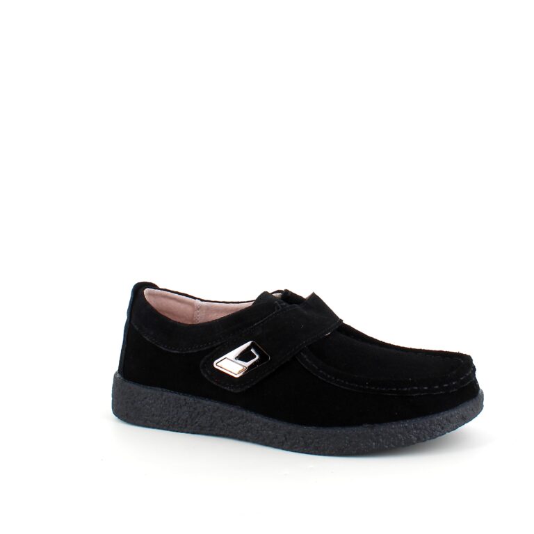 Sort ruskindsko med gummisål har en elegant design med et blankt spænde på velcroremmen.
