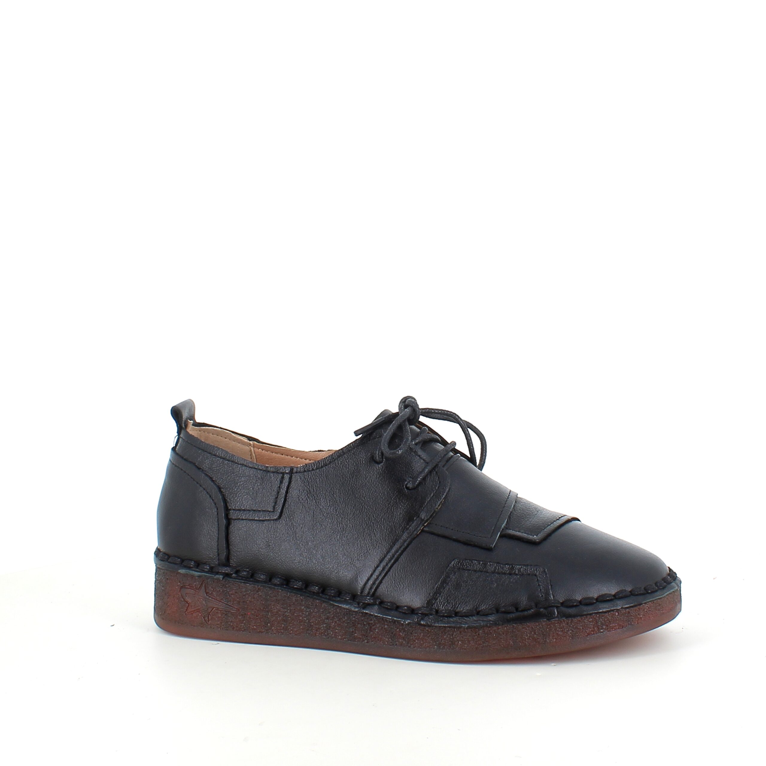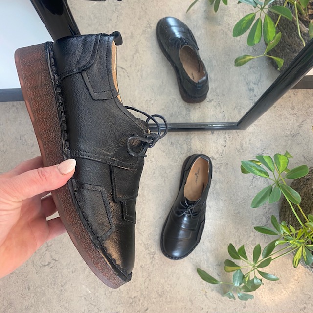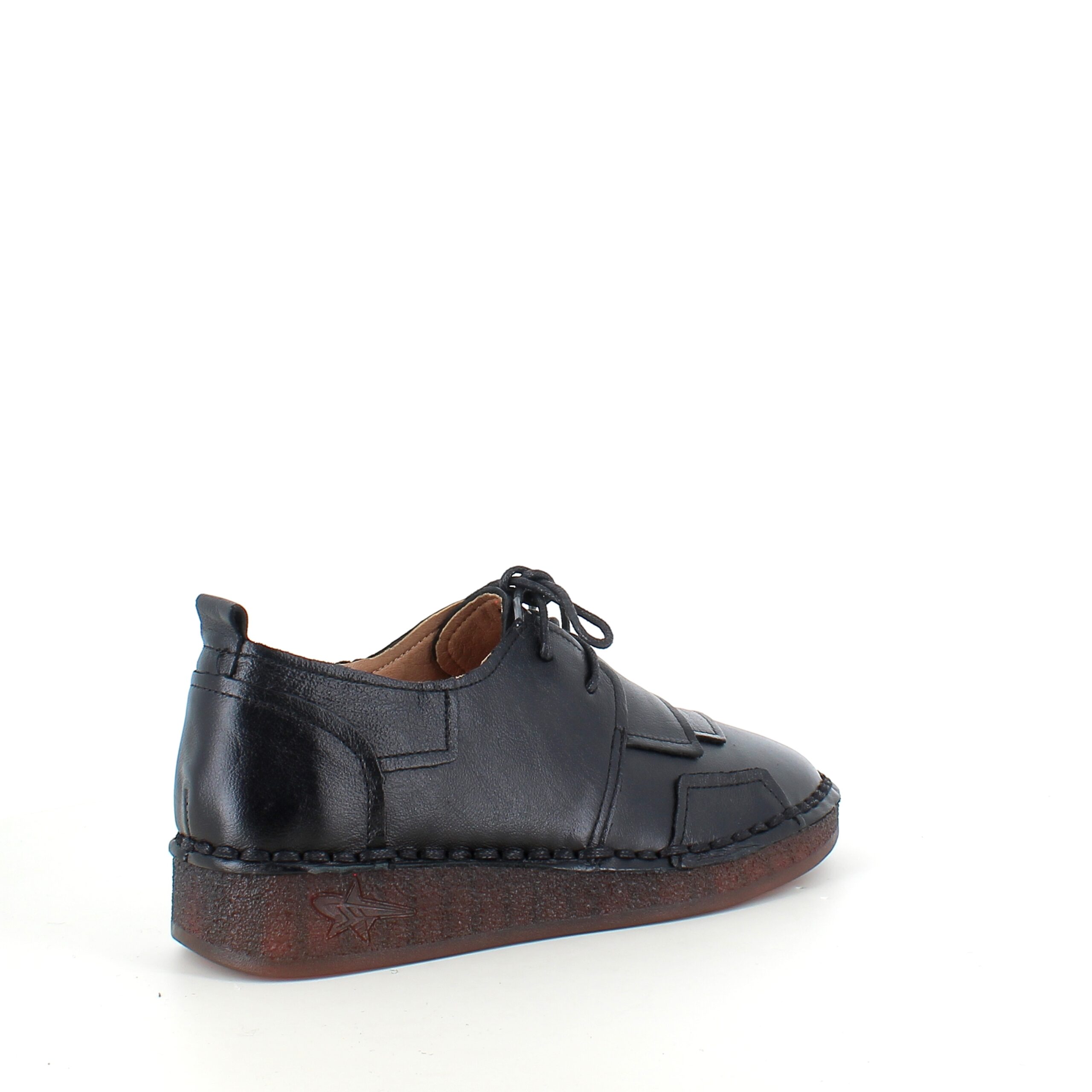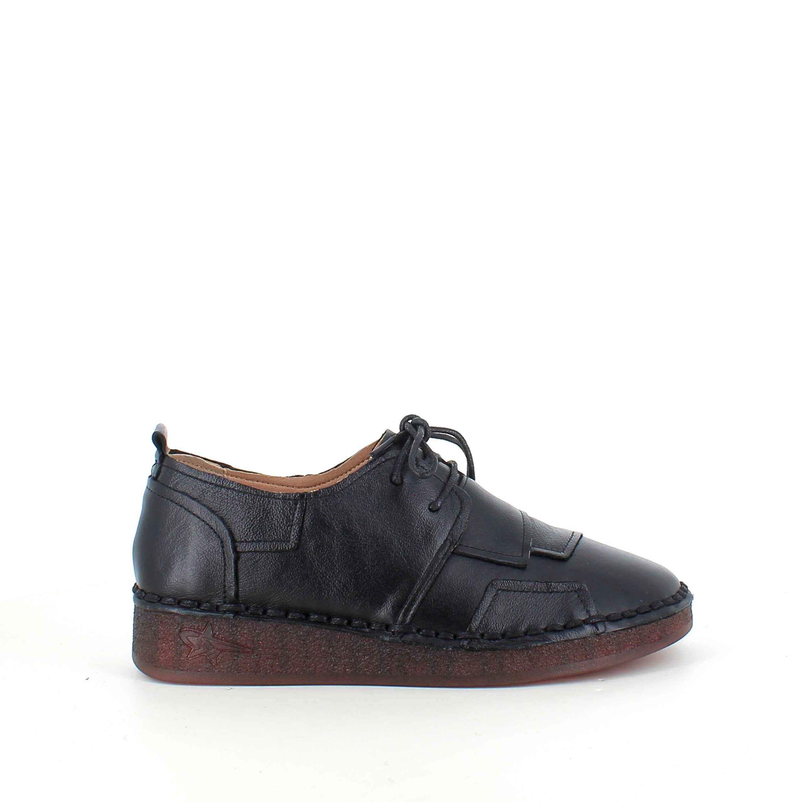 Snøresko i sort skind med flotte detaljer i sammensyningen af skindet på overdelen af skoen