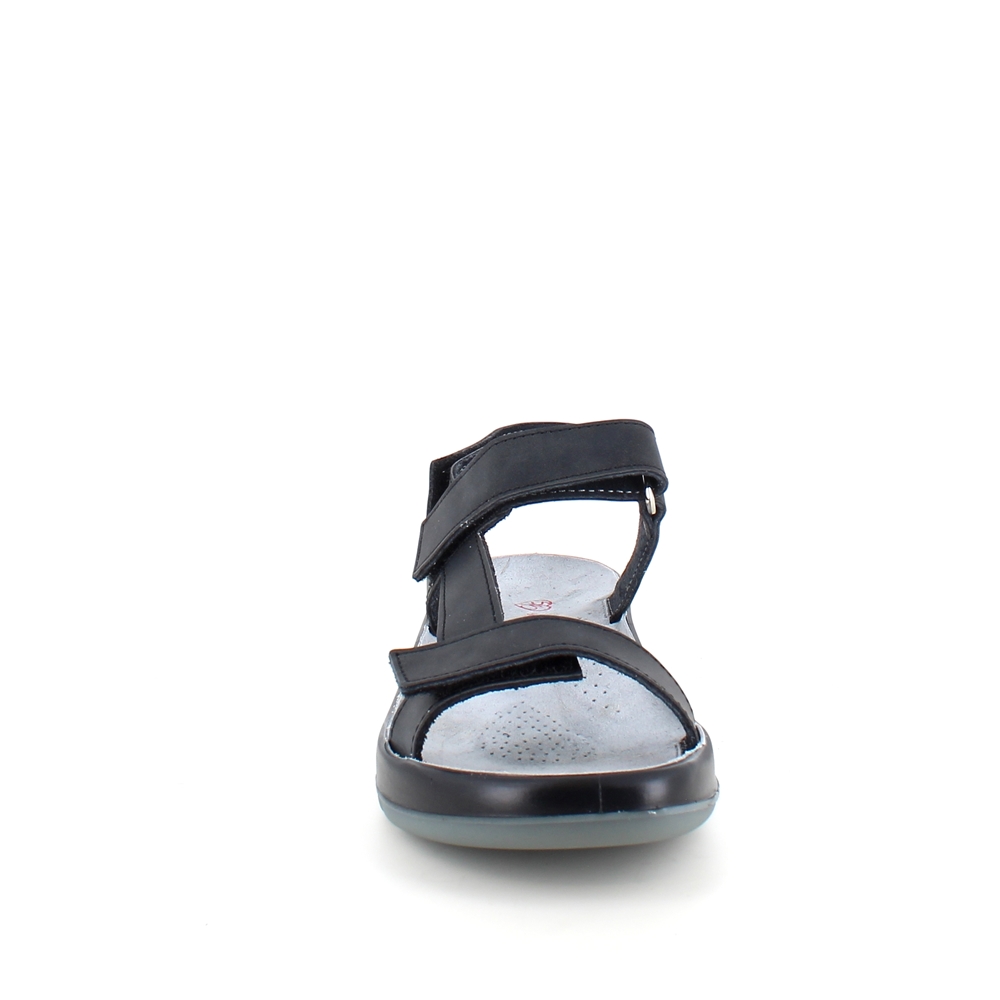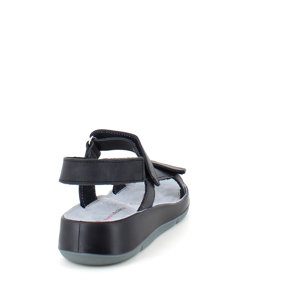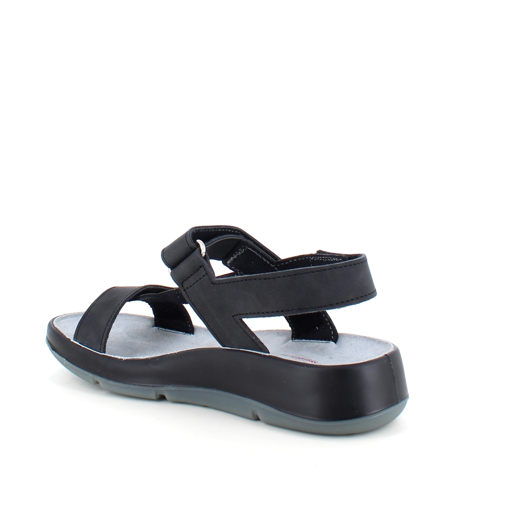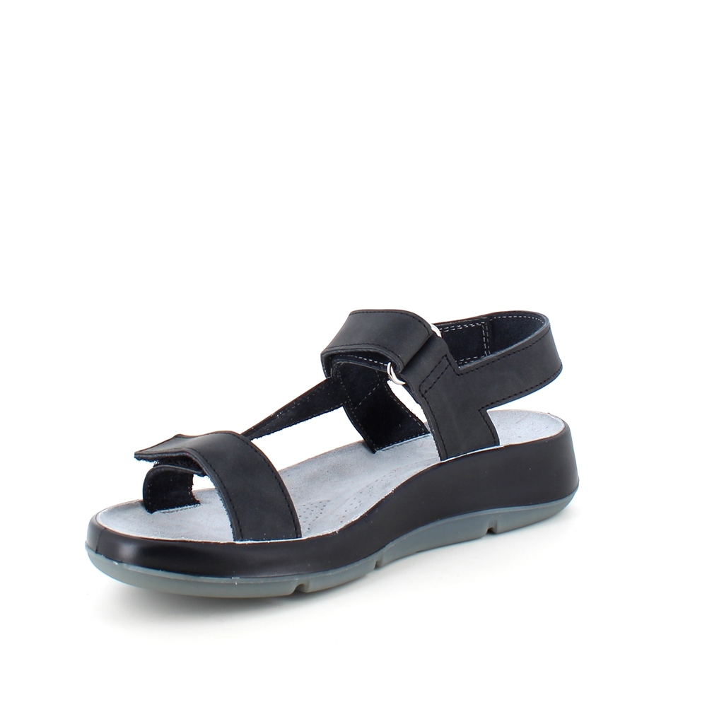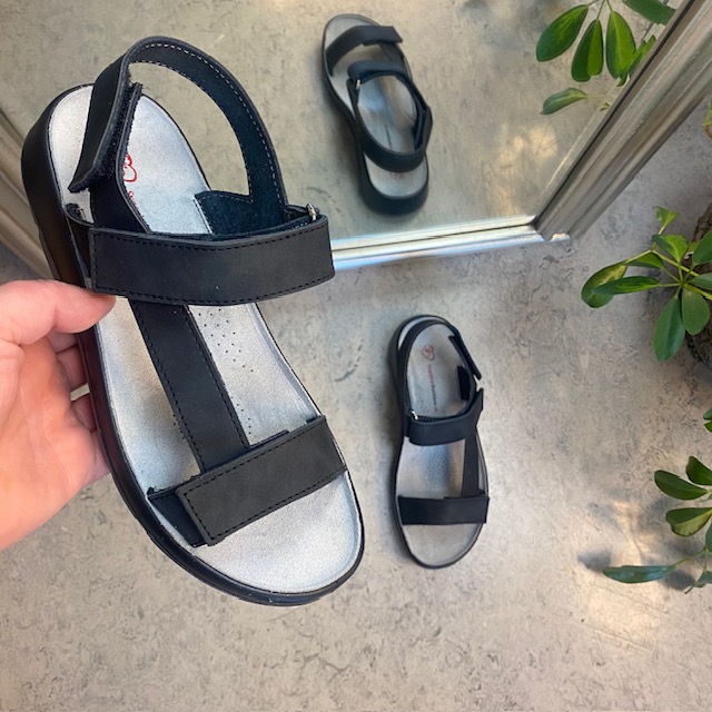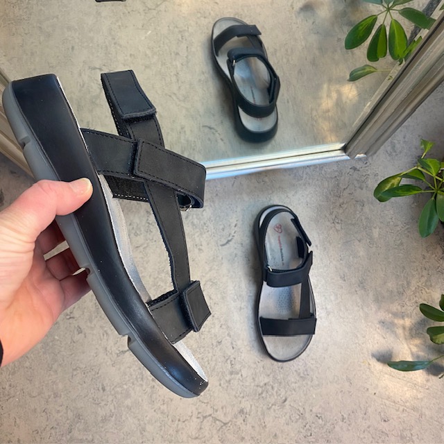 Sort skindsandal med tre justerbare remme og svangstøtte