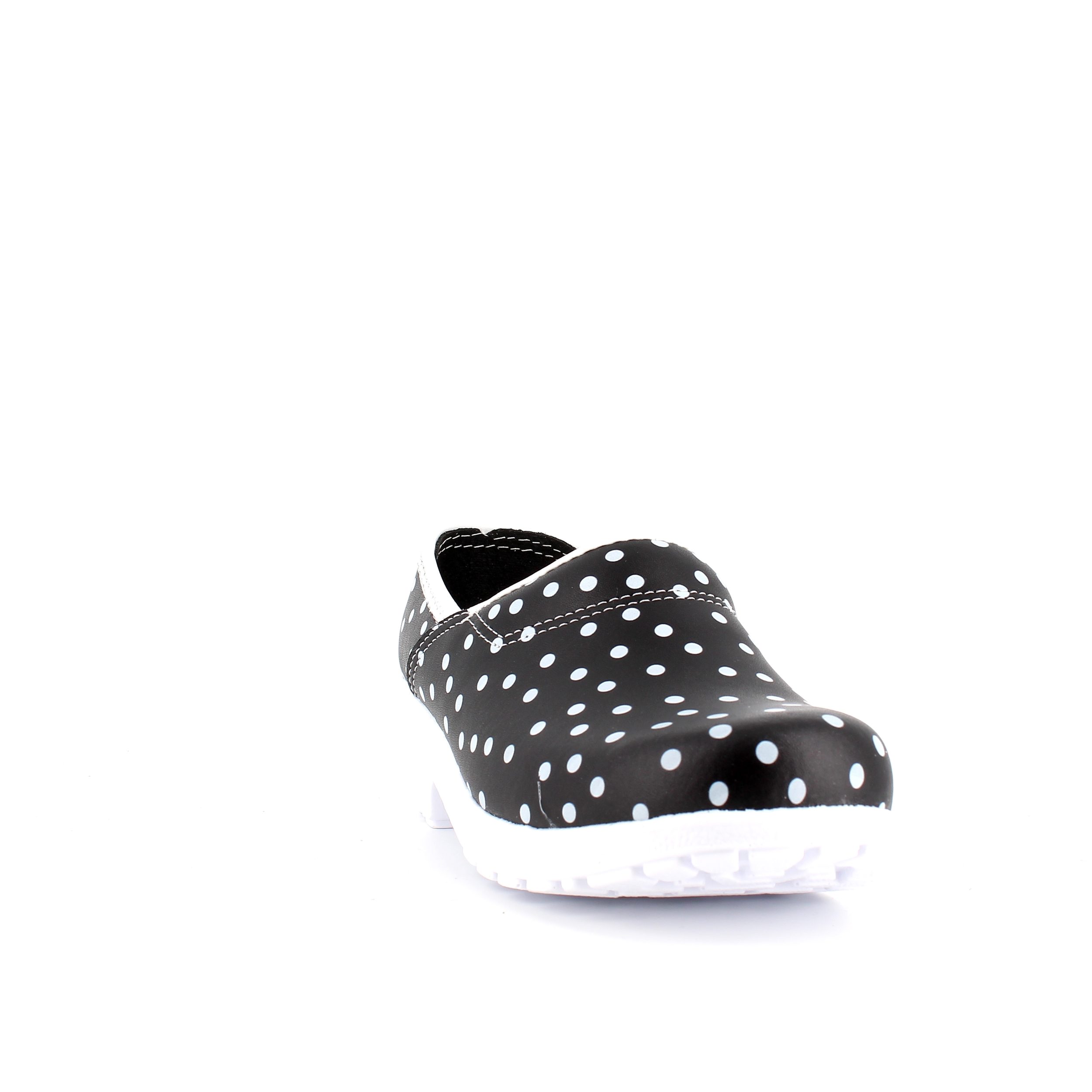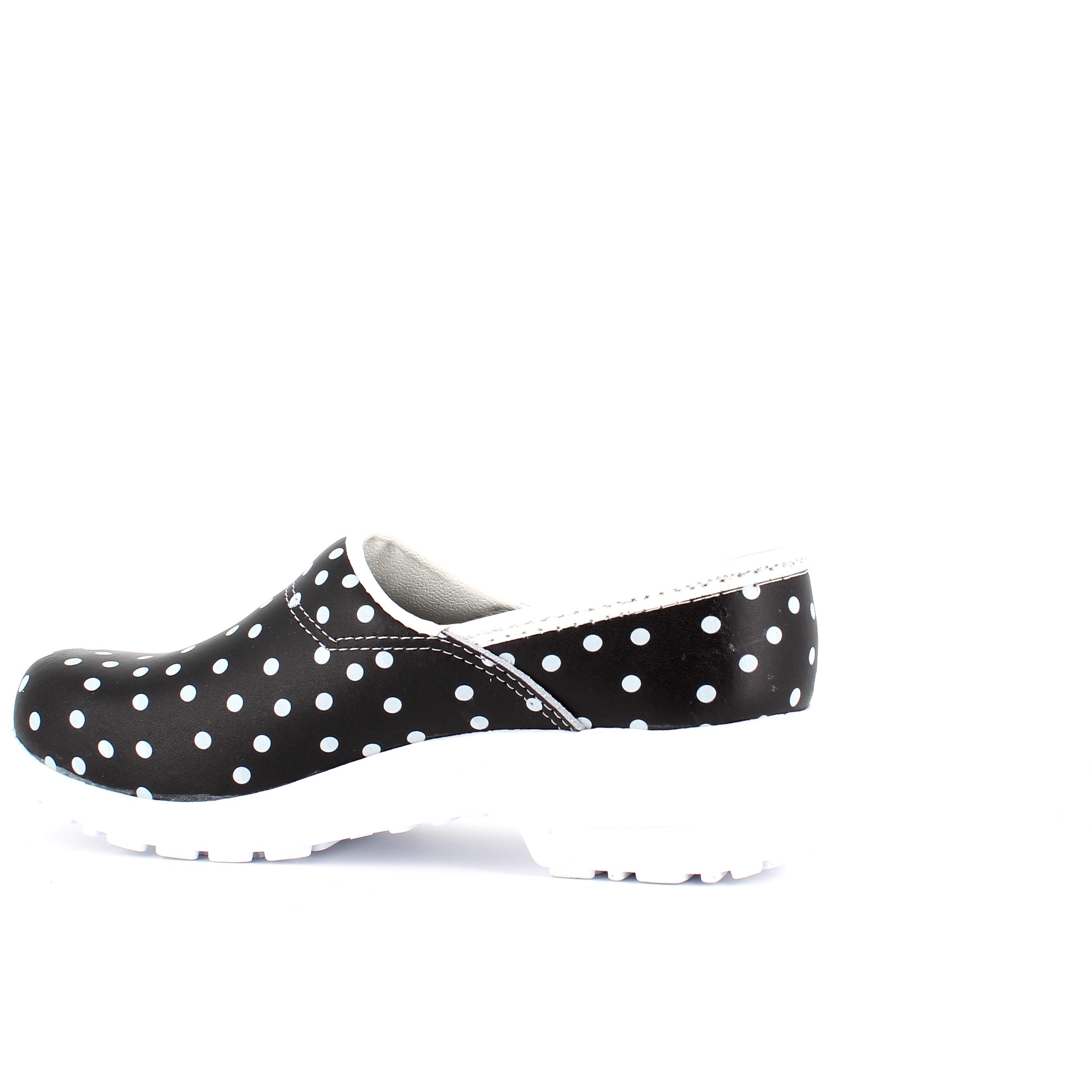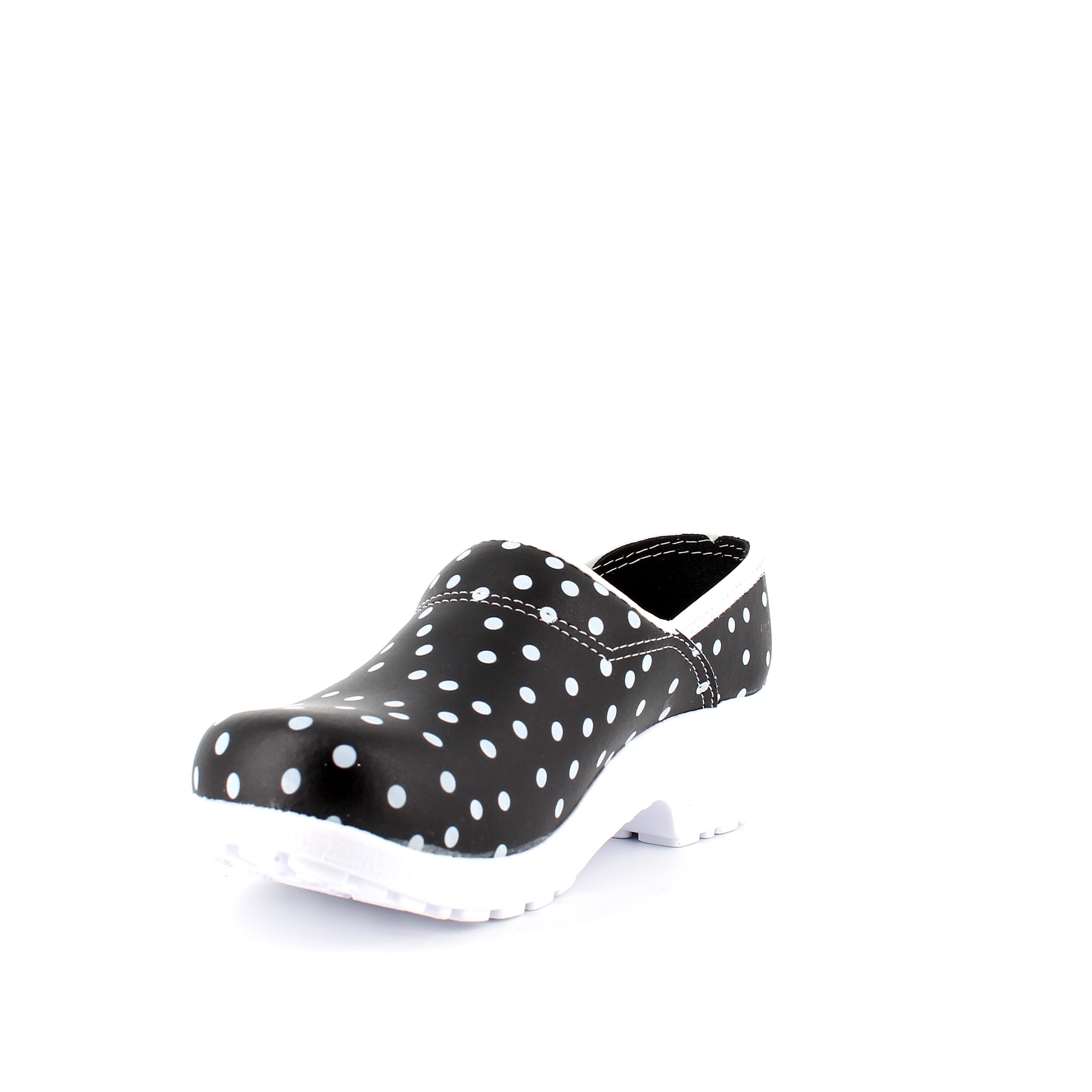 Sorte polkaprikkede træsko i dansk kvalitet.