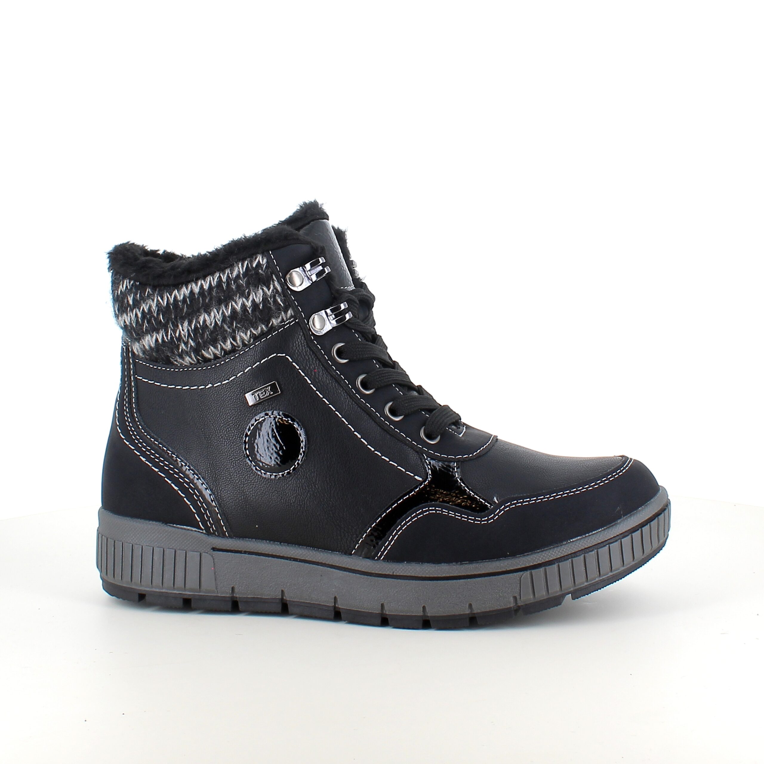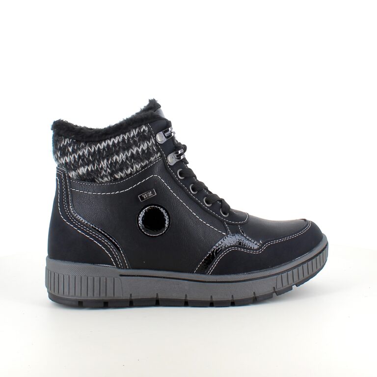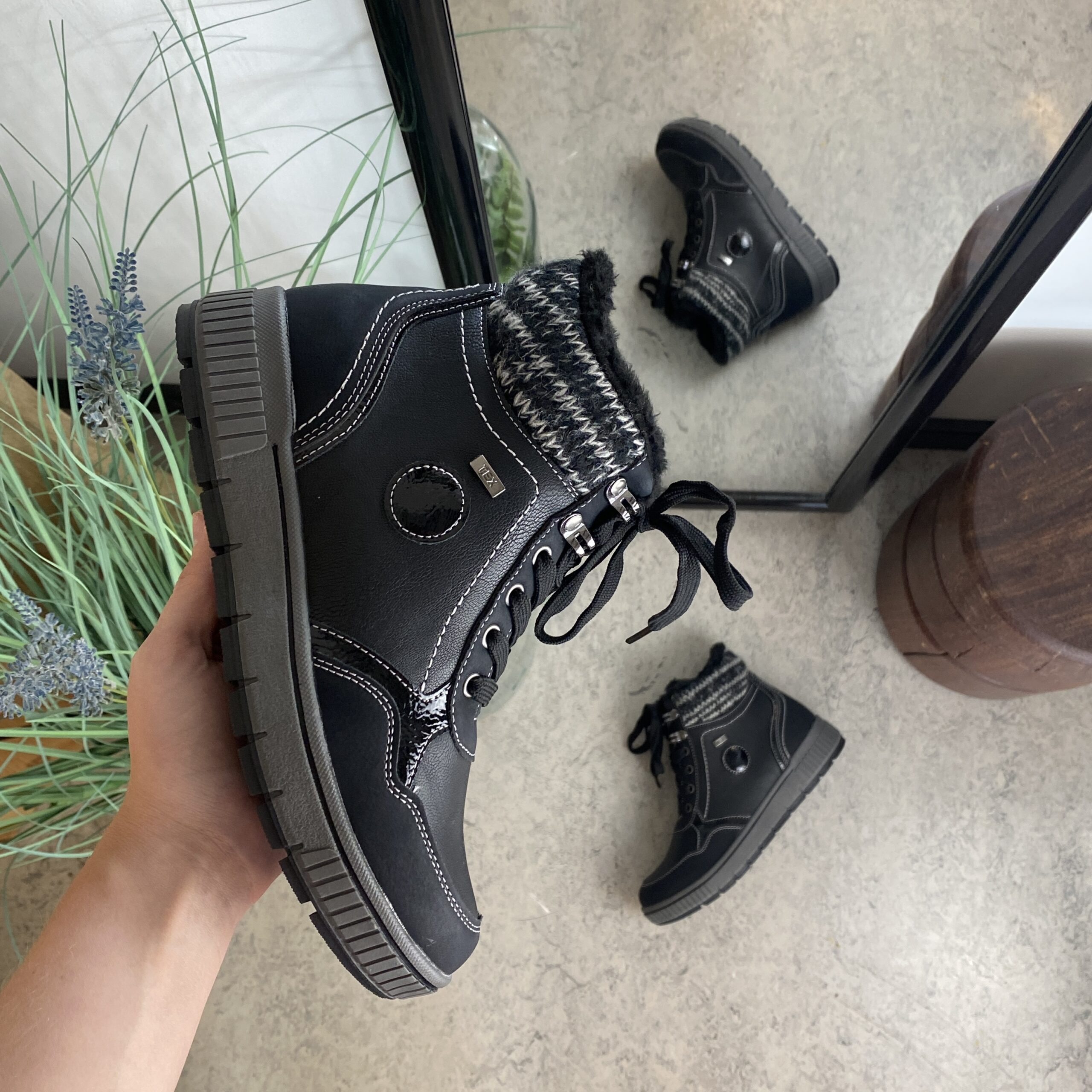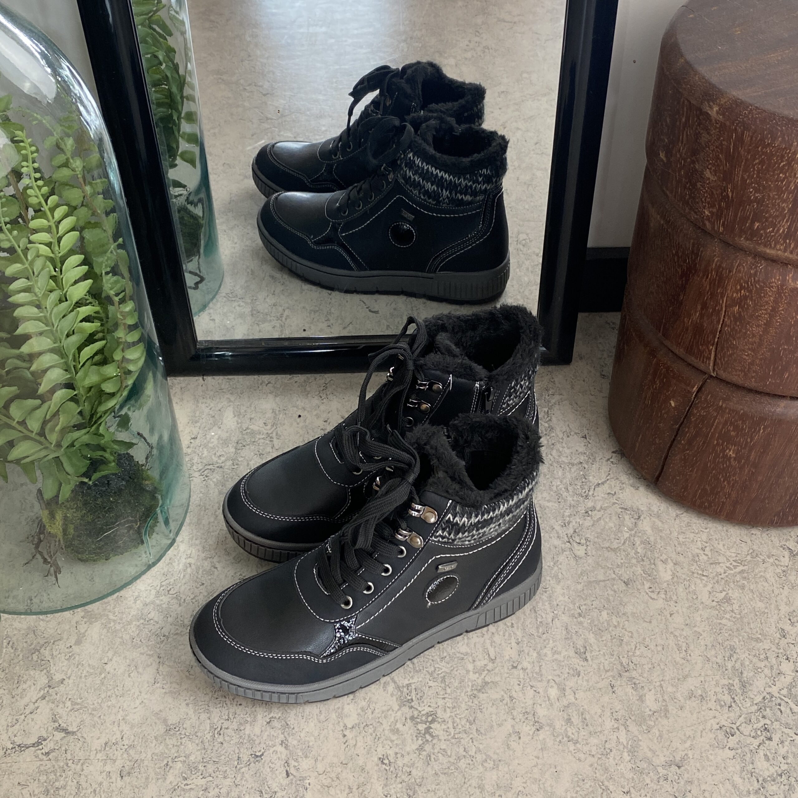 Vinterstøvle i sort, med strikket detalje på skaftet.