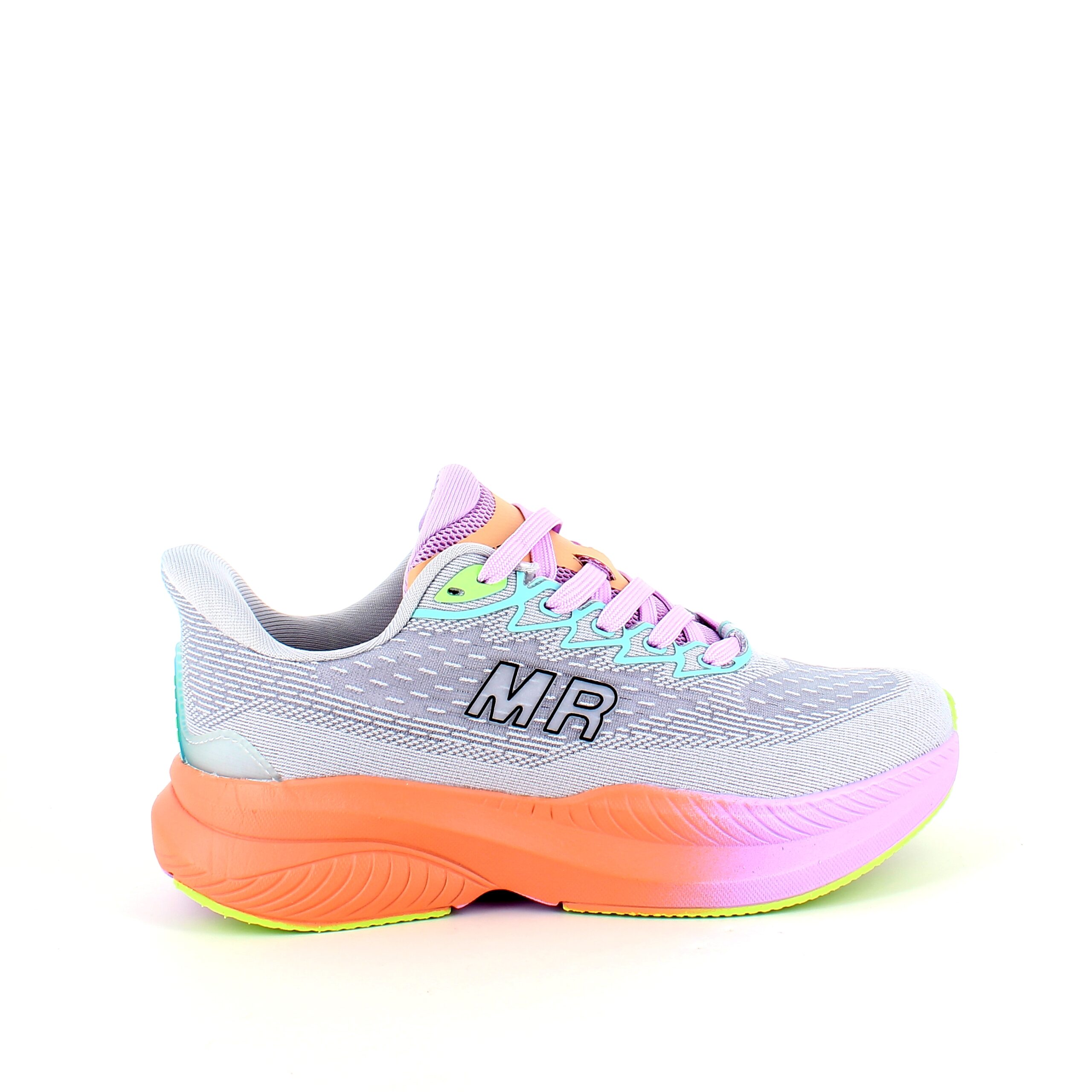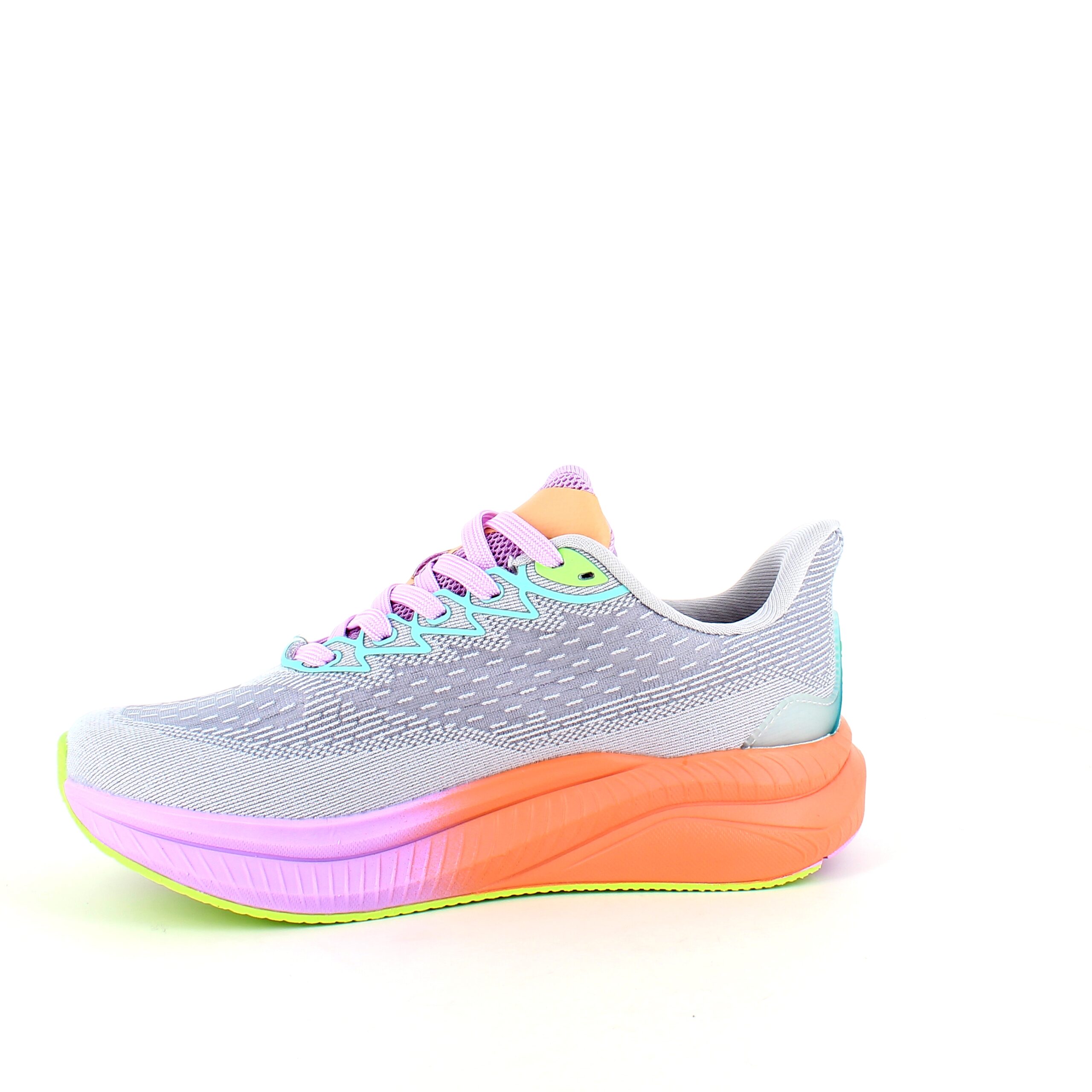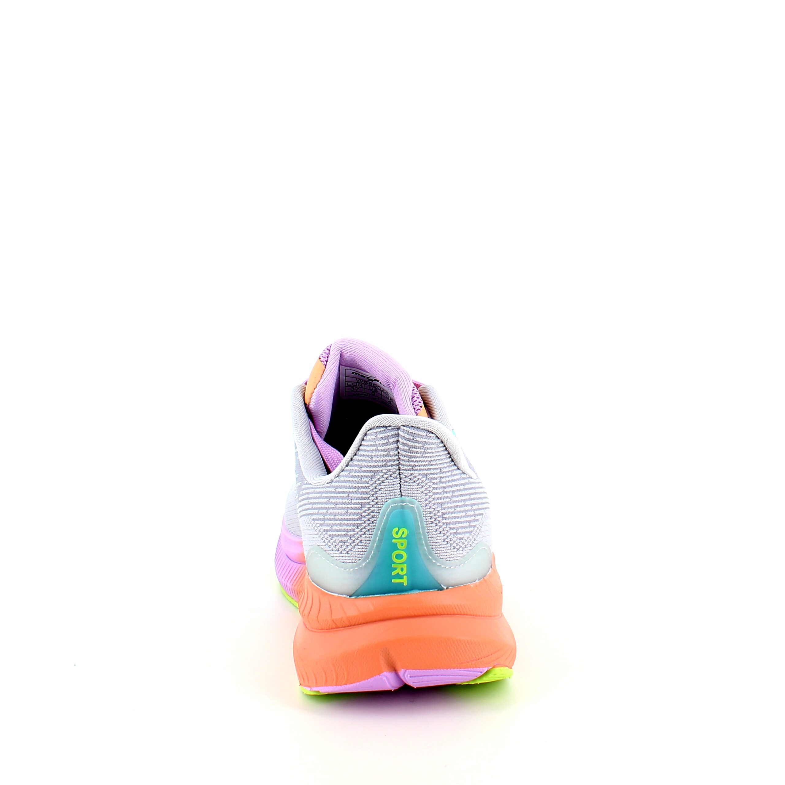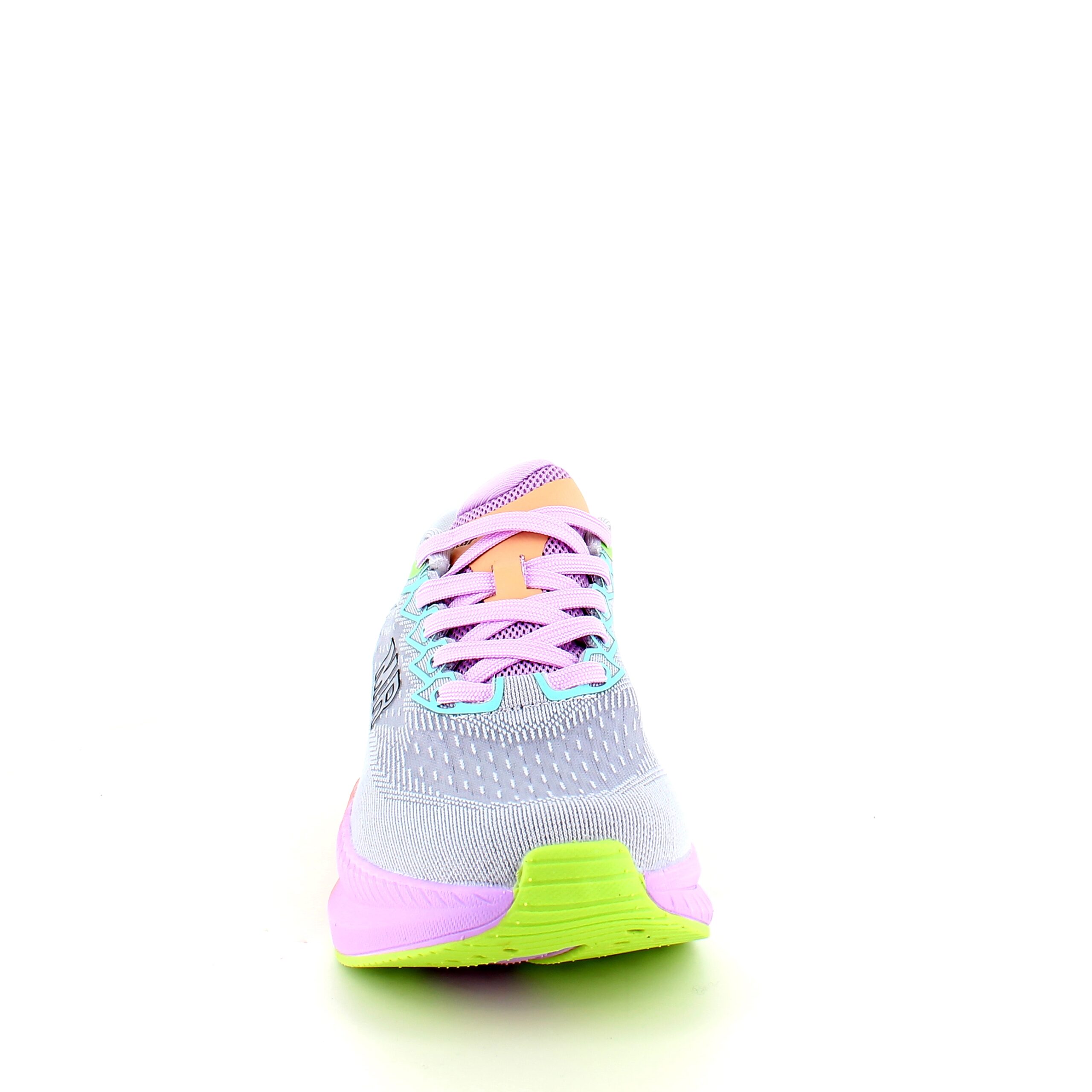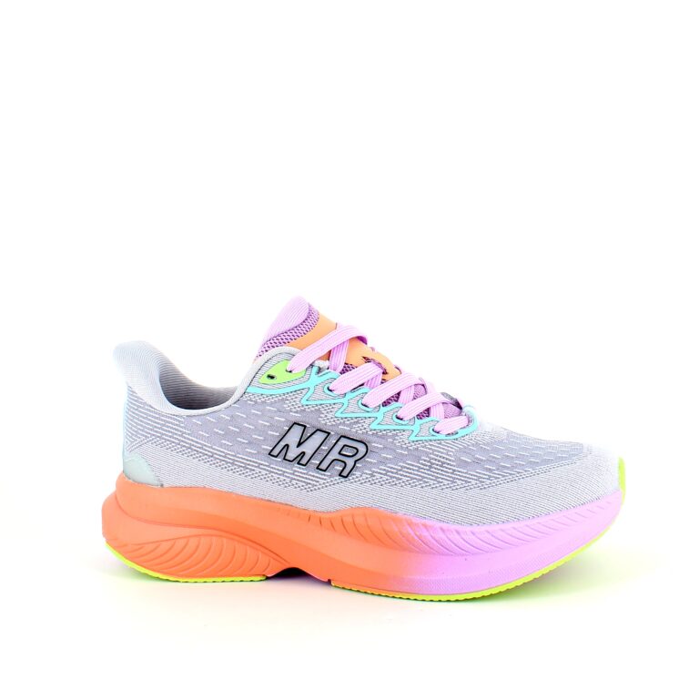 Disse sporty letvægtssko kombinerer en stilren grå overdel med iøjnefaldende lilla snørebånd, hvilket giver et moderne udtryk.