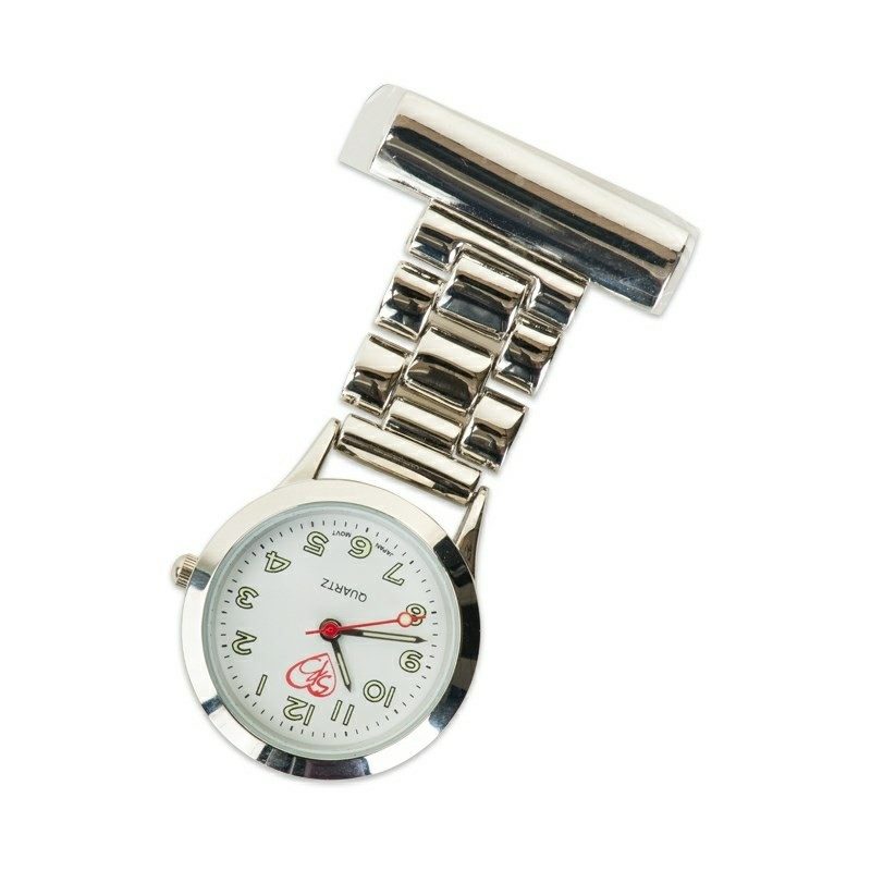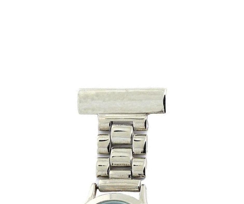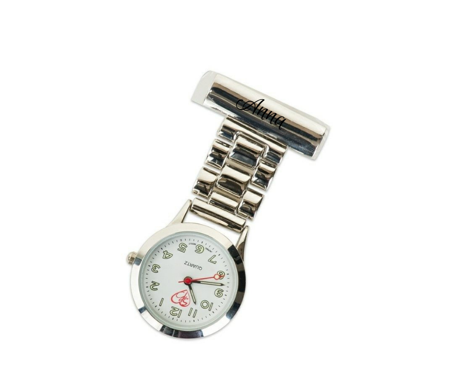 Bredt sygeplejeur i stål som er 6 cm langt og 3,5 cm bredt. Uret fås både i guld og stål.
