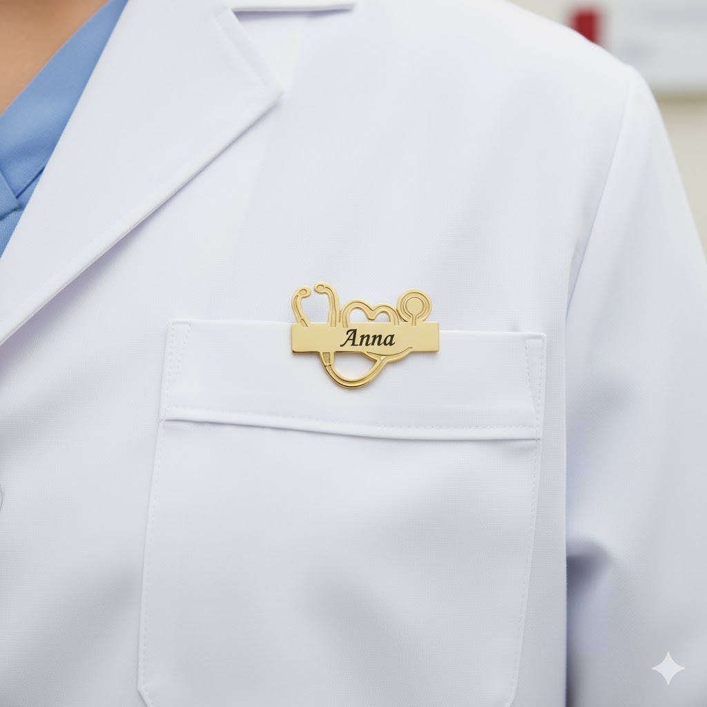 Dette elegante navneskilt i guldfarvet rustfrit stål er designet med et unikt stetoskopmotiv, der danner et hjerte – et symbol på omsorg, faglighed og kærlighed til sundhedsarbejdet. Skiltet er perfekt til sygeplejersker, læger, SOSU’er og andet sundhedspersonale, der ønsker et professionelt, men personligt udtryk i deres uniform.