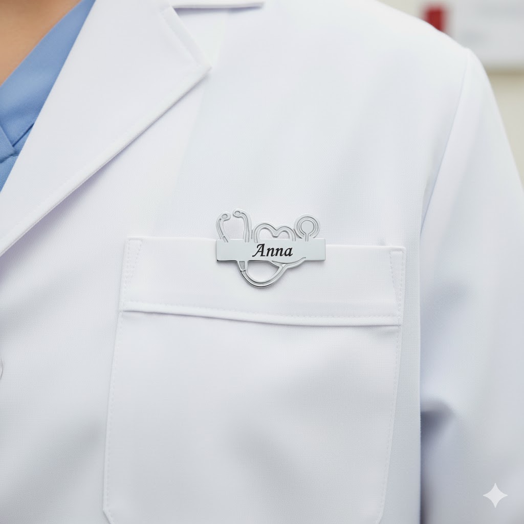 Dette elegante navneskilt i sølvfarvet rustfrit stål er designet med et unikt stetoskopmotiv, der danner et hjerte – et symbol på omsorg, faglighed og kærlighed til sundhedsarbejdet. Skiltet er perfekt til sygeplejersker, læger, SOSU’er og andet sundhedspersonale, der ønsker et professionelt, men personligt udtryk i deres uniform.