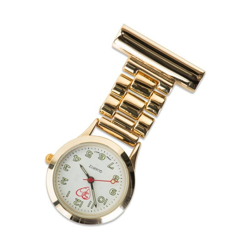Kvalitets guldtonet ur med bred lænke. Sygeplejeuret er smart, og der er selvlysende punkter i urskiven. Uret er 6 cm langt og 3,5 cm bredt. Dette sygeplejeur findes også i stål.