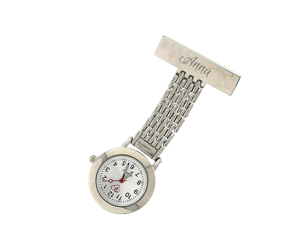 Det flotte sølv sygeplejeur med bred lænke og du kan tilkøbe gravering. Det er en personlig gave til dig selv eller en, du holder af. Vi graverer på den brede vedhæftning.