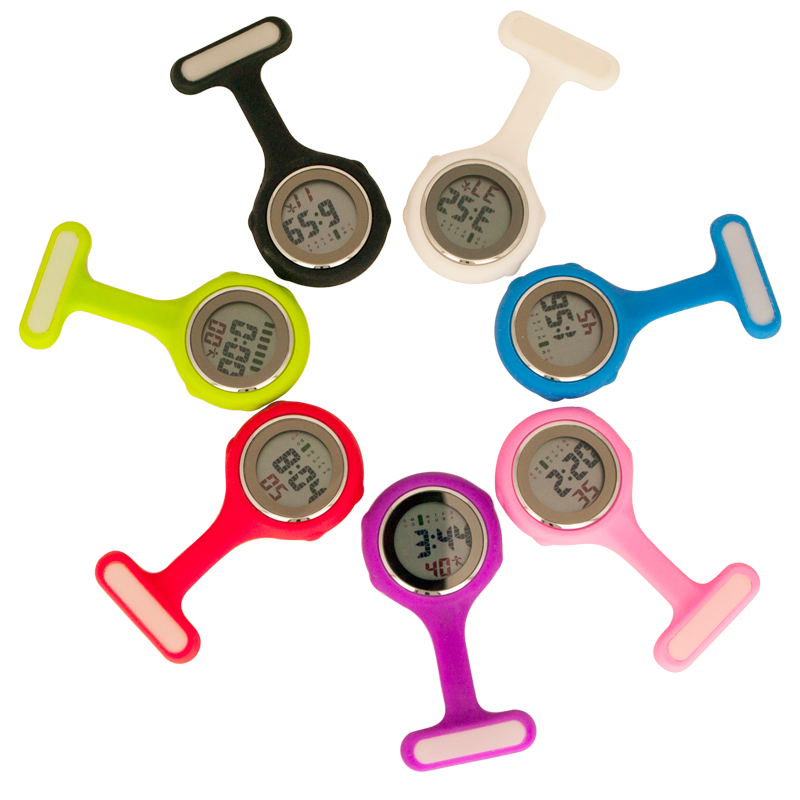 – Digital ur med pulstæller i silikone og fåes i farverne rød, blå, sort, lilla, lyserød, grøn eller hvid.
