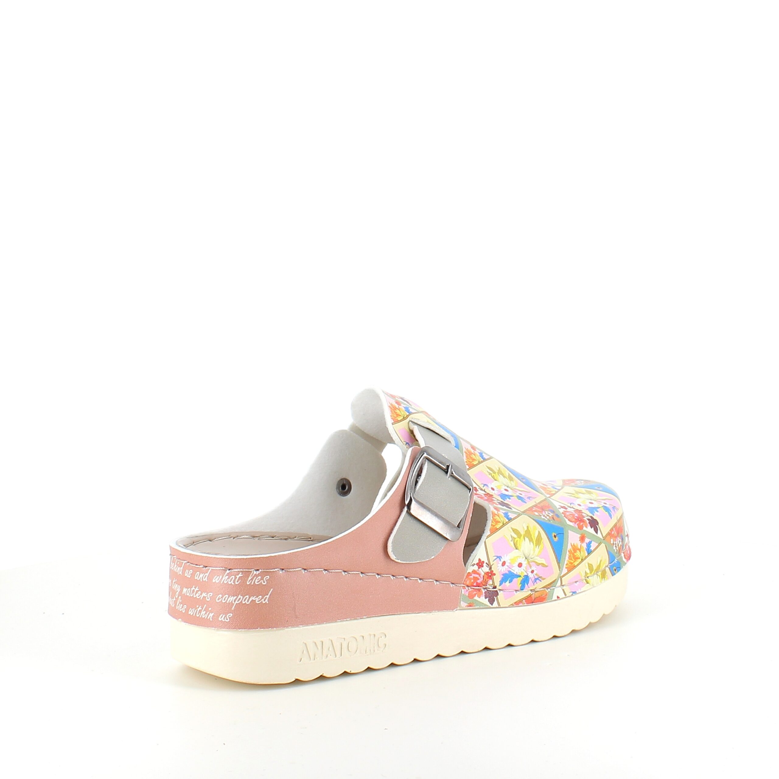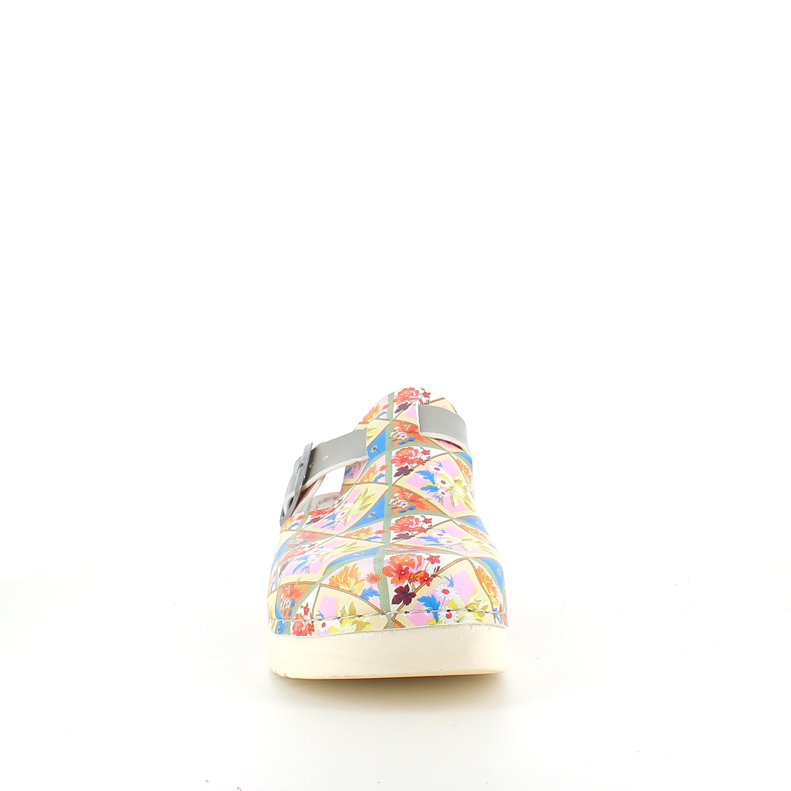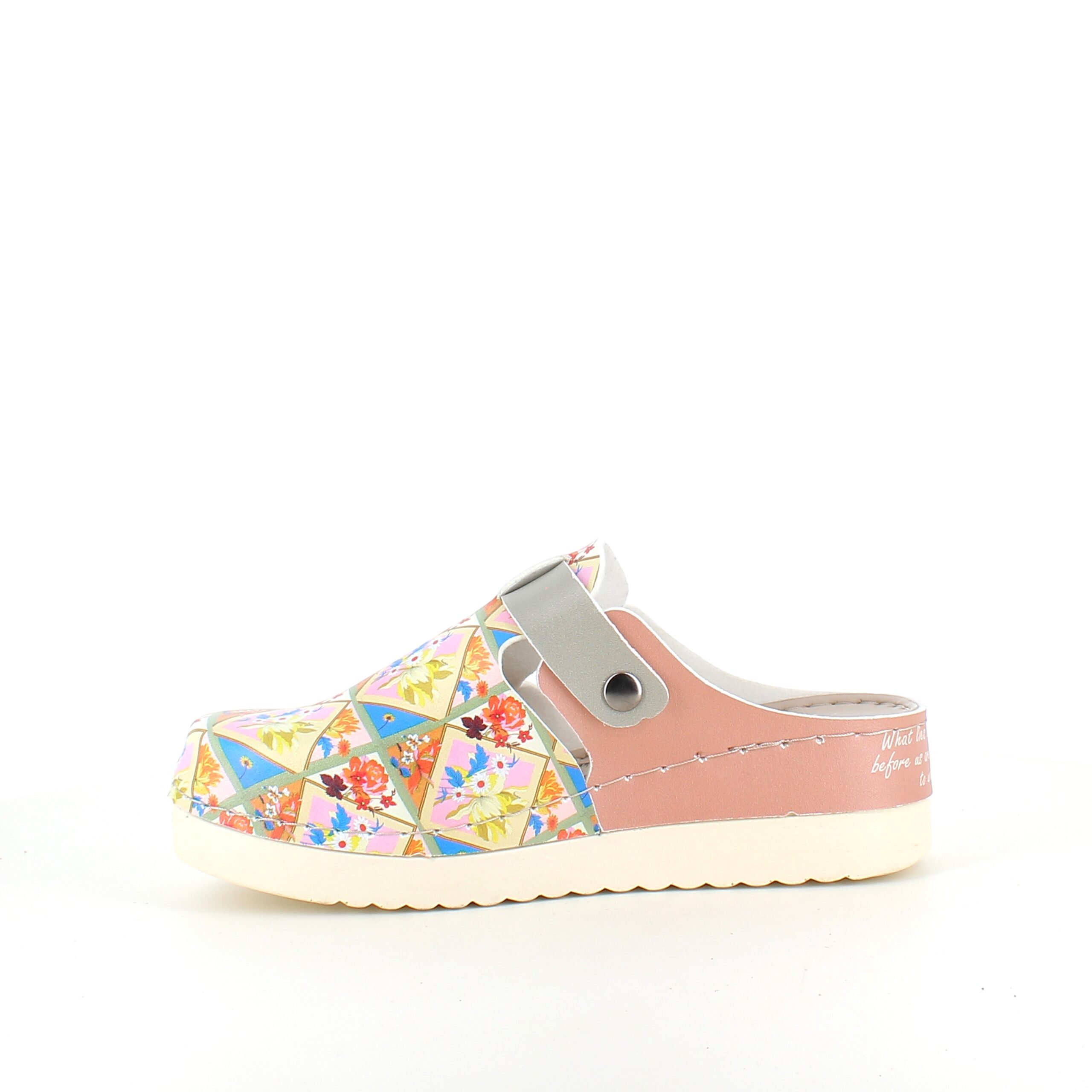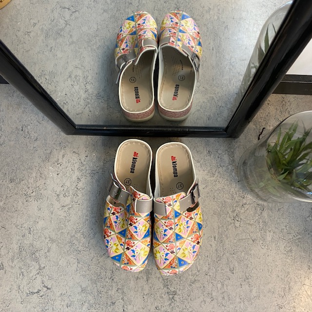 Træskoene har et blomster-print på overdelen.