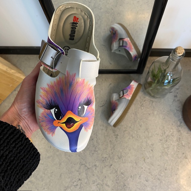Træsko med print af en glad struds