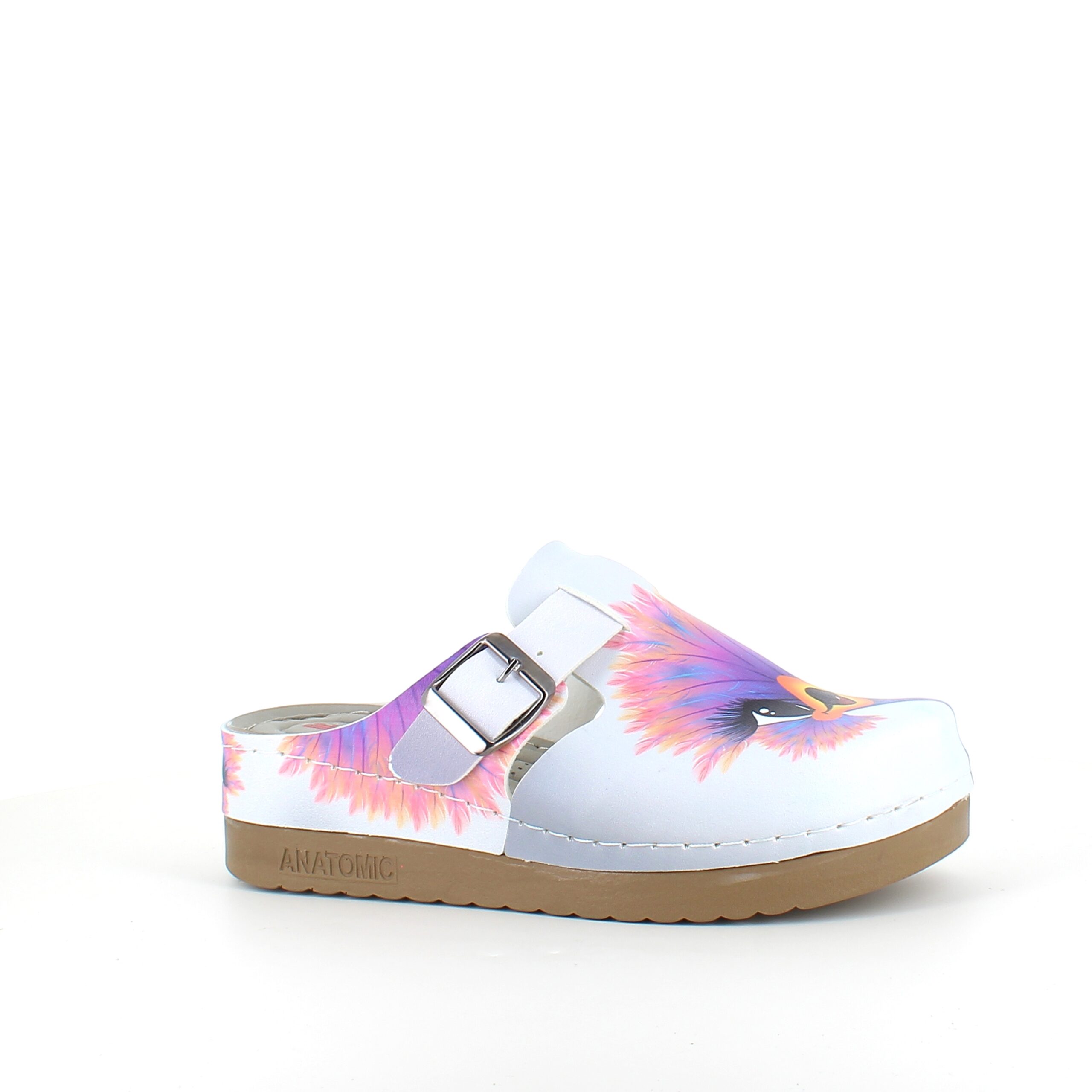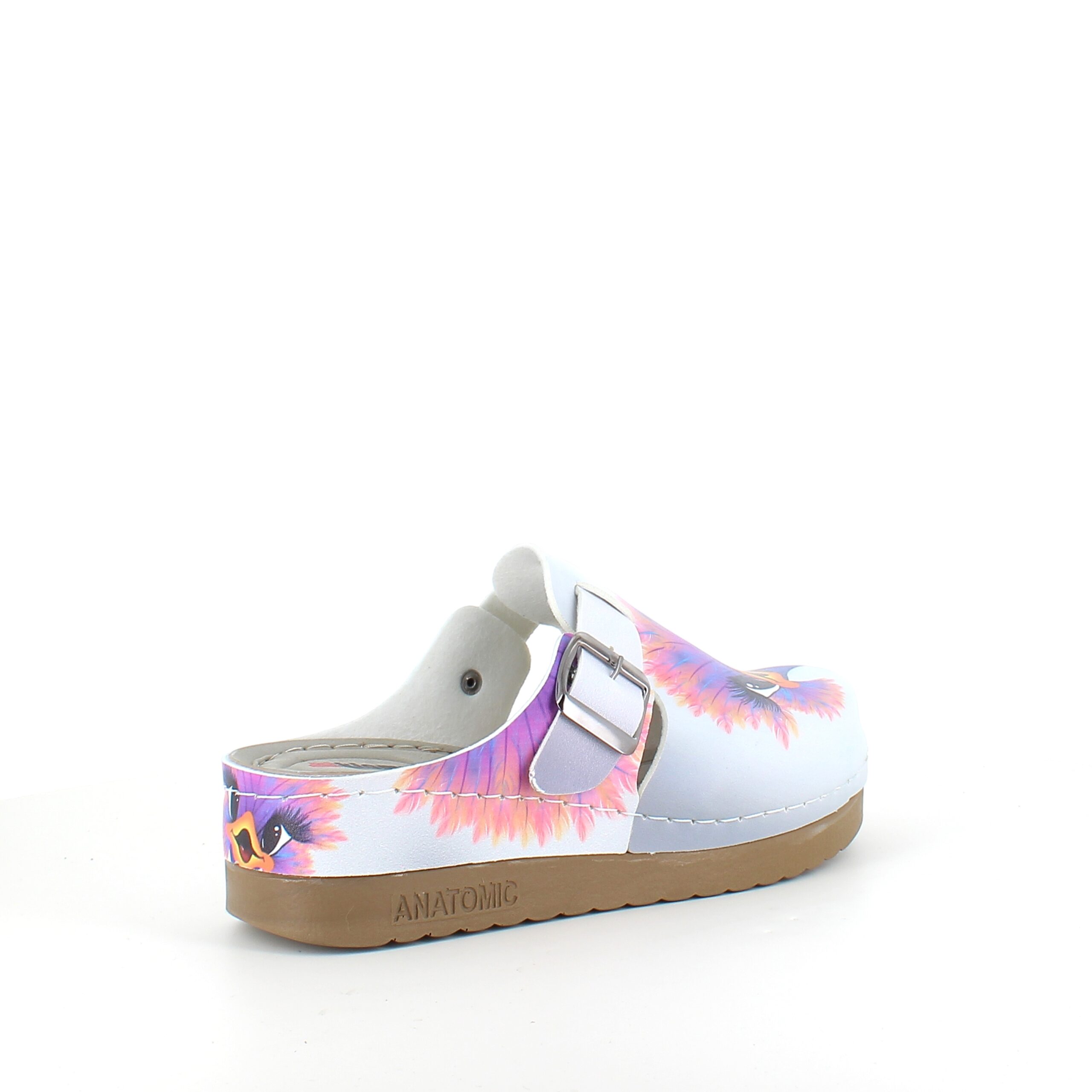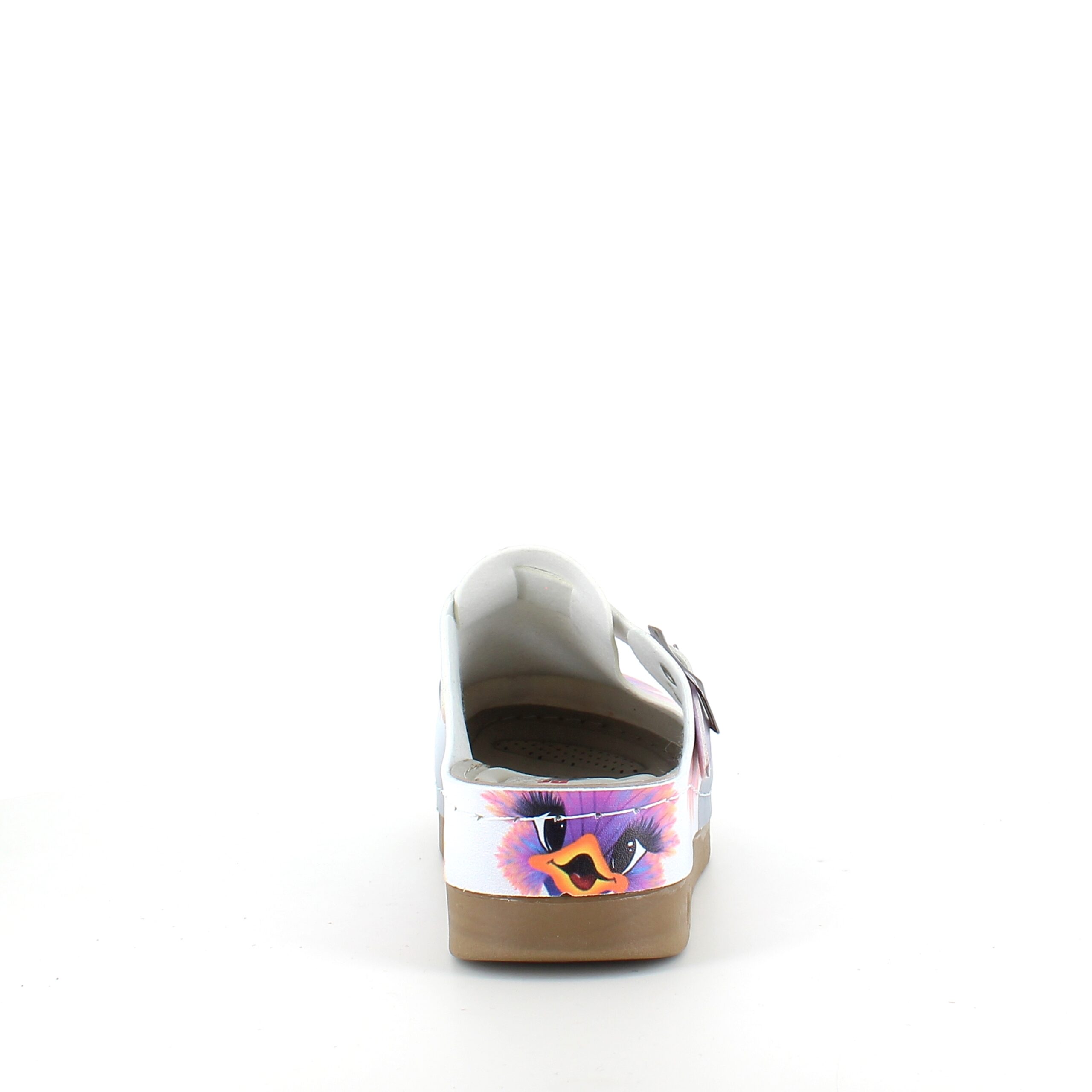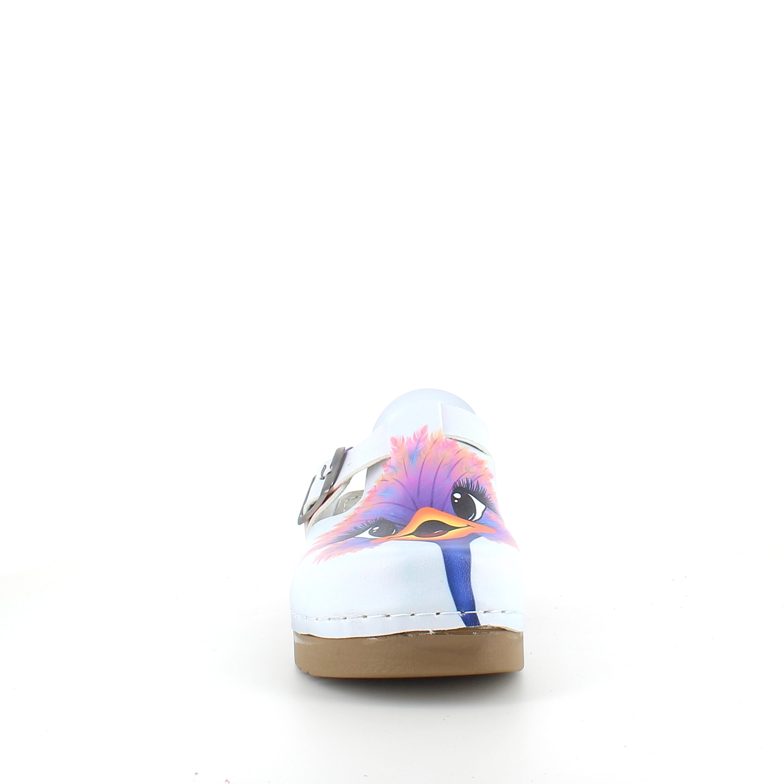 Træskoene har et print af en glad struds på overdelen.