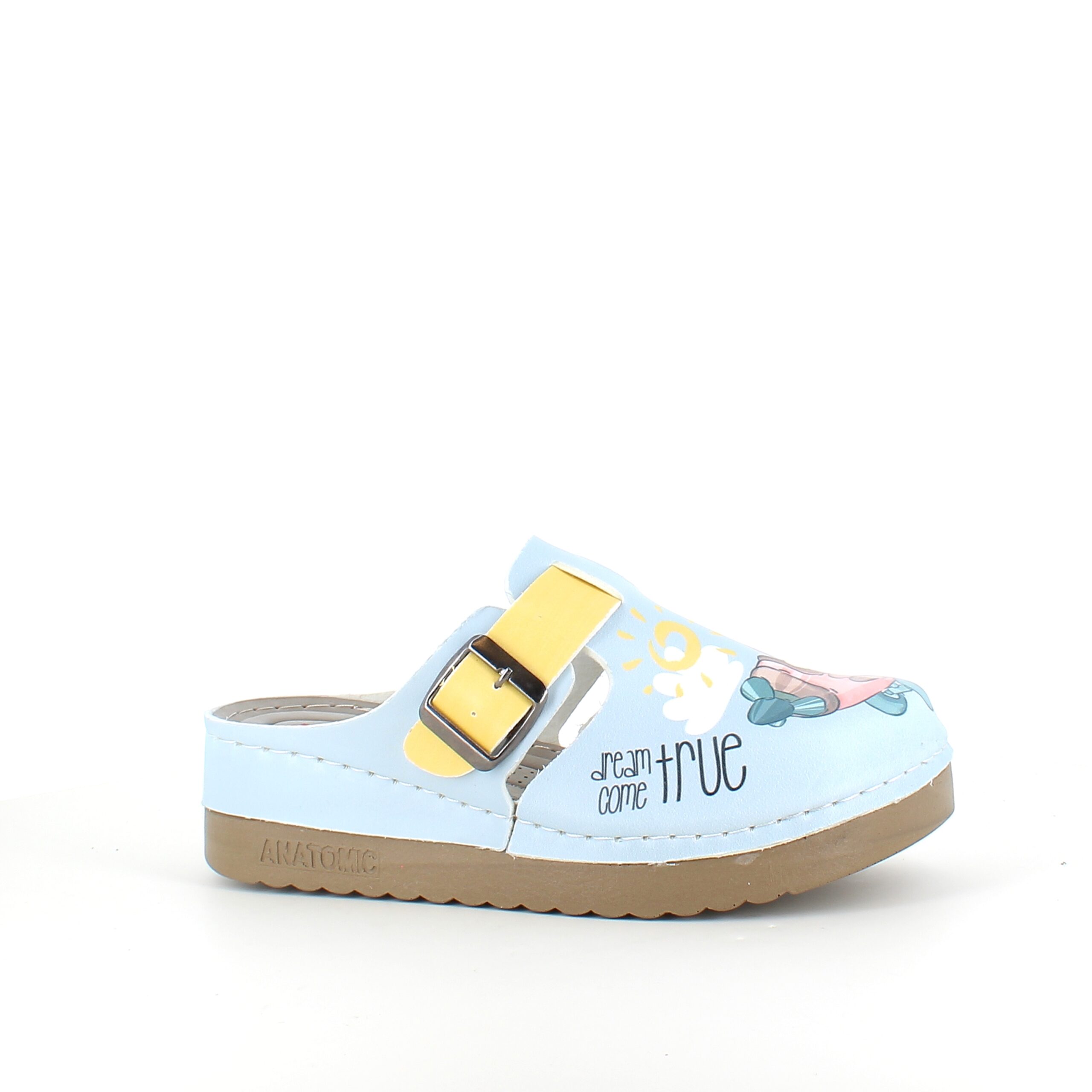 Citat på højre træsko: “Dream come true” på venstre træsko: “Happy time”