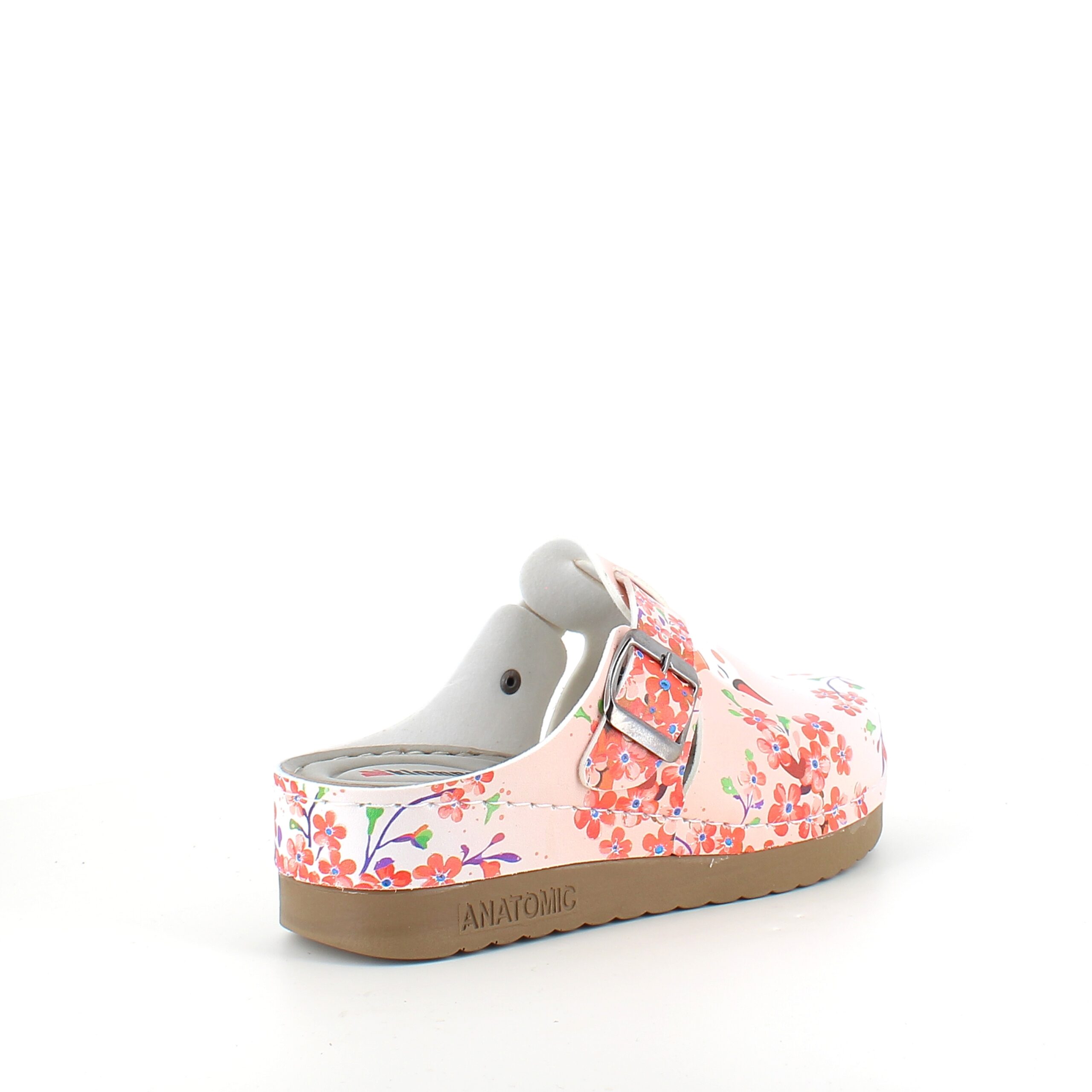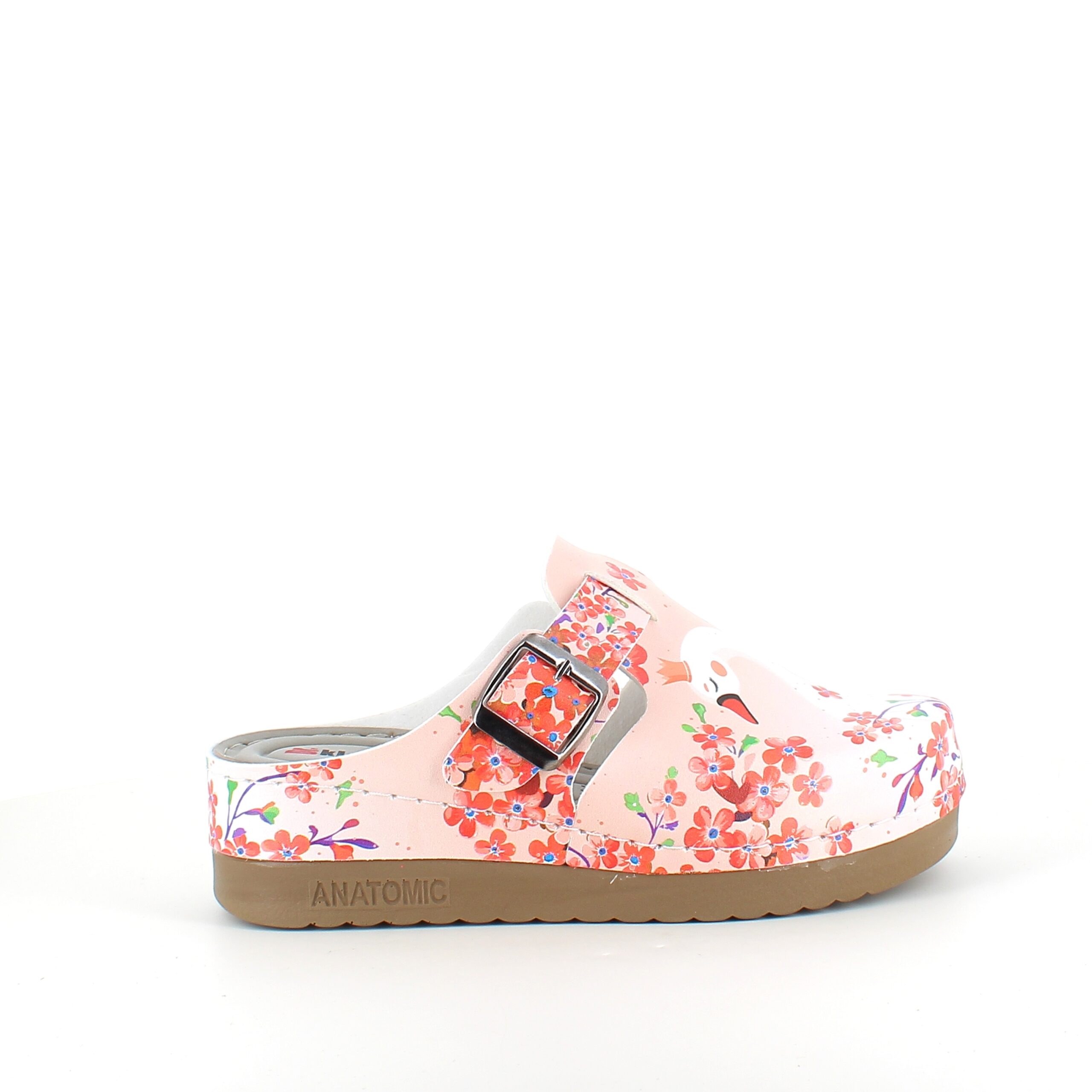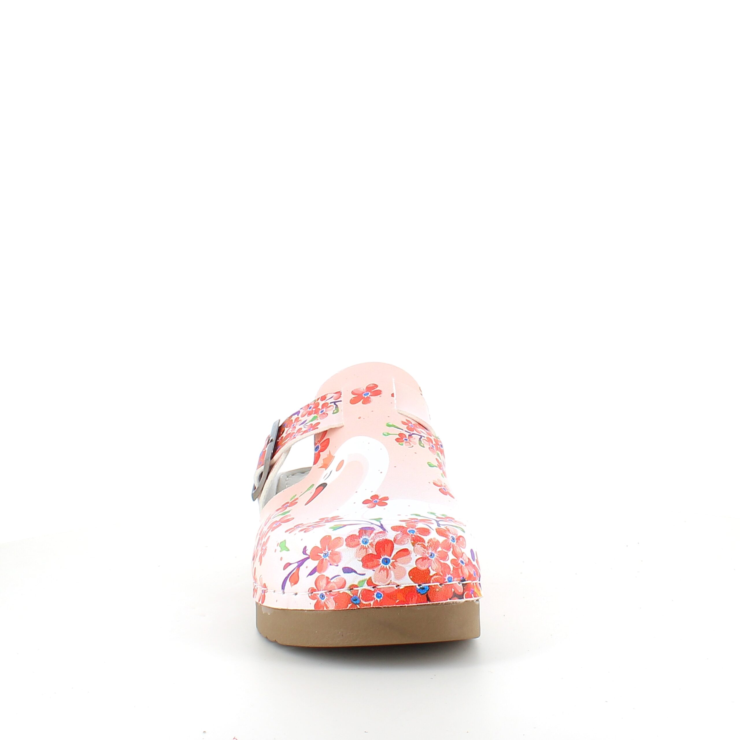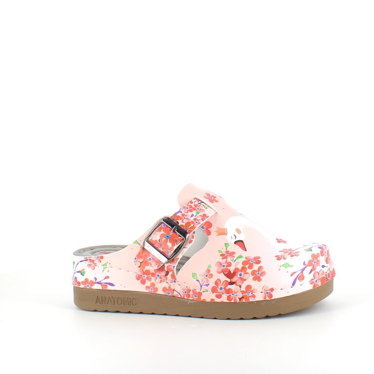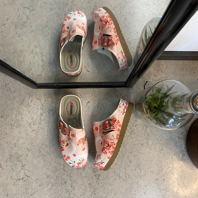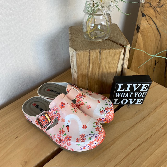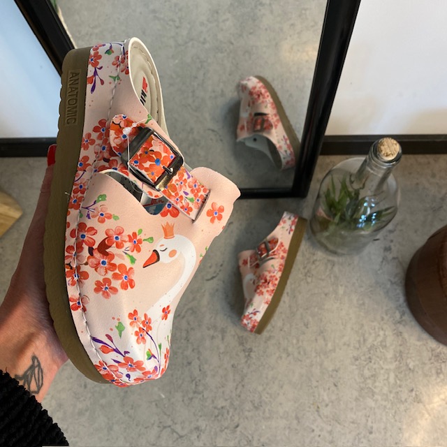 Træskoene har et svane-print på overdelen.