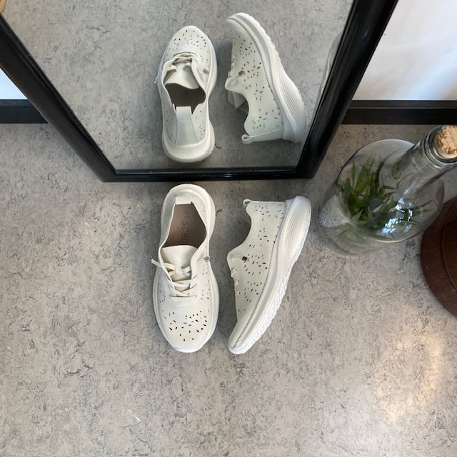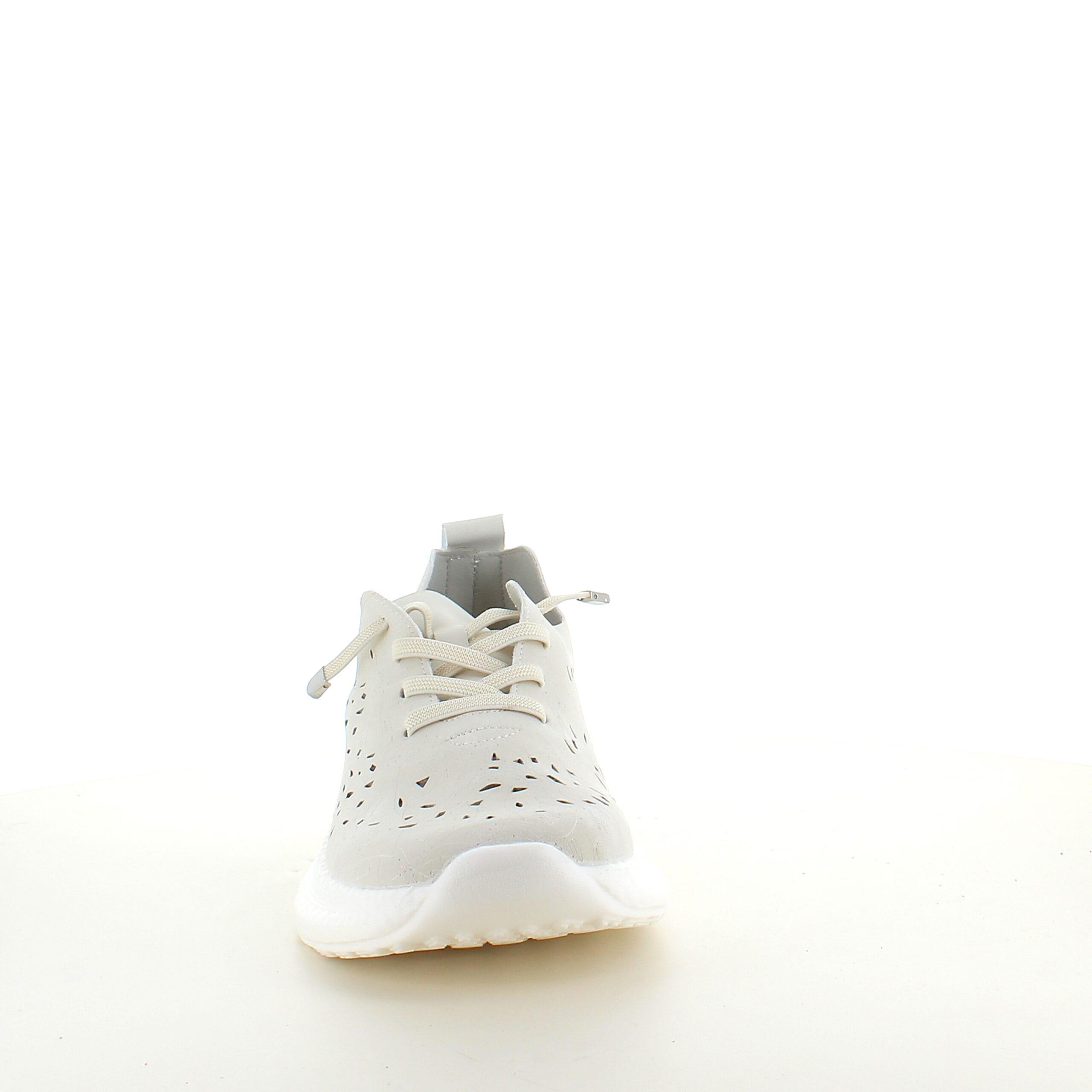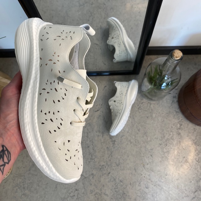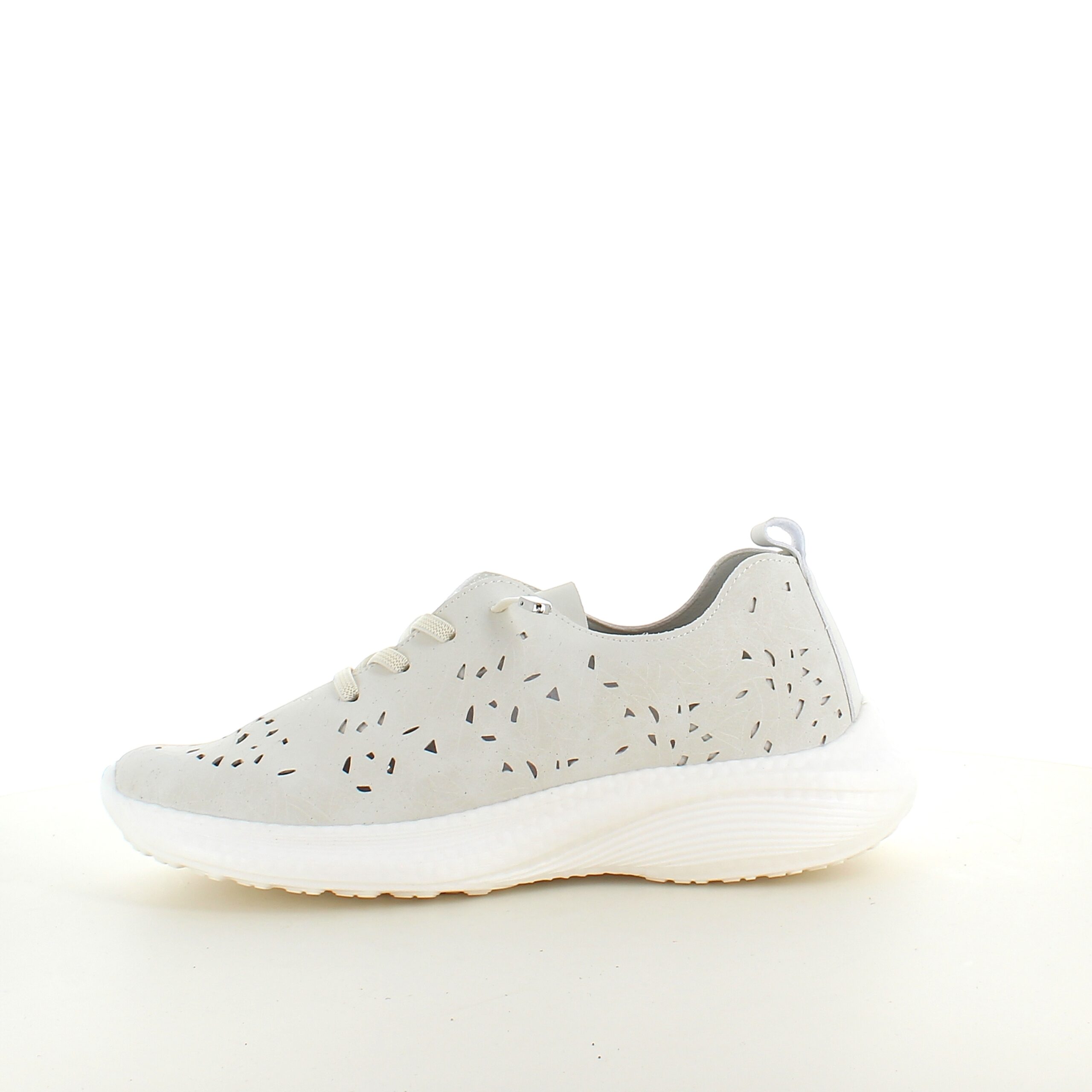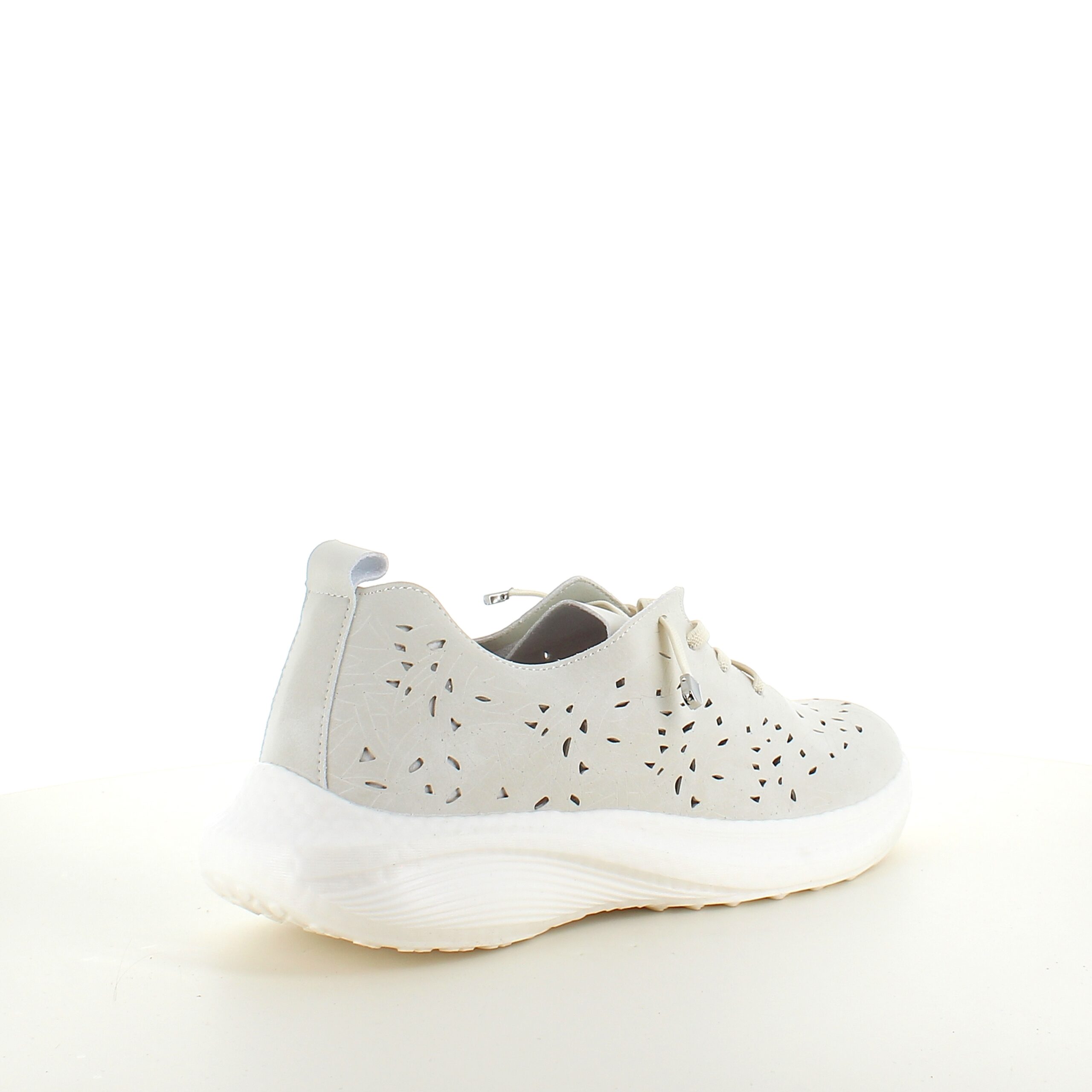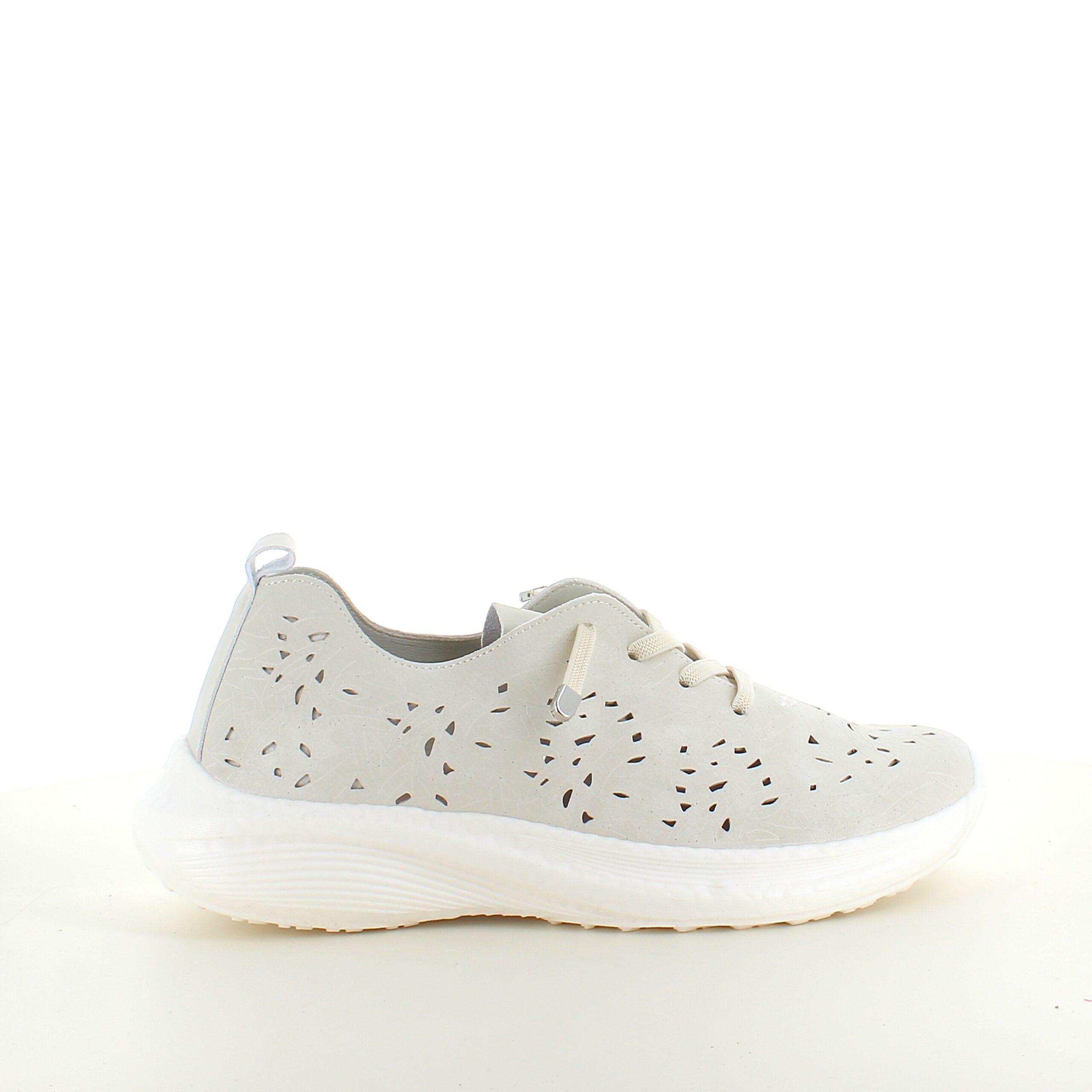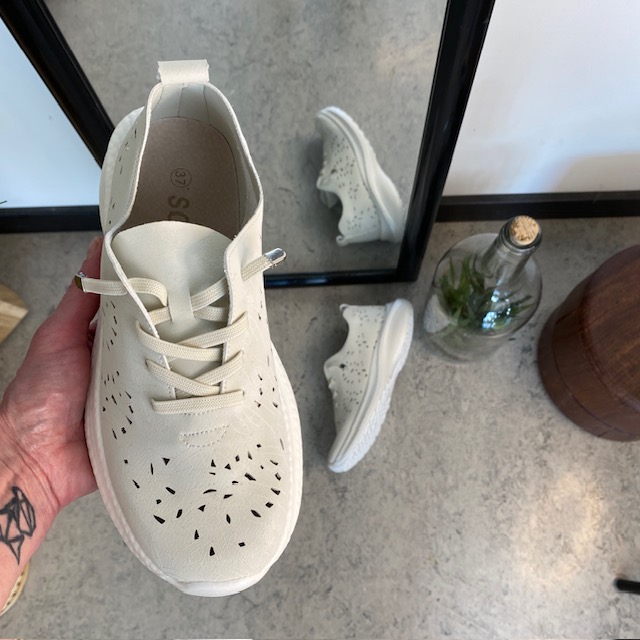 Denne stilrene og ultralette damesko forener moderne design med suveræn komfort – ideel til både arbejde og fritid. Det elegante ydre i cremefarvet kunstlæder prydes af et dekorativt, laserskåret mønster, som giver både et feminint udtryk og øget åndbarhed.