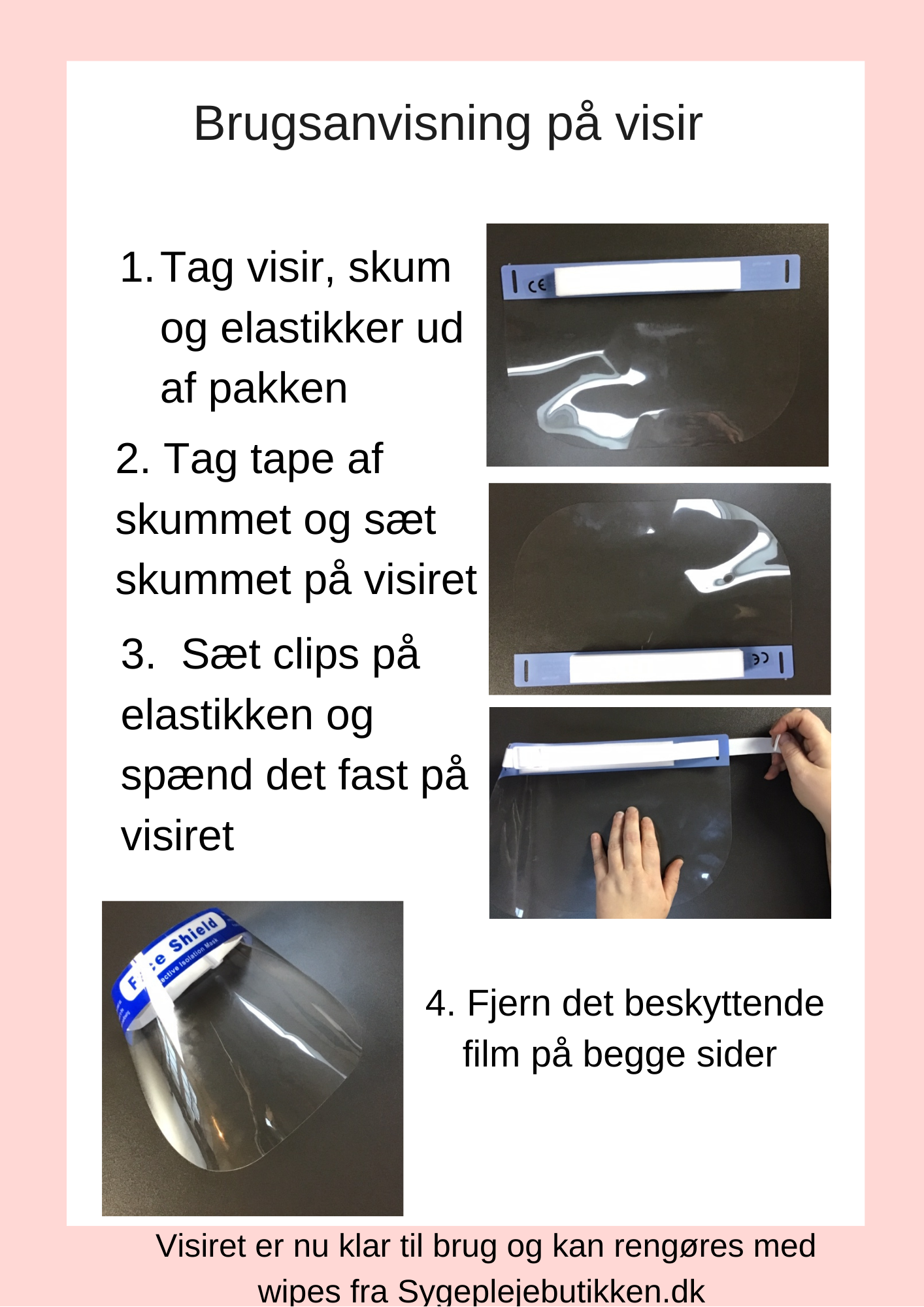 Sundhedsstyrelsen anbefaler, at du efter brug af mundvisiret vasker visiret med en desinficerende serviet. Visiret må IKKE sprittes af da plastikken i visiret ikke kan tåle den høje alkoholprocent der er i spritten.