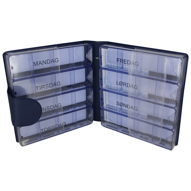 Æsken består af et solidt plastiketui med 8 store doseringsæsker. Syv af æskerne er tydeligt mærket med ugedage, og hver enkelt æske er opdelt i morgen, middag, aften og nat. Det gør det nemt at dosere medicinen korrekt og følge medicinskemaet dag for dag.