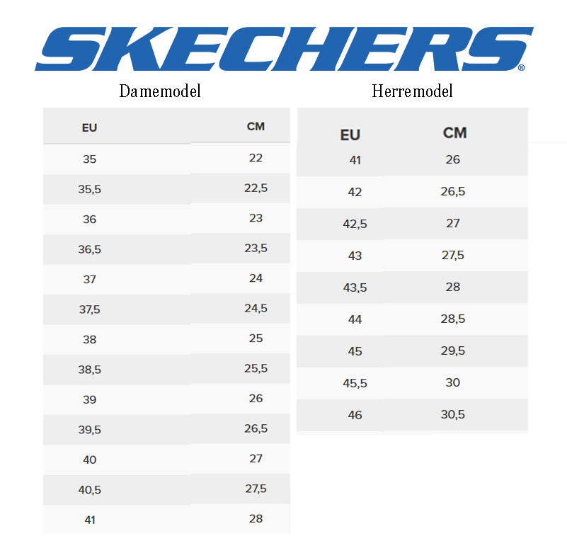 Vi har lavet en Skechers størrelsesguide, så du kan få den rigtige størrelse, når du køber Skechers sko. Du kan selvfølgelig bruge størrelsesguiden til Skechers sandalerne også.